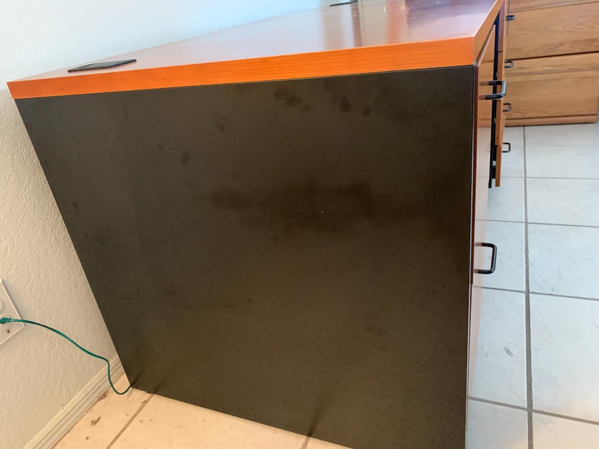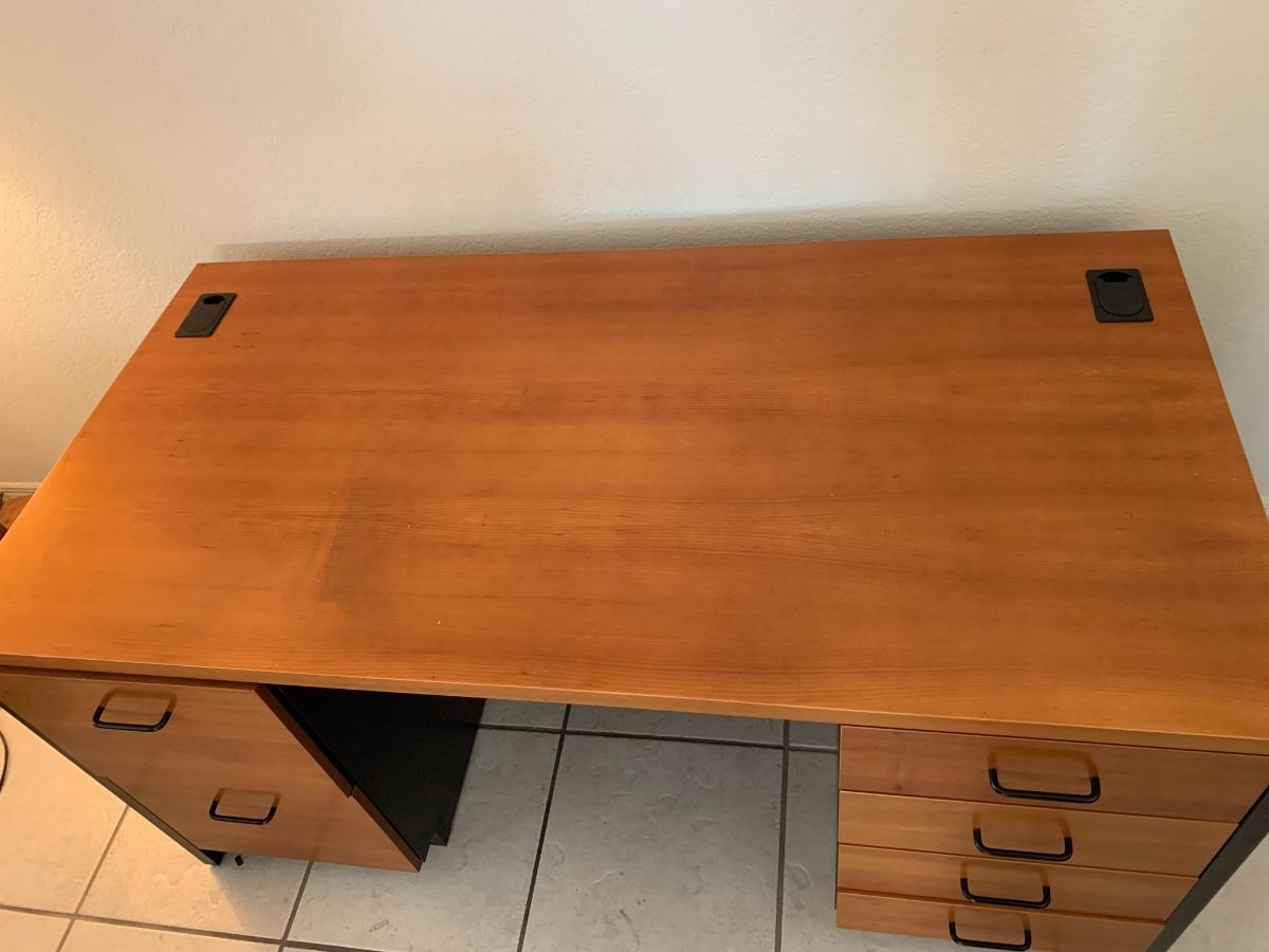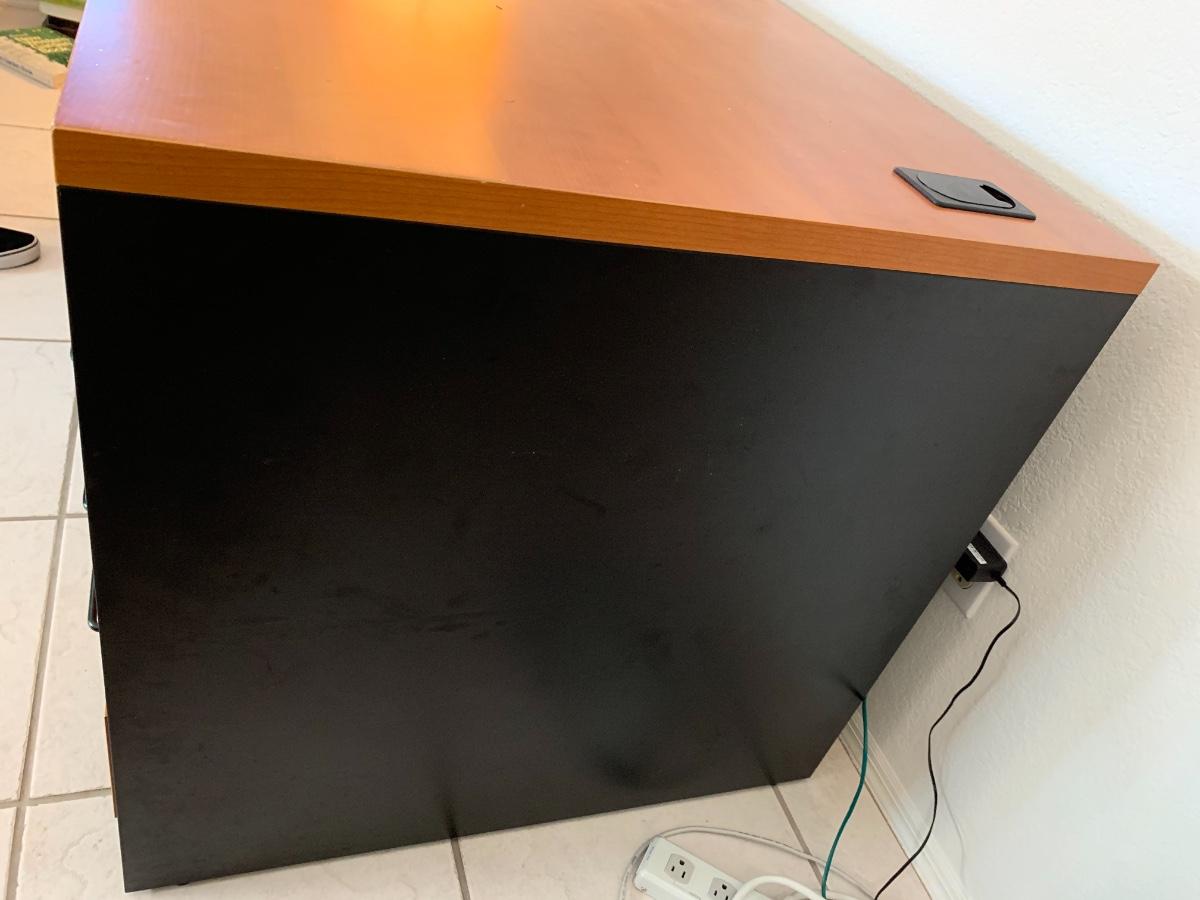 One dark wood and black desk with 4 small drawers on right and two file drawers on the left. Plastic pulls, two holes on the top for electrical cables and cords. In good condition with some minor wear to the top. Drawers slide easily. ( 60 inches in width, 30 inches in depth, 29 inches in height) *wood top with black sides*