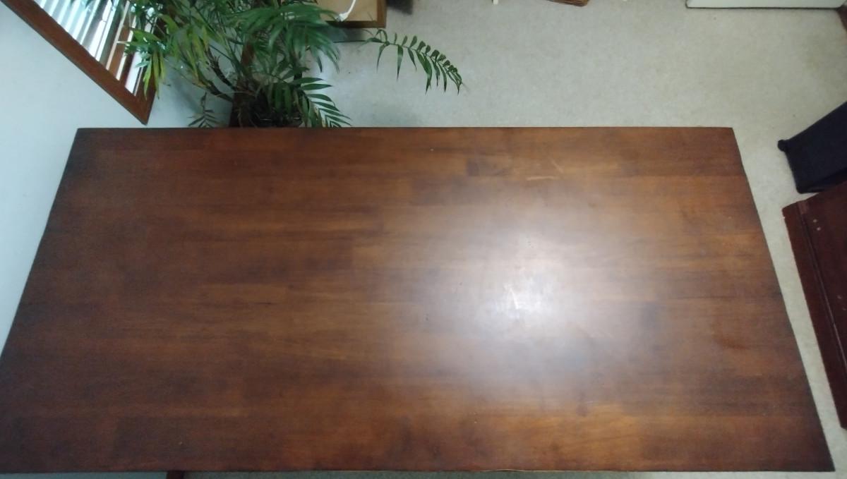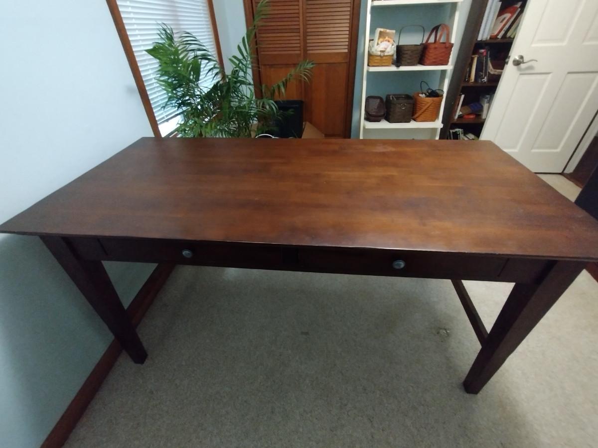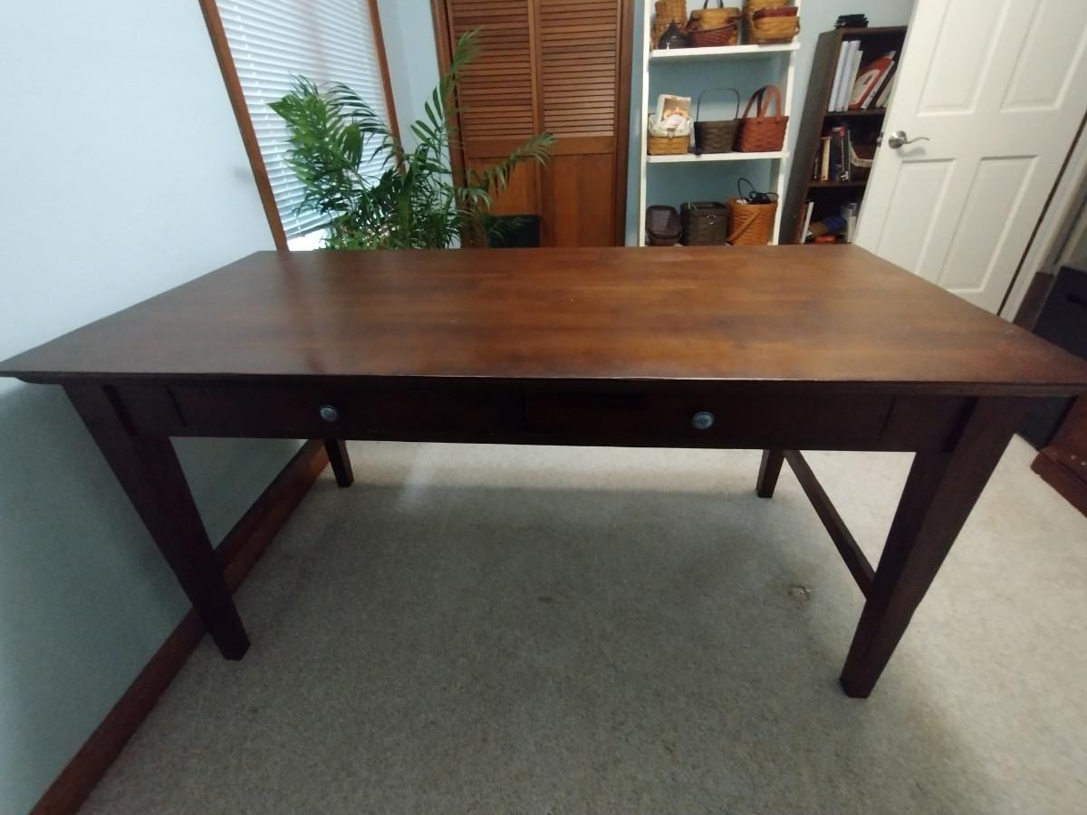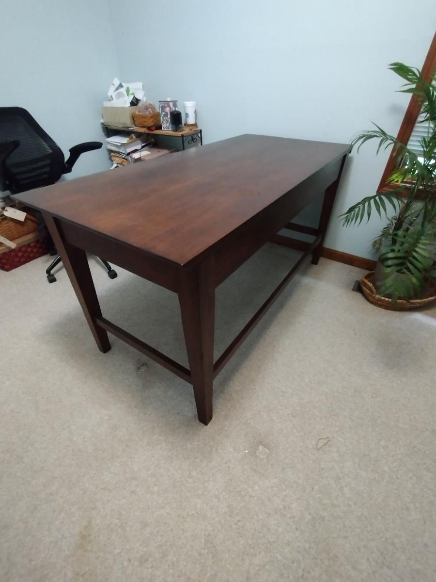 Has a middle drawer. Measures 60"x28"x30". Made by Cost Plus.