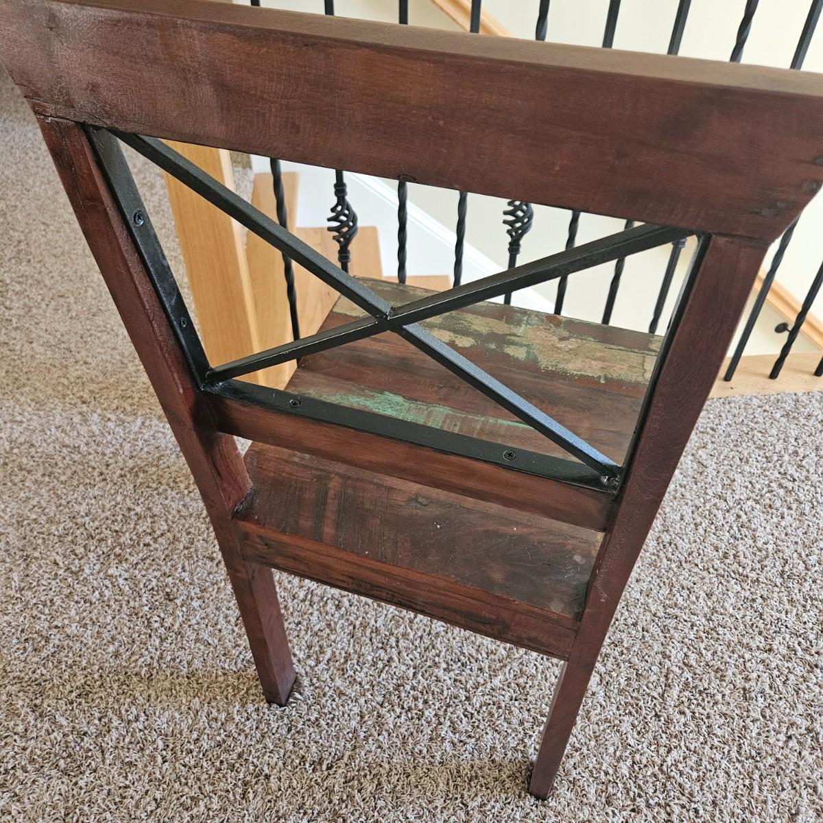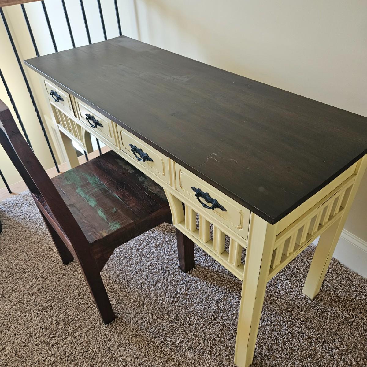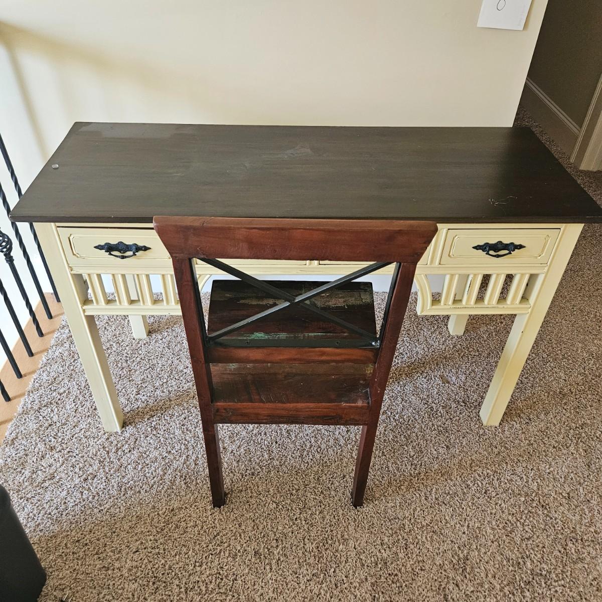 An office desk made of wood with an engineered wood surface with a faux wood veneer. It has four small drawers with black metal pulls and measures approximately 51.5" x 19.5" x 31.5"H. There are some gouges on the desk surface. Also includes a heavy wooden chair with an metal accent on its back. The chair measures approximately 18" x 20" x 37.5"H with a seat height of 18". Local pickup only. Winning bidder must bring assistance to help move and load this item due to its weight and/or size.