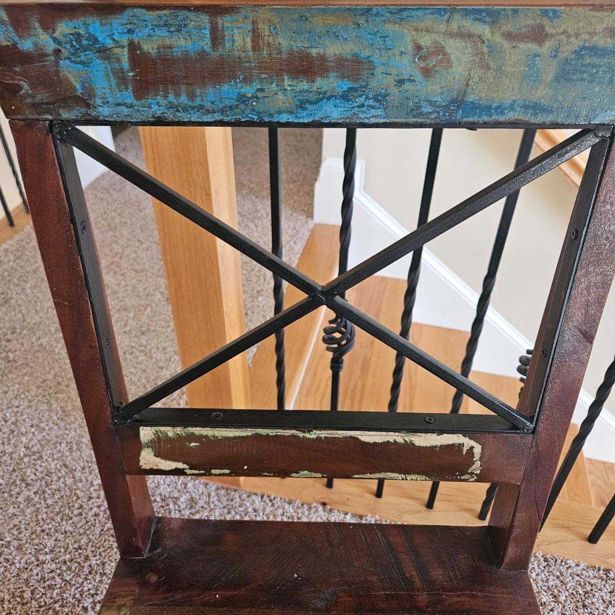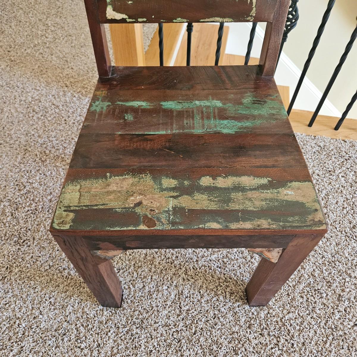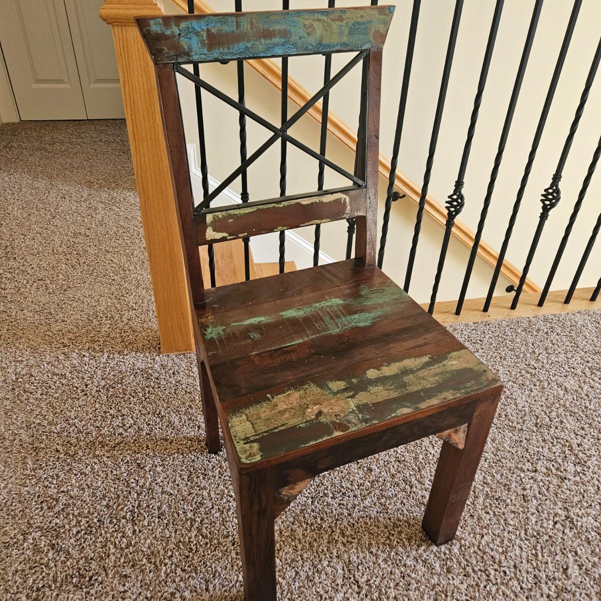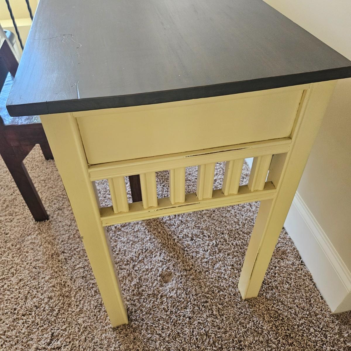 An office desk made of wood with an engineered wood surface with a faux wood veneer. It has four small drawers with black metal pulls and measures approximately 51.5" x 19.5" x 31.5"H. There are some gouges on the desk surface. Also includes a heavy wooden chair with an metal accent on its back. The chair measures approximately 18" x 20" x 37.5"H with a seat height of 18". Local pickup only. Winning bidder must bring assistance to help move and load this item due to its weight and/or size.