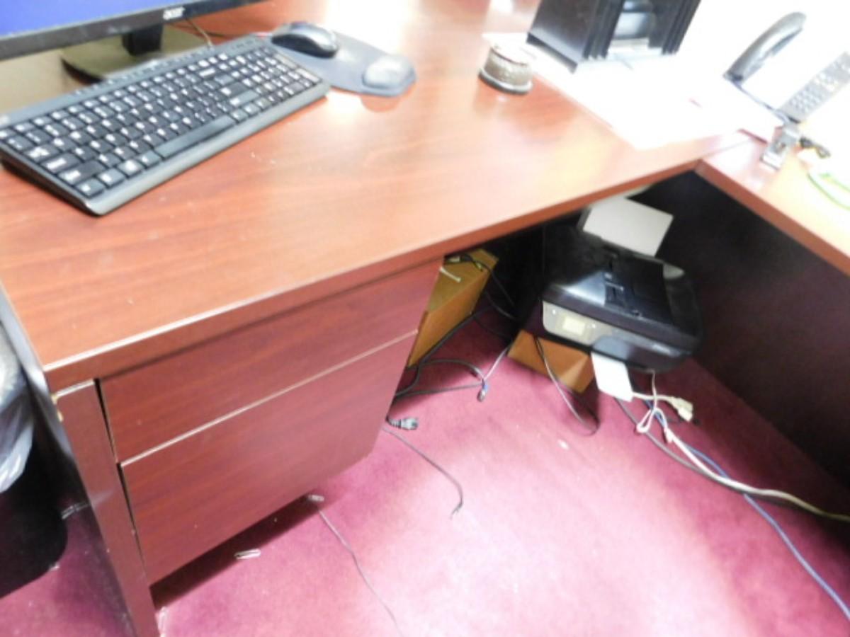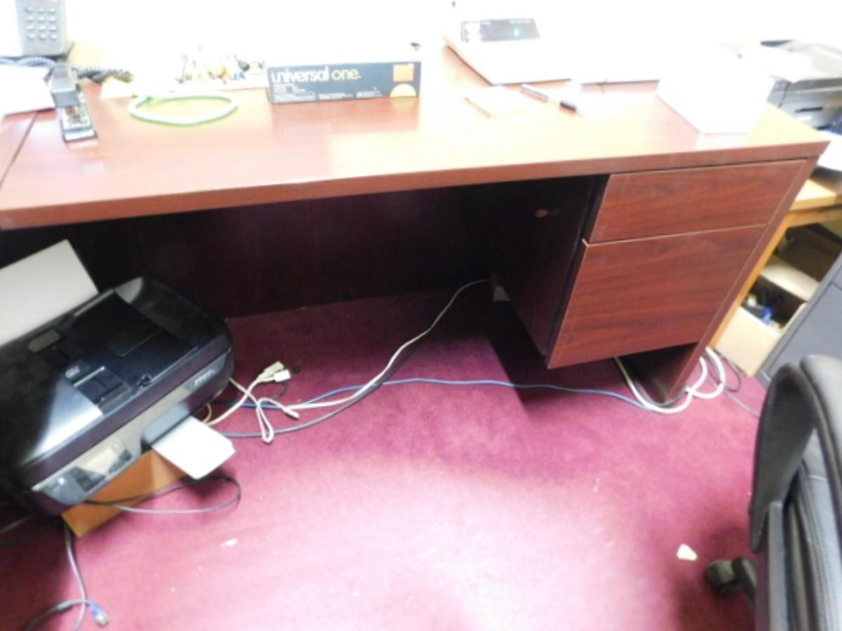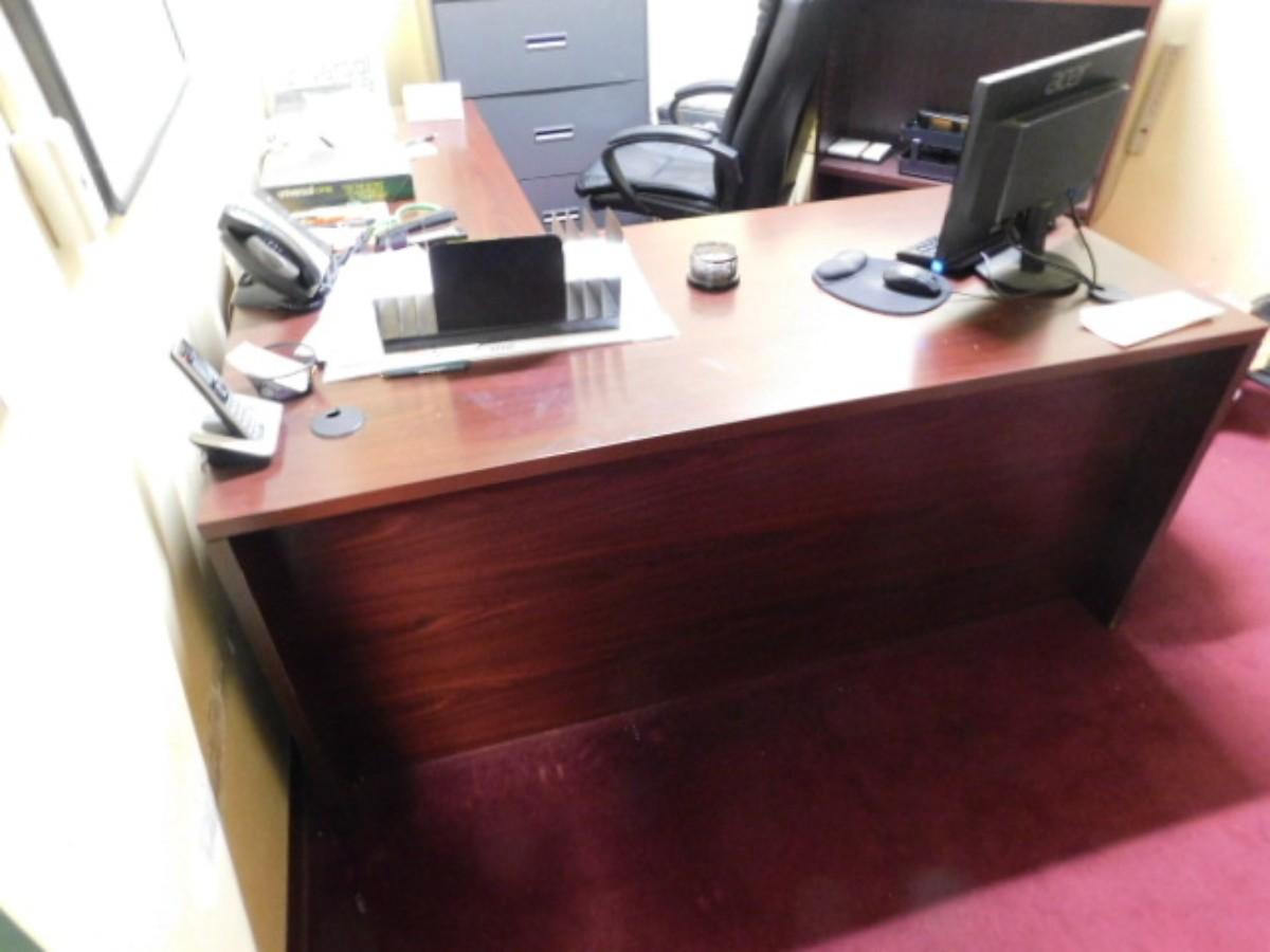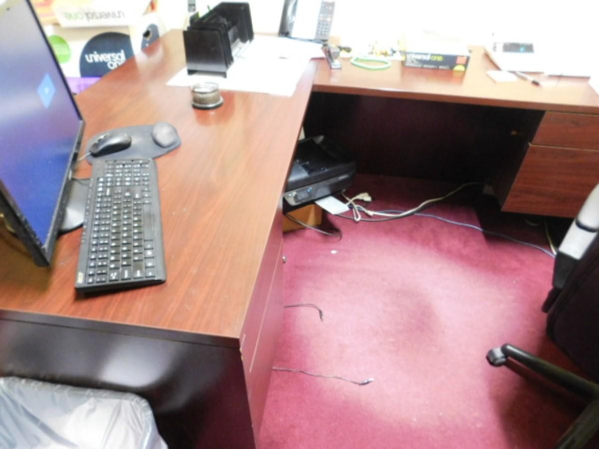 Office Desk and Workstation (No Contents) Expect some wear or scratches to finish. Shipping option available via freight or local mover at Buyer's expense. Buyer must have all shipping scheduled within the stated dates and times of pickup. Recommended local mover is Beaty Bros. Moving 828-201-2982