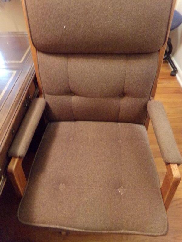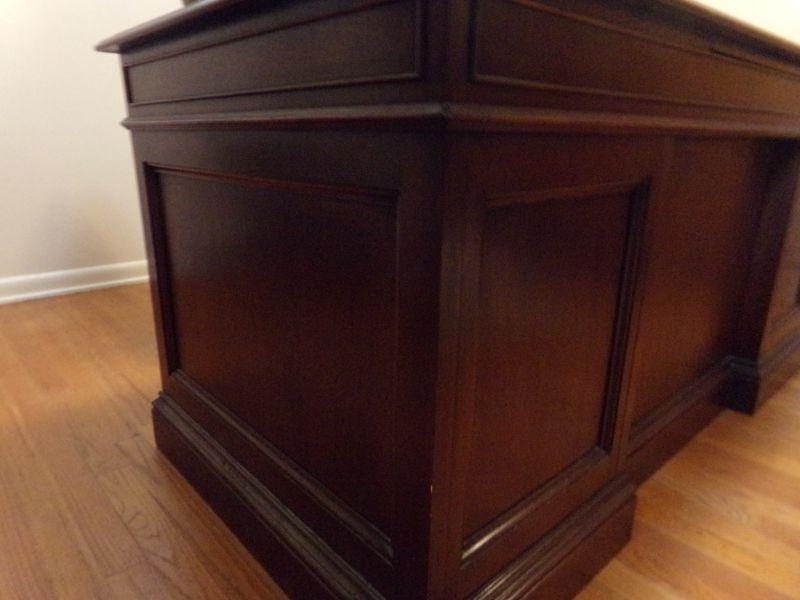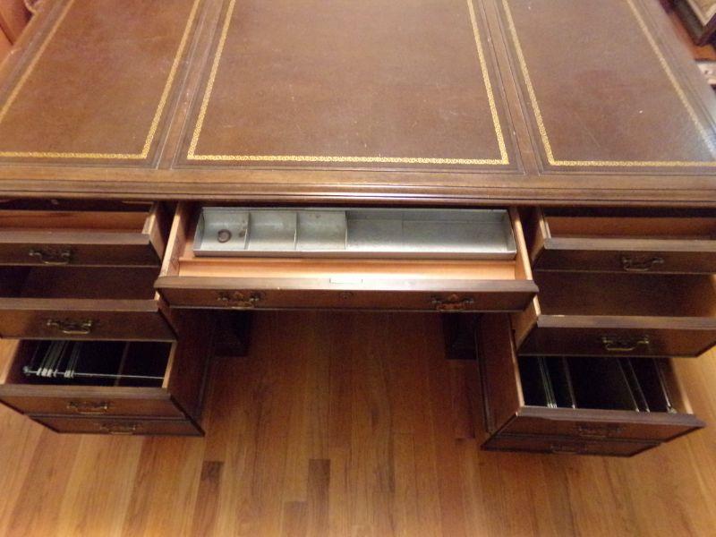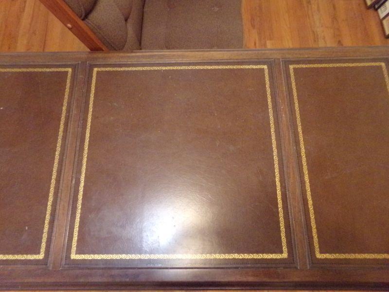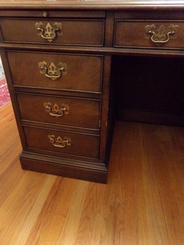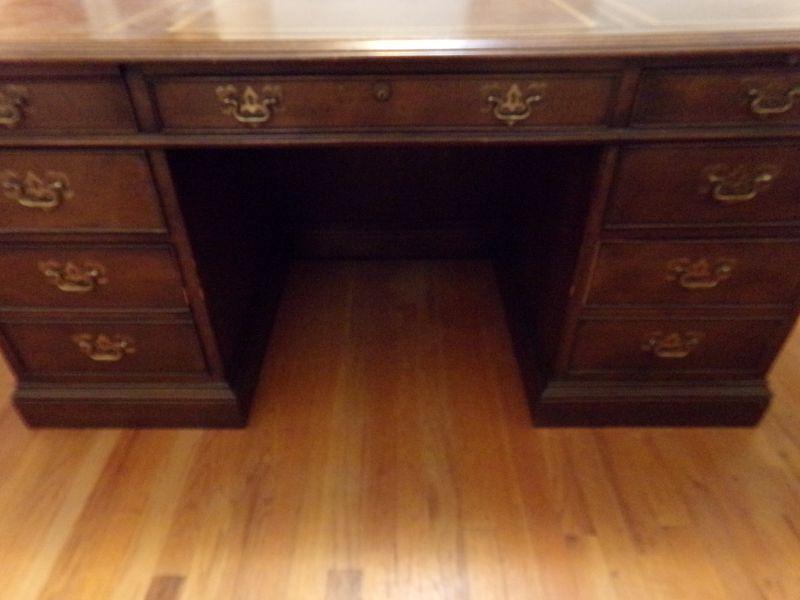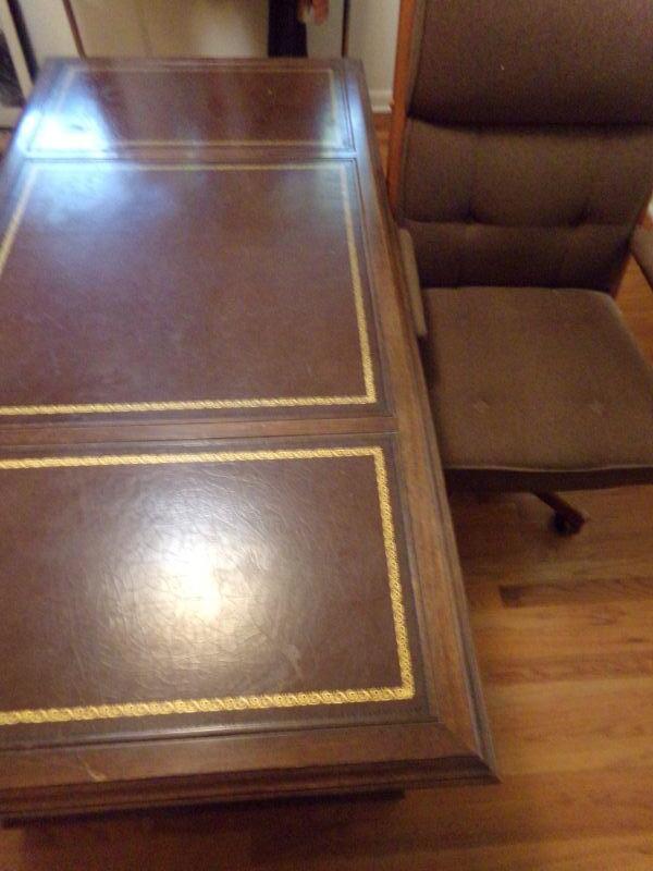 6 DRAWER DESK WITH 3 LEATHER PANELS AND CHAIR. THE DESK DOES HAVE WEAR TO IT AND DOES HAVE A FEW DINGS IN THE WOOD.