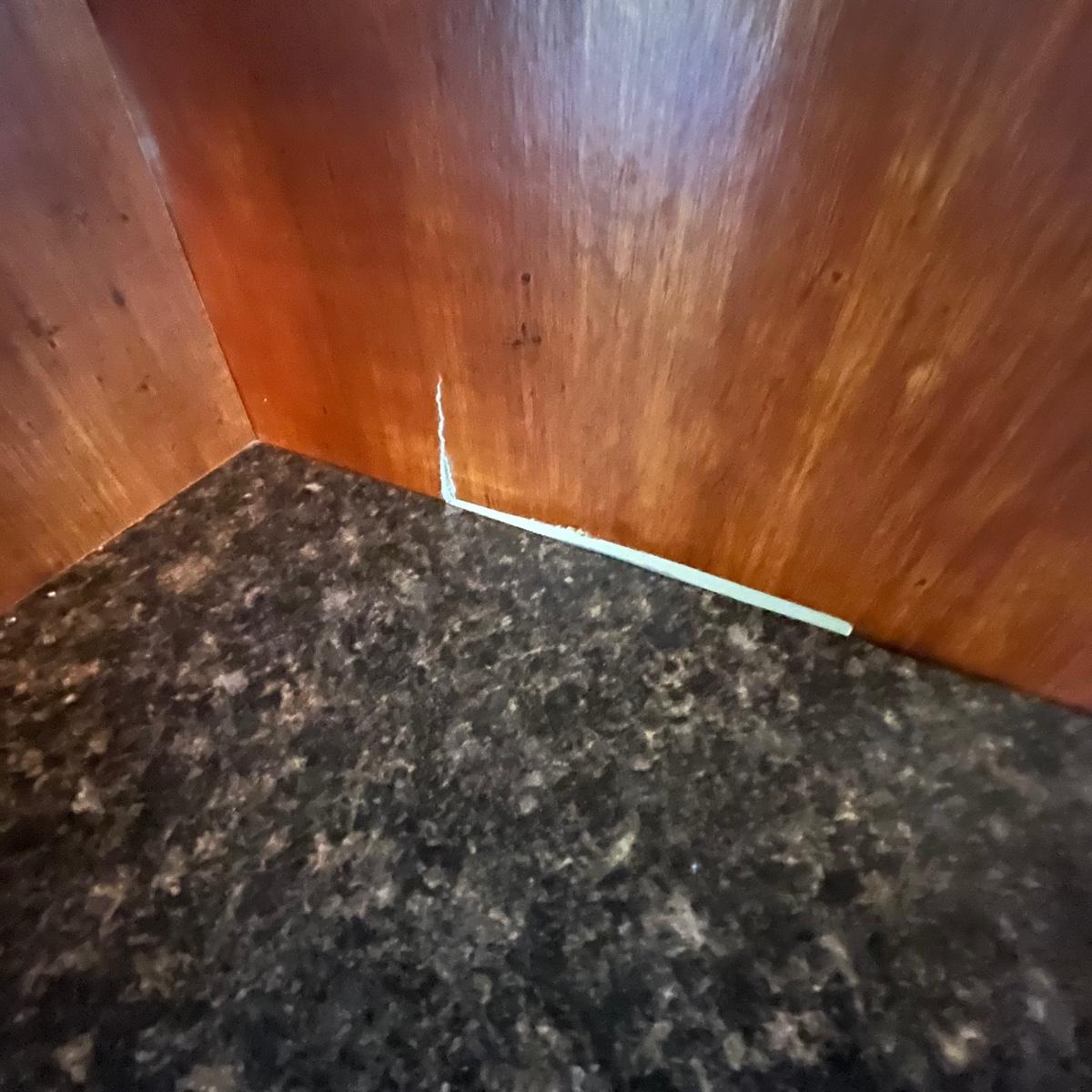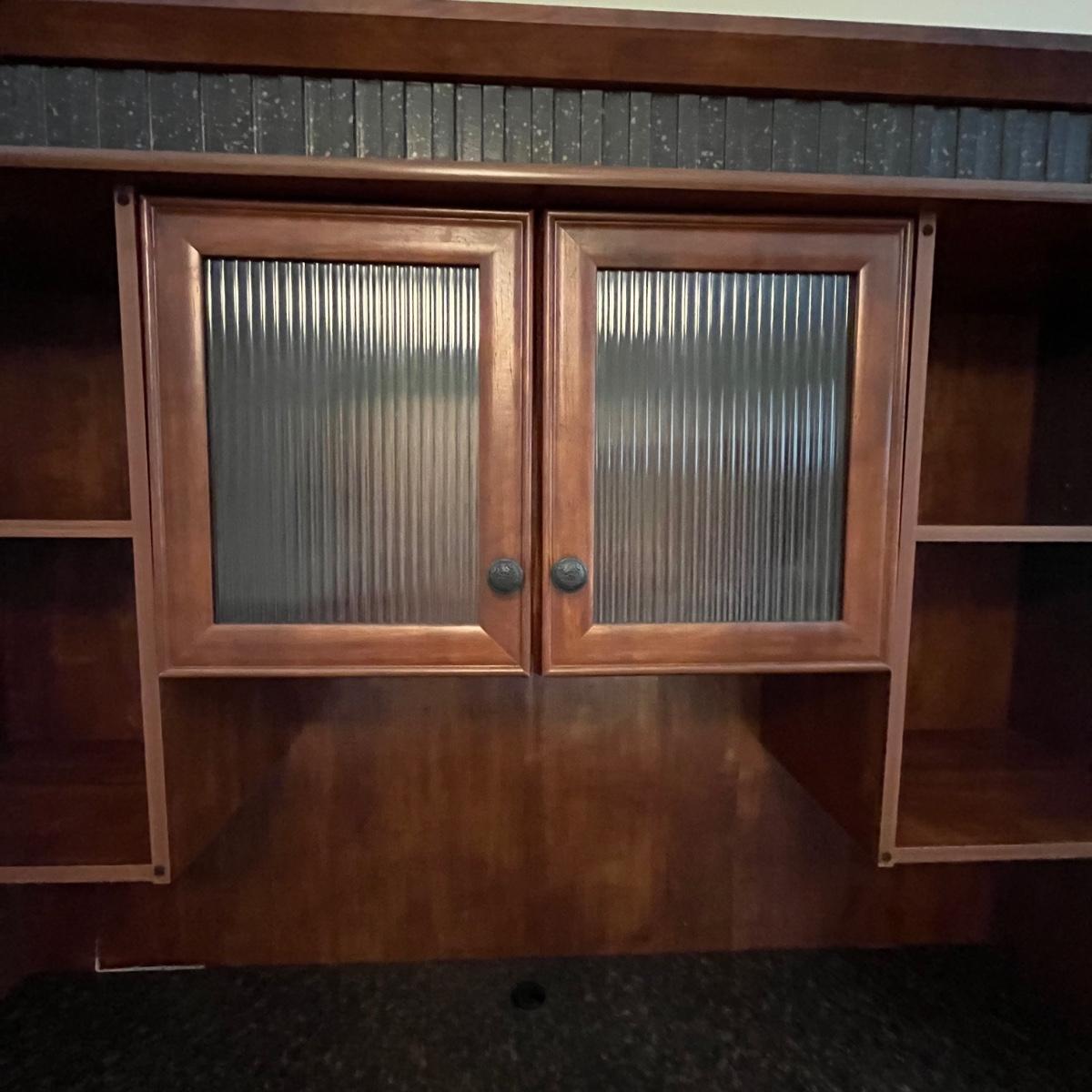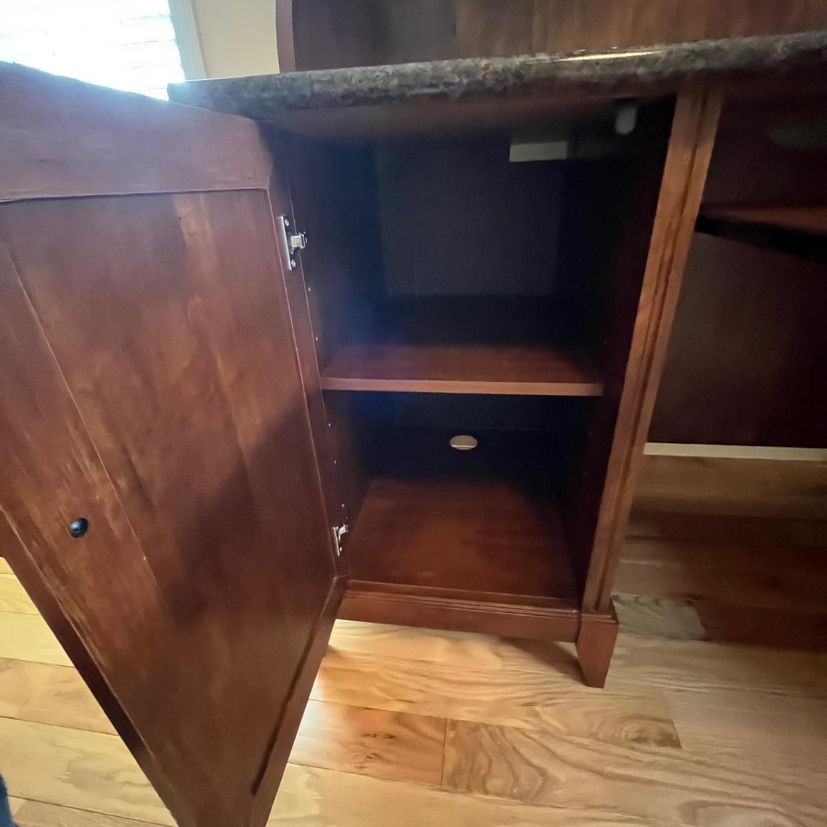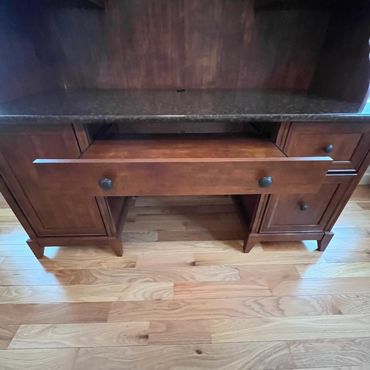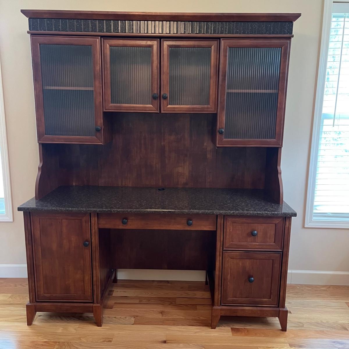 Wood, wood veneer and glass make up this attractive desk with hutch top. Has a granite looking faux finish on the desk top. The computer tray slides out for use. The lower left side has an adjustable shelf. The lower right side has a file drawer and a draw with removable storage trays. The shelves on the top are adjustable as well. Measures 63” x 22” x 74”H. See photos for signs of wear on the veneer.