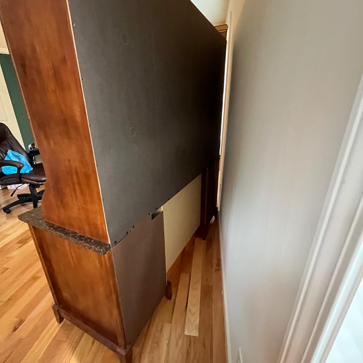 When the paper backing is removed, the hutch top may be removable. Buyer will need to bring a Phillips head screwdriver and possibly a flat head or hammer w tines to remove some small brad nails. Item is on the first floor but you must come up seven steps to get in the house.