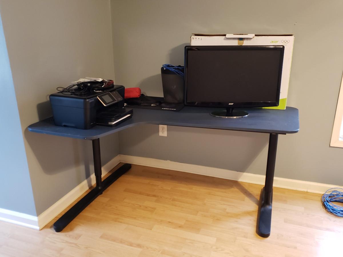 Desk measures 63" wide, 43" deep, and 24" tall. This desk looks like it has the ability for the height to be adjusted. See pictures for details.