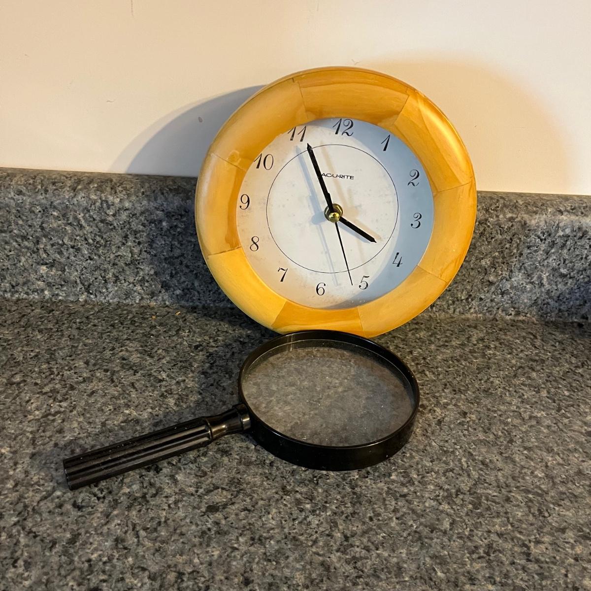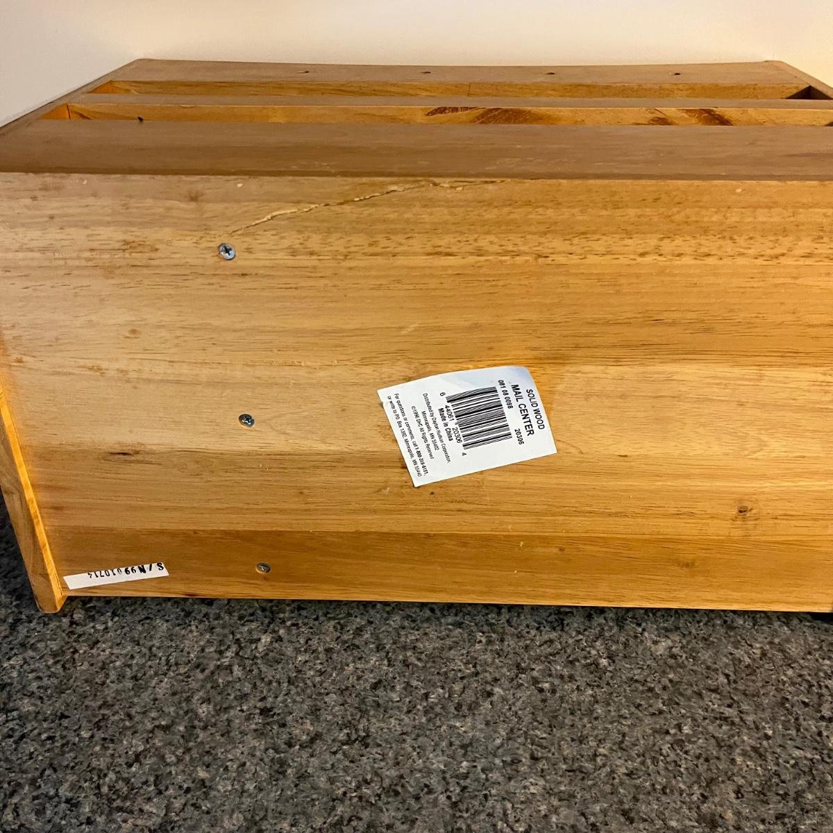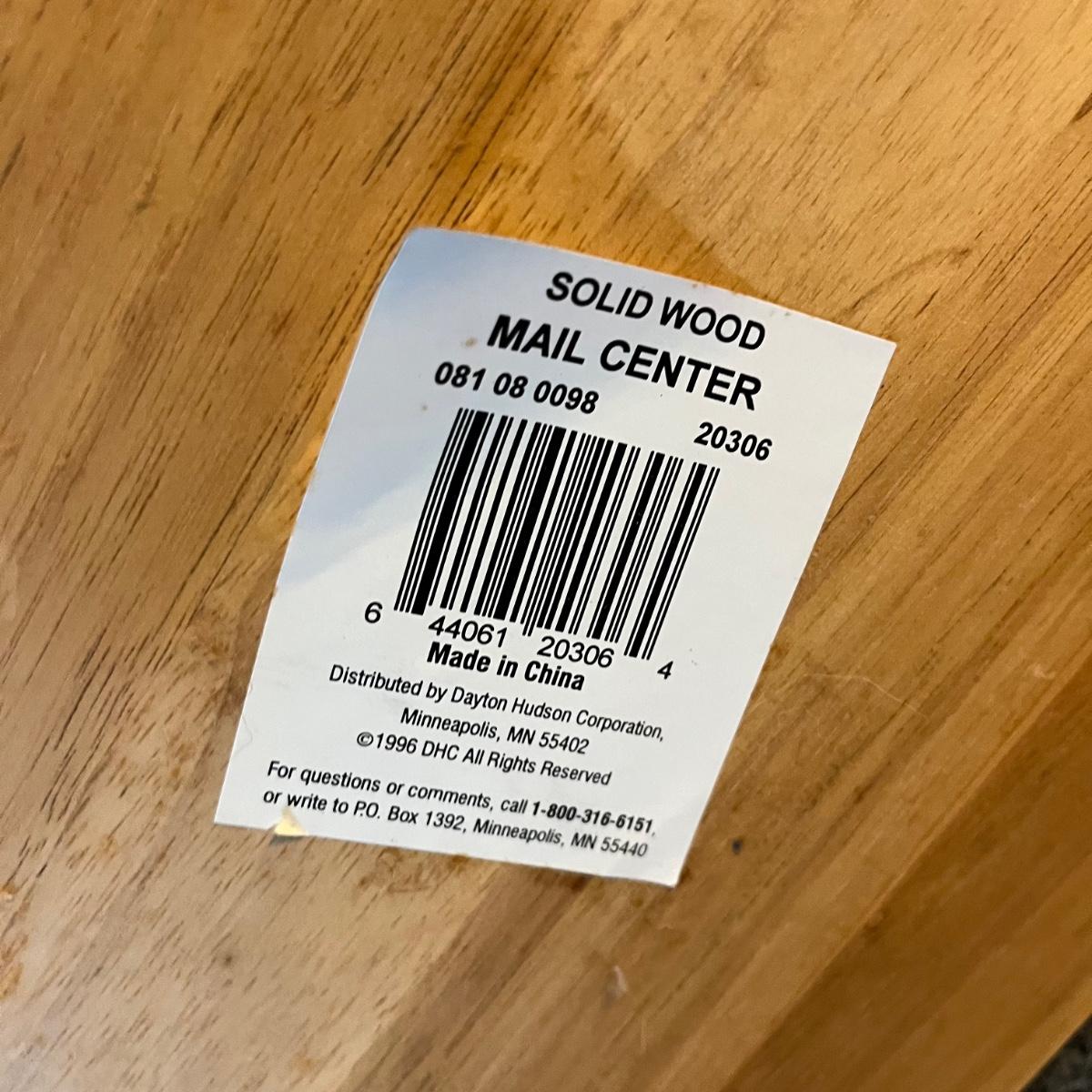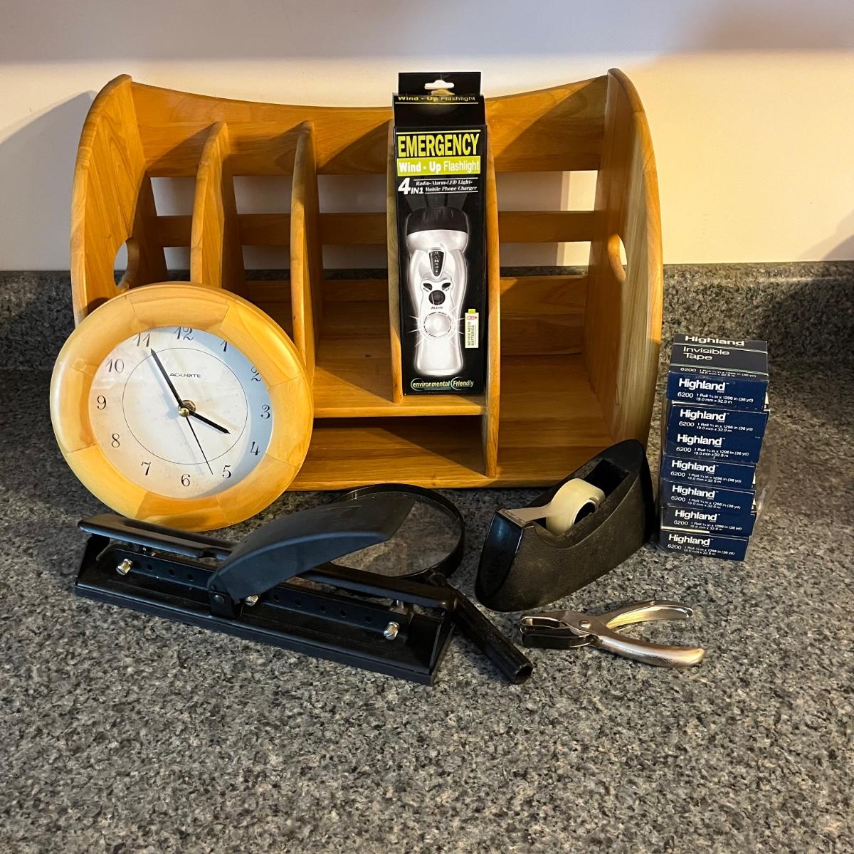 Lot includes wooden mail center, desk tape dispenser with extra tape, magnifying glass, hole punches, clock and a wind up flashlight. Click has no battery. Wind up flashlight worked when tested. Mail center measures 10” x 18” x 11.5”.
