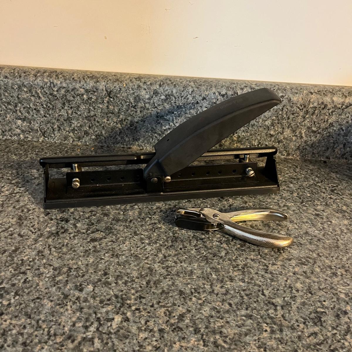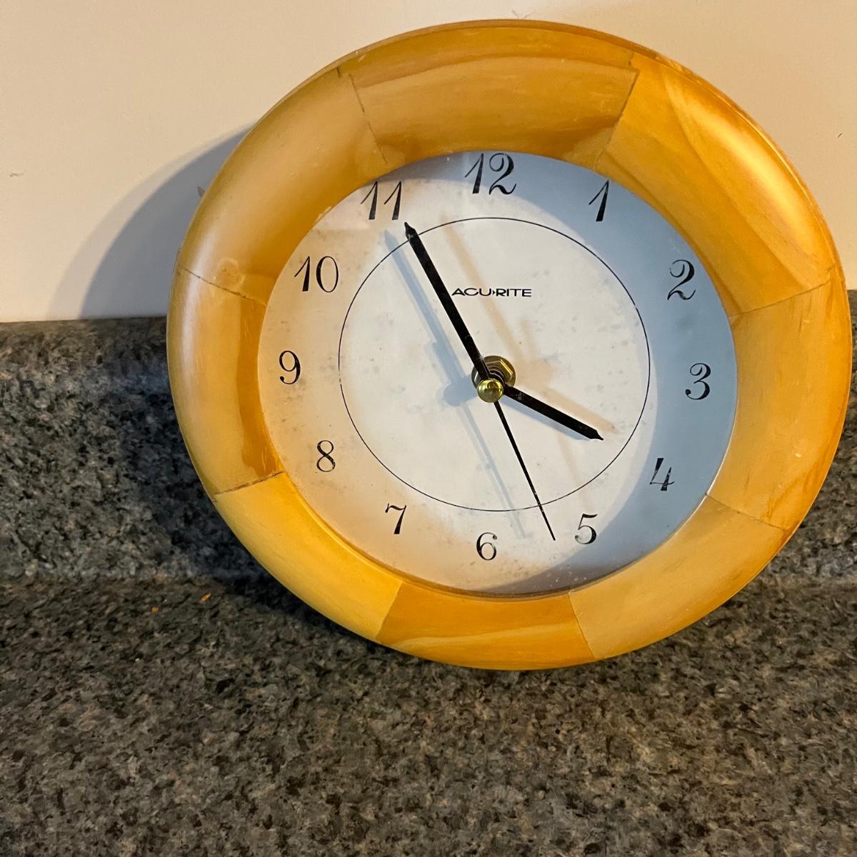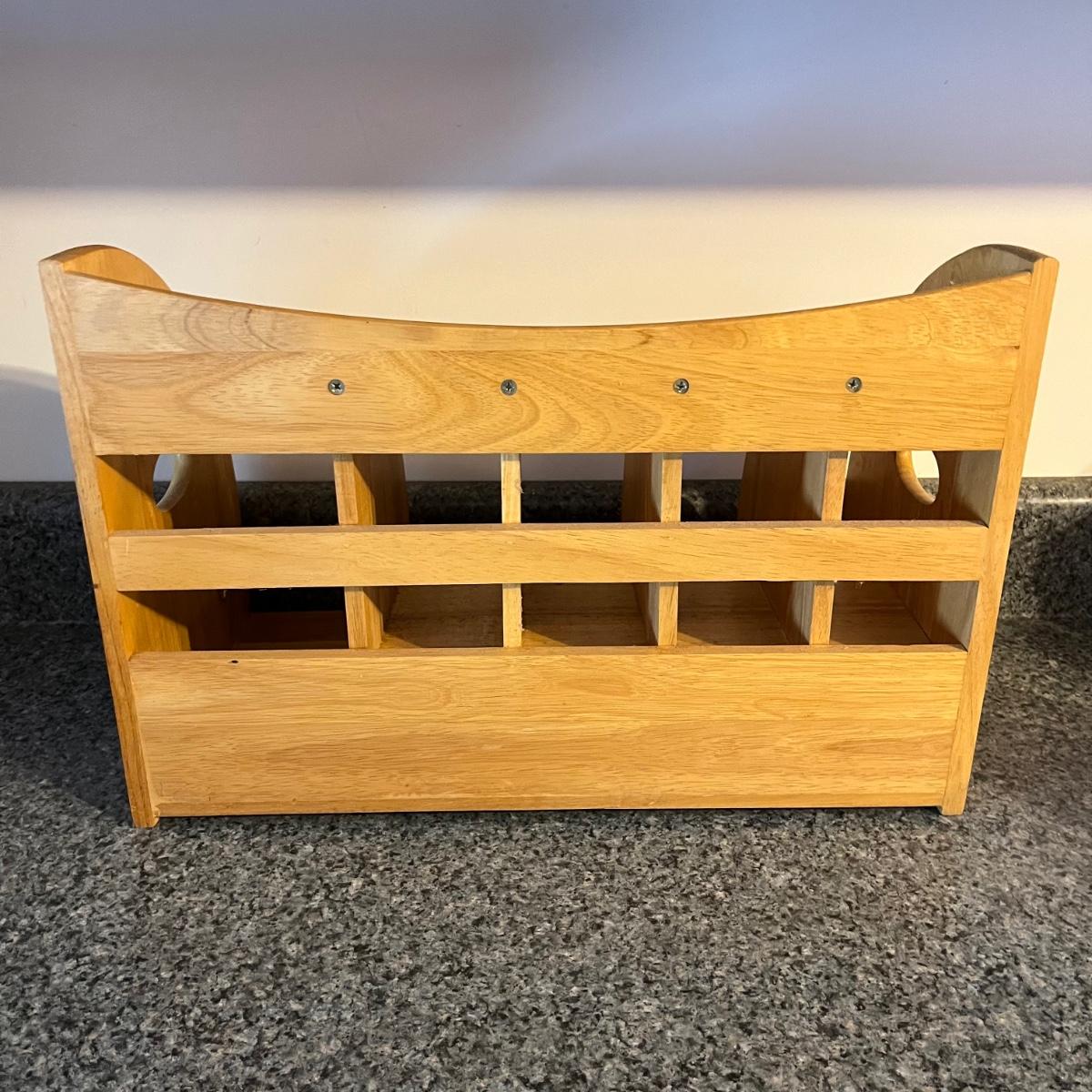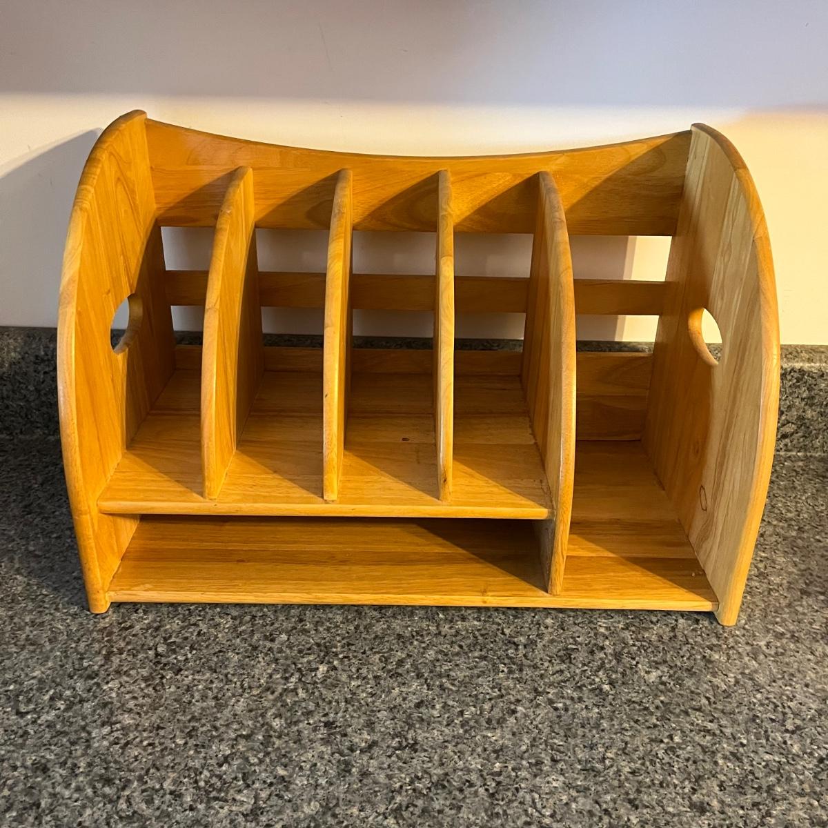 Lot includes wooden mail center, desk tape dispenser with extra tape, magnifying glass, hole punches, clock and a wind up flashlight. Click has no battery. Wind up flashlight worked when tested. Mail center measures 10” x 18” x 11.5”.
