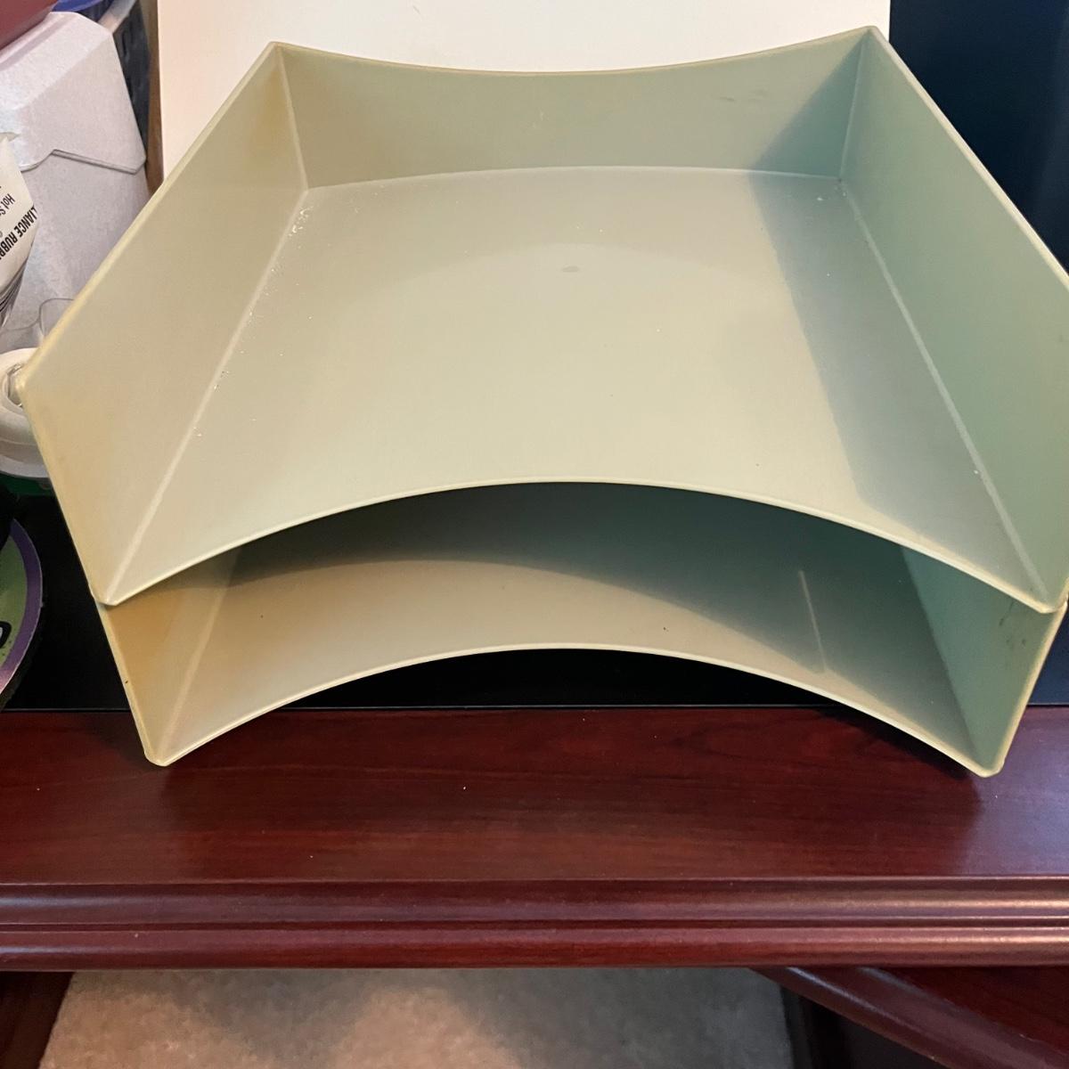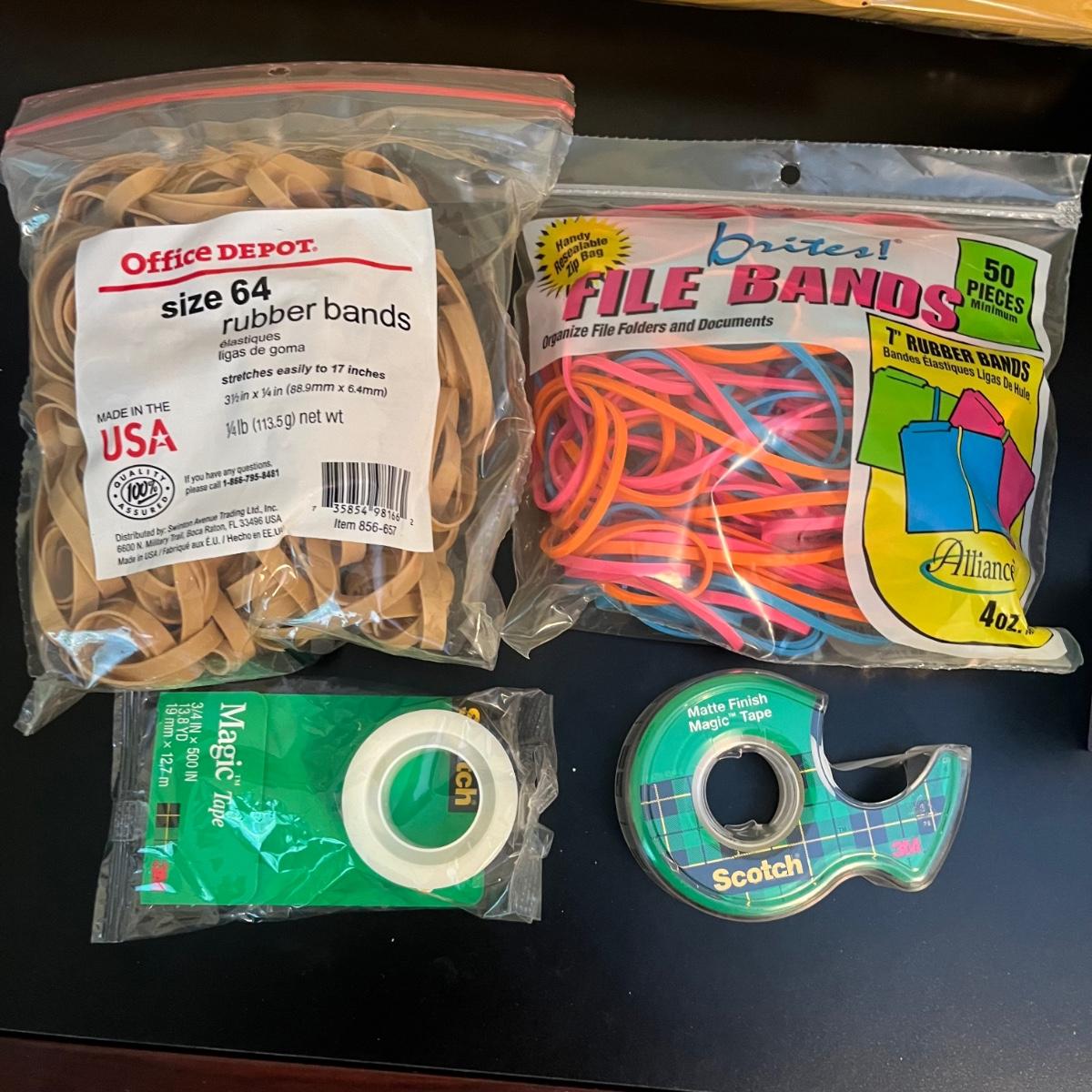 Lot includes rubber bands, lap desk, triple hole punch, Classic Cut guillotine, Canon printing calculator, plastic baskets, paper trays, bubble mailers, book ends, tape dispenser, stapler and more.
