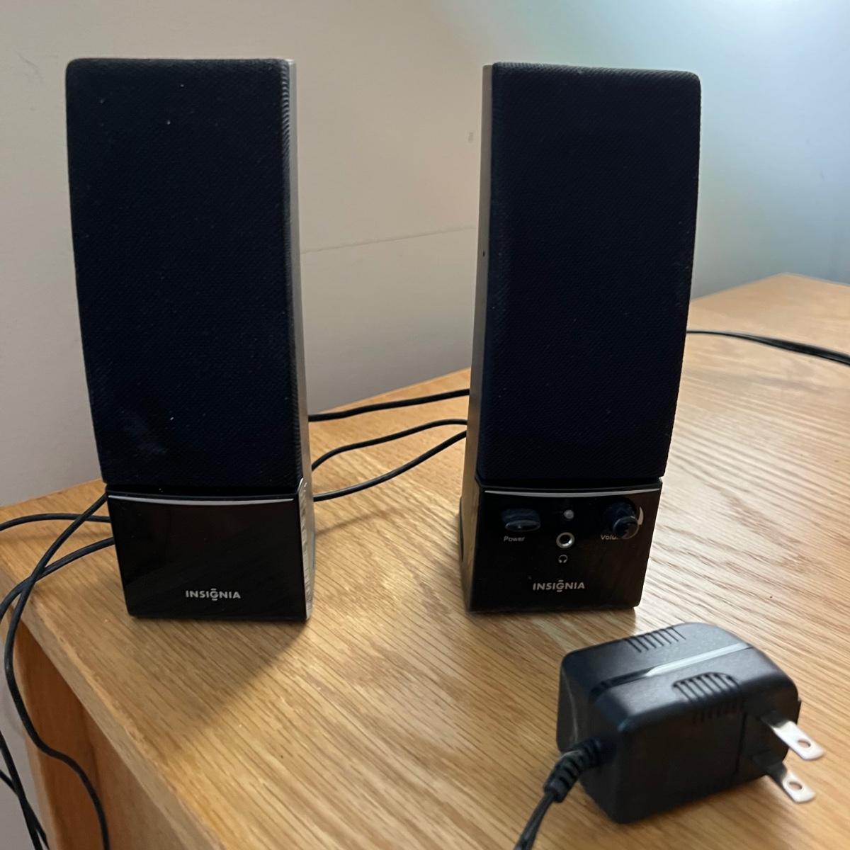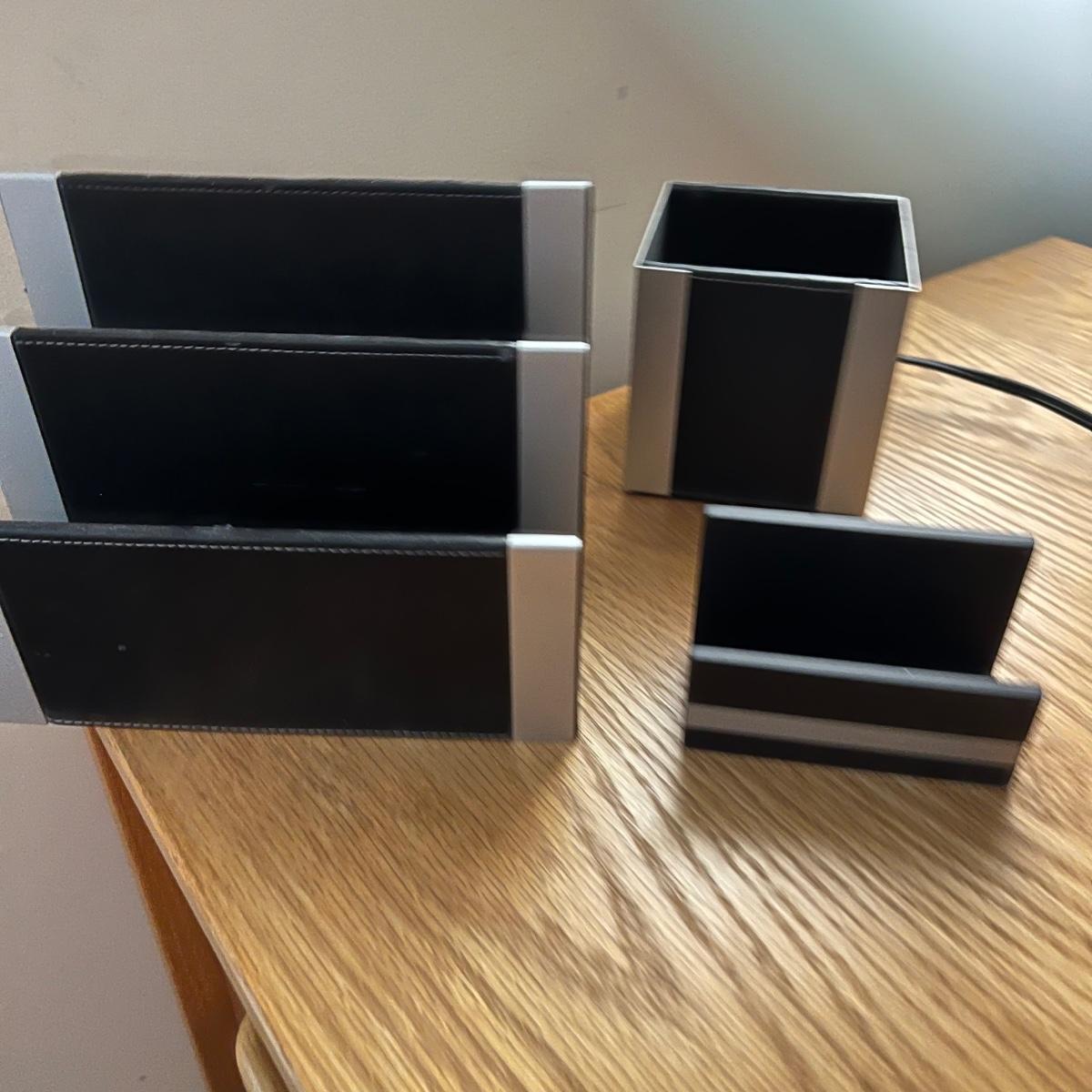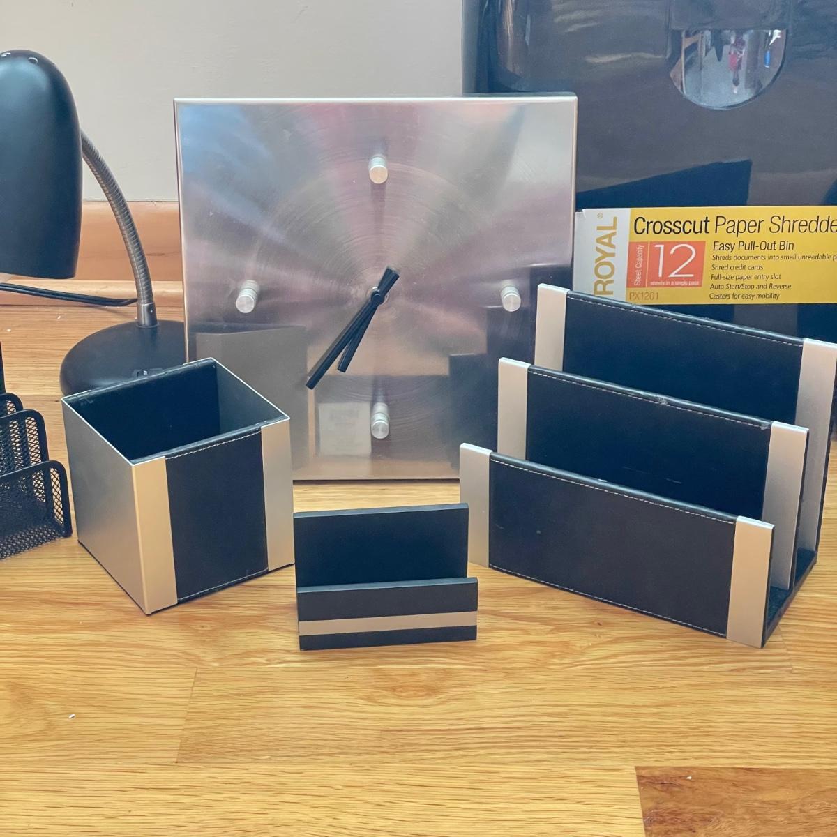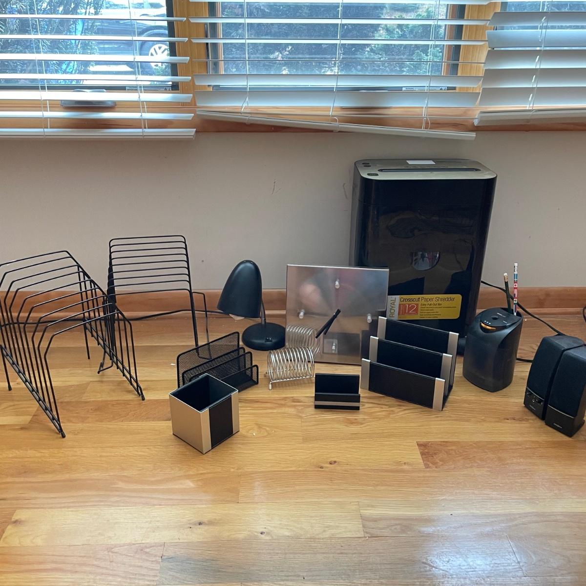 Everything you need for a well equipped home office. Paper shredder, wall clock, electric pencil sharpener, file holders, desk light, inbox, PC speakers and desk set. The Insignia speakers are 2.25” x 3.5”D x 7”H. Lamp, shredder, pencil sharpener powered on when plugged in, the speakers and clock (needs one AA battery) were not tested. Local pick up only.