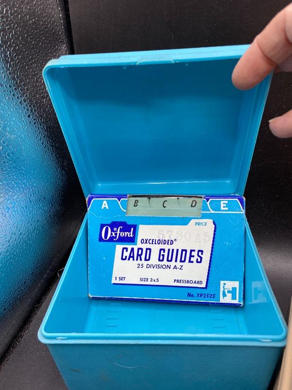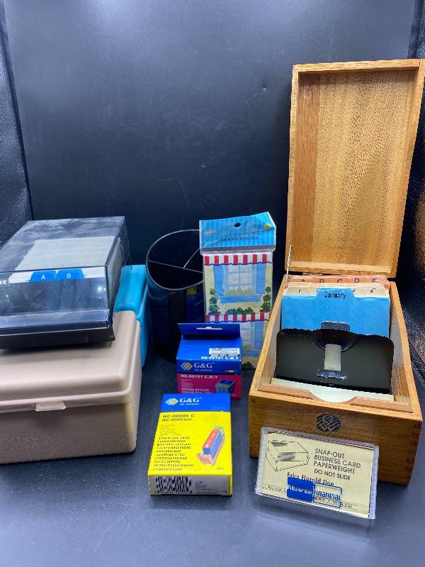Lot of office file cards, rolodex, and other desk supplies.