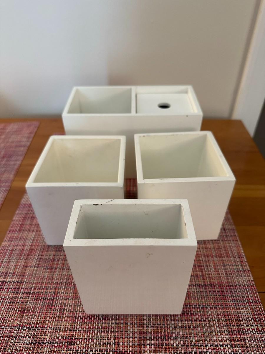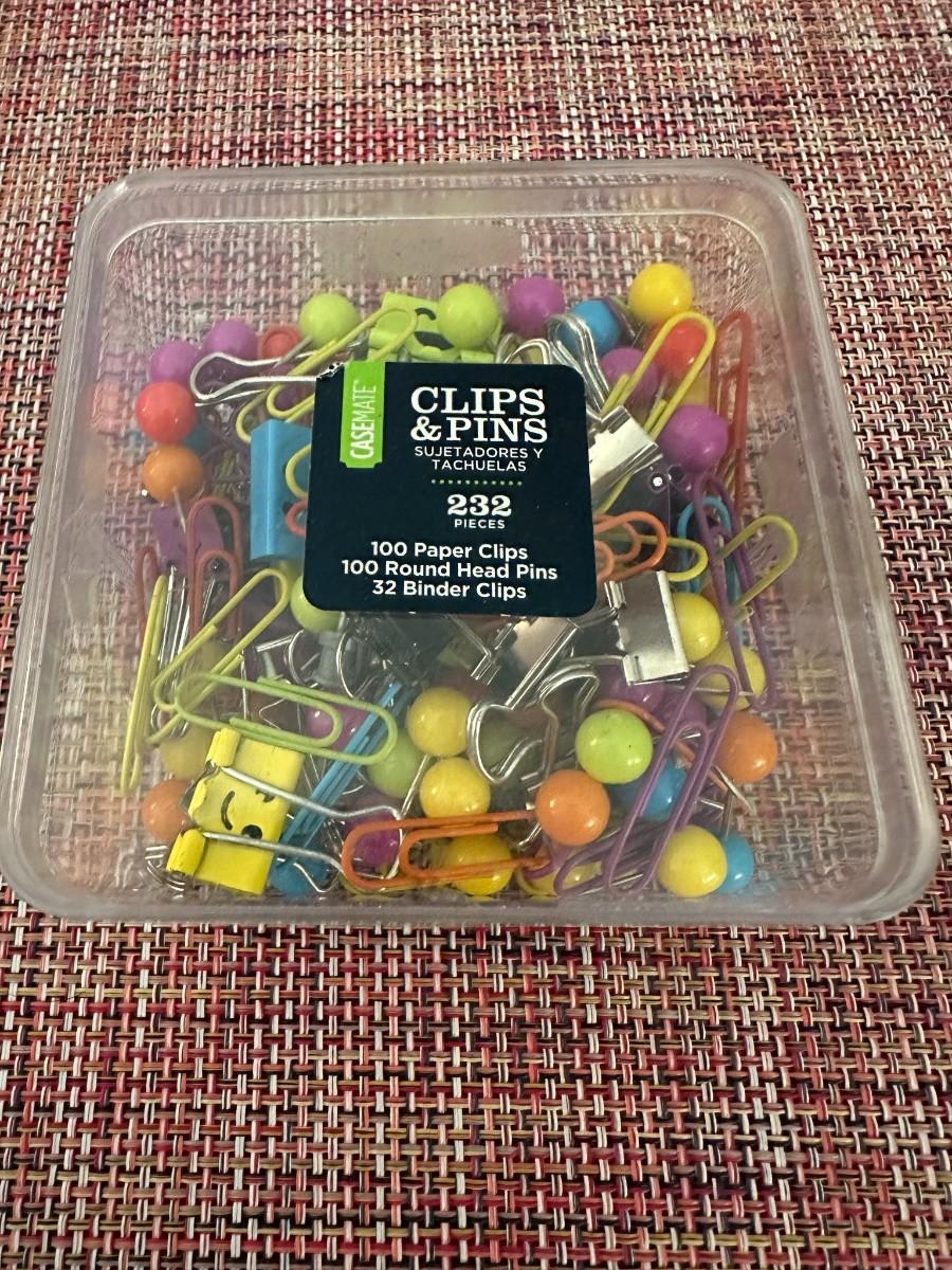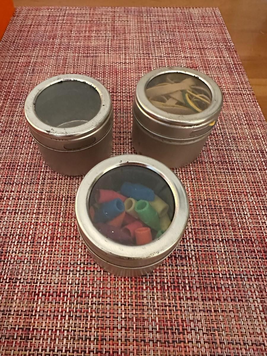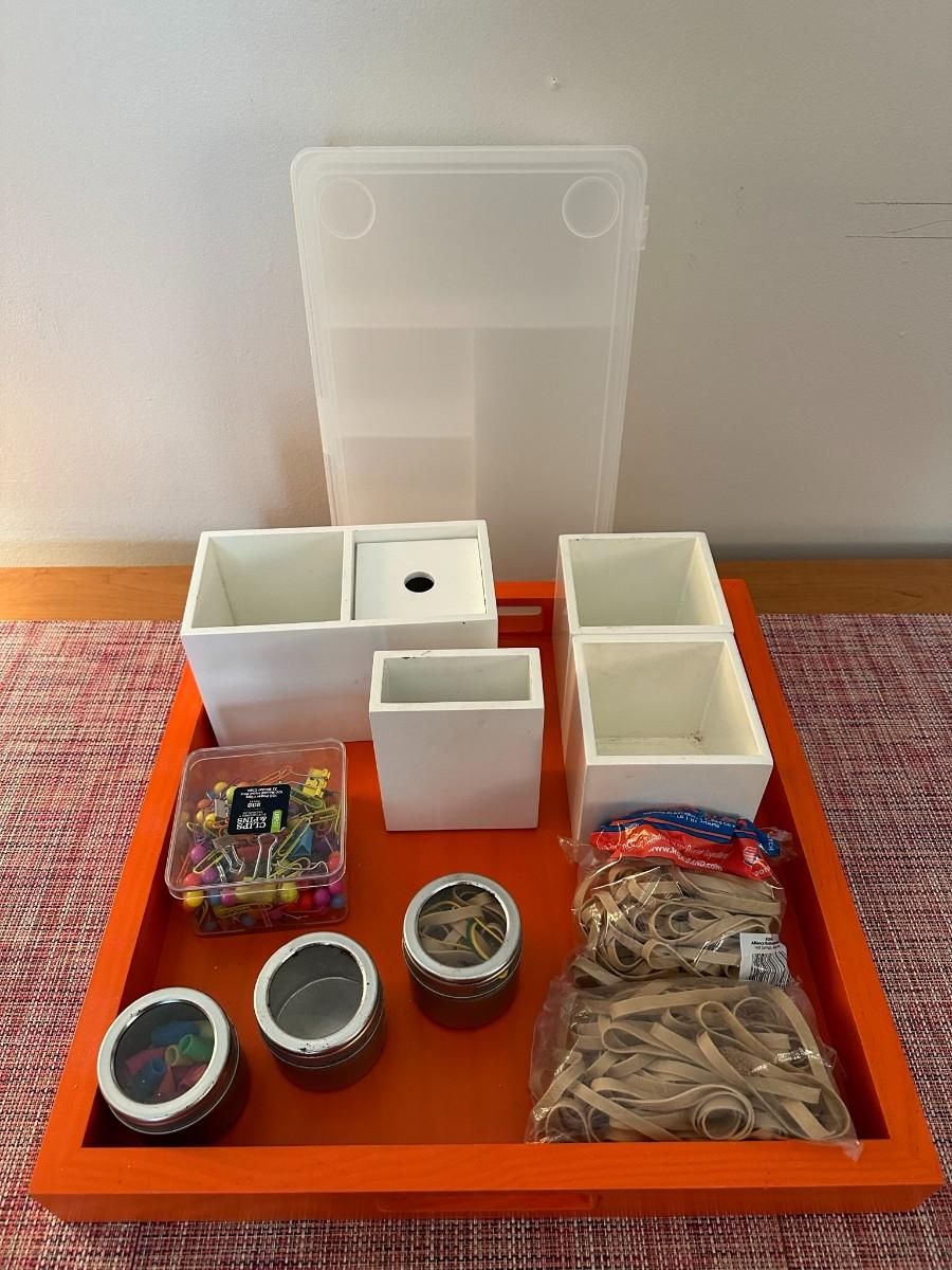 Crate & Barrel 16 x 16 Tray, 4 white pen/pencil holders, bin with push pins and per clips, rubberbands, silver magnetic containers & organizing box