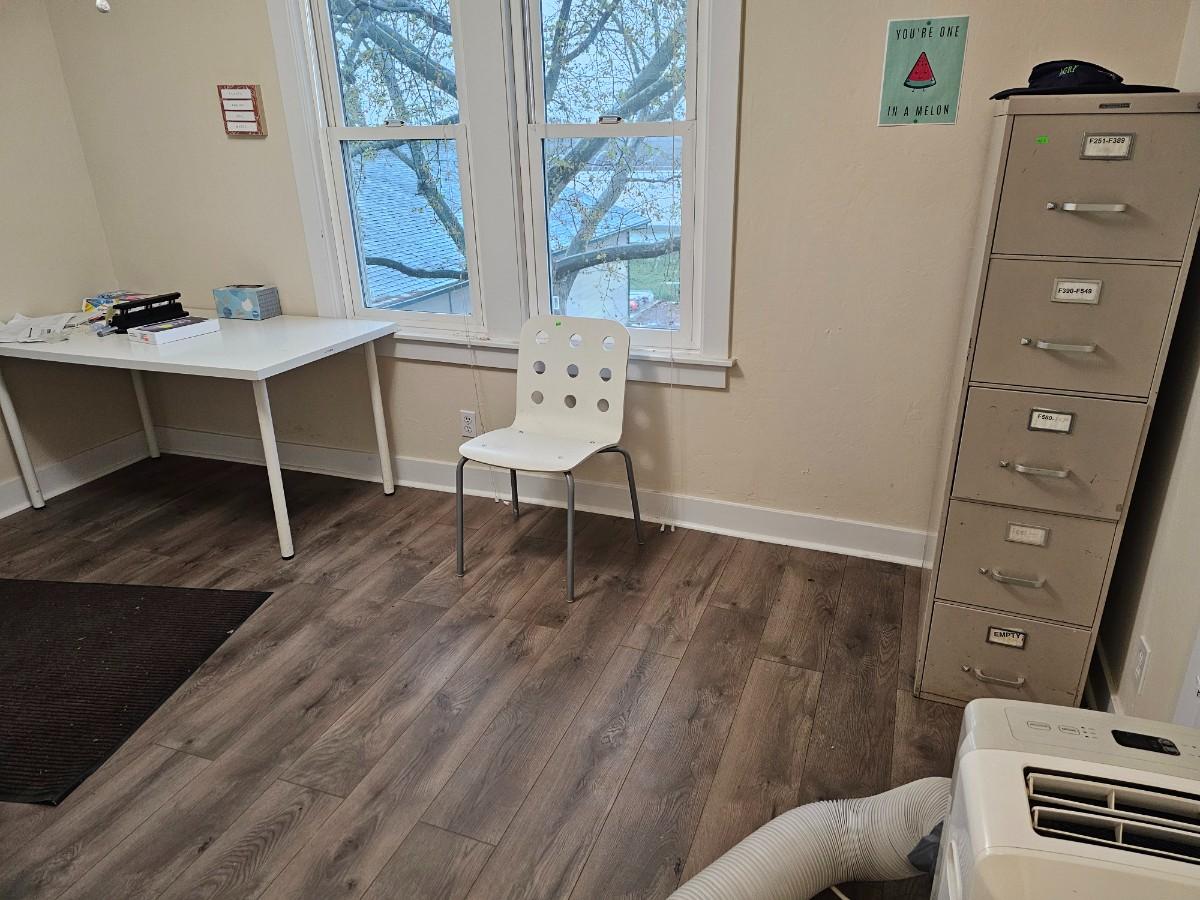 Room of office furniture. Filing cabinet, lightweight table, chair, white board