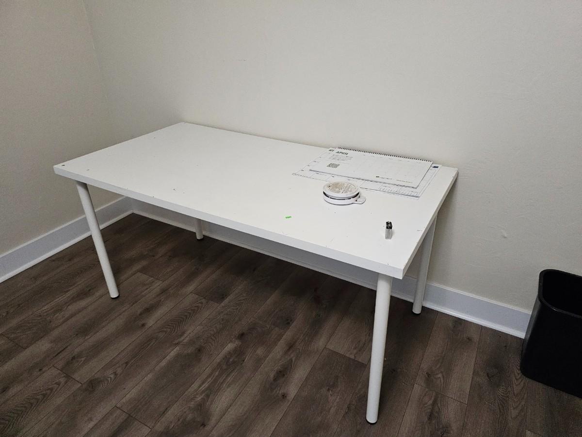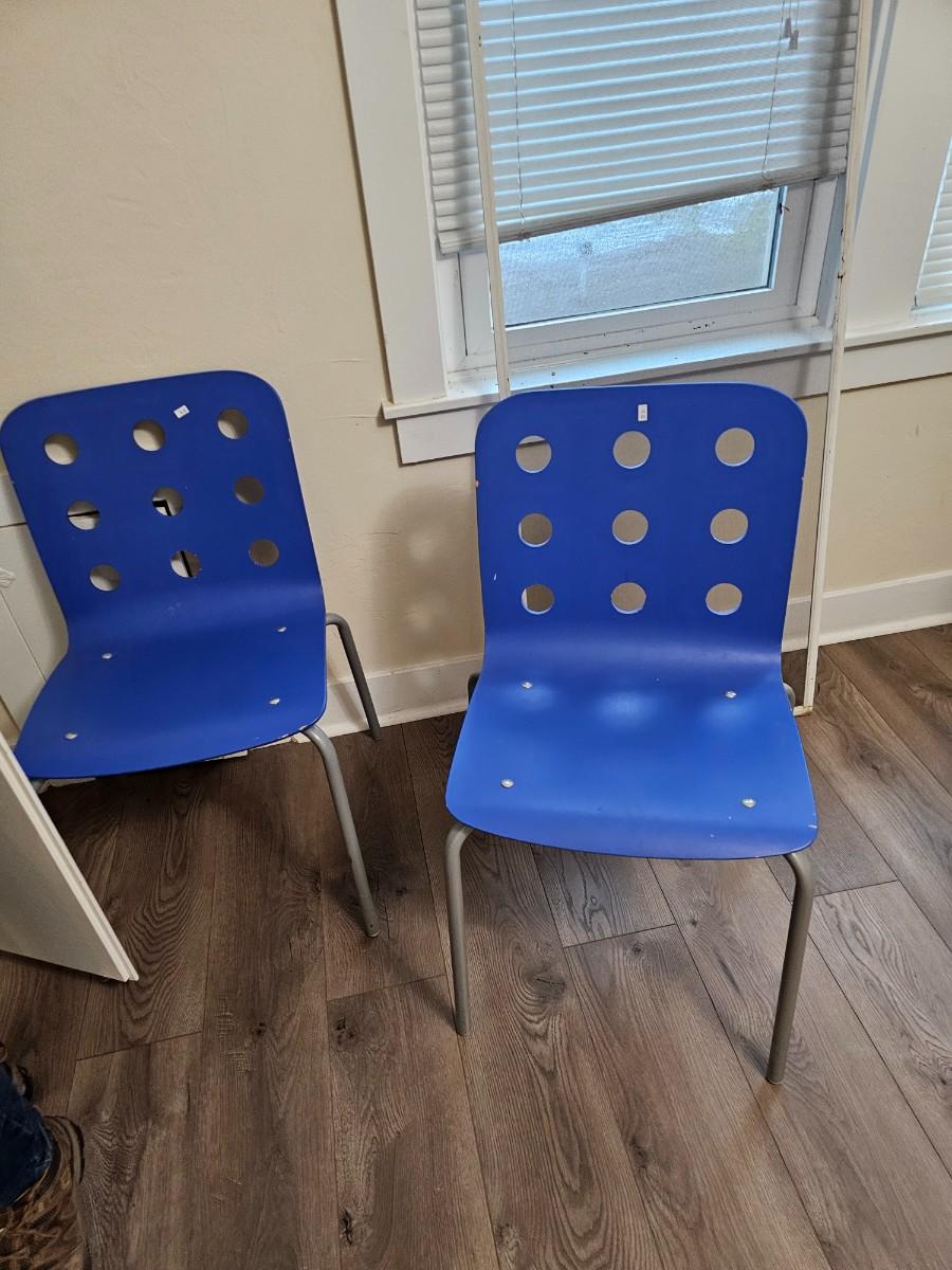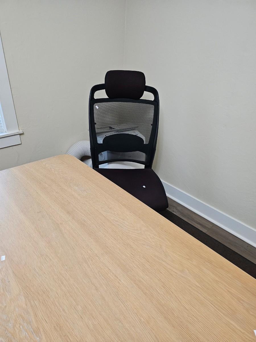 room of office furniture. 2 tables, 2 blue chairs, rolling office chair