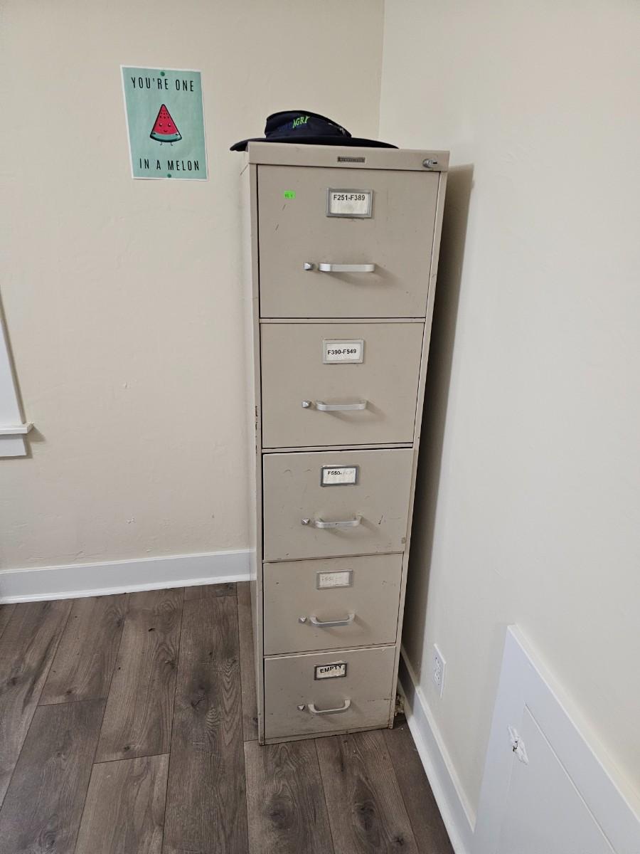 Room of office furniture. Filing cabinet, lightweight table, chair, white board