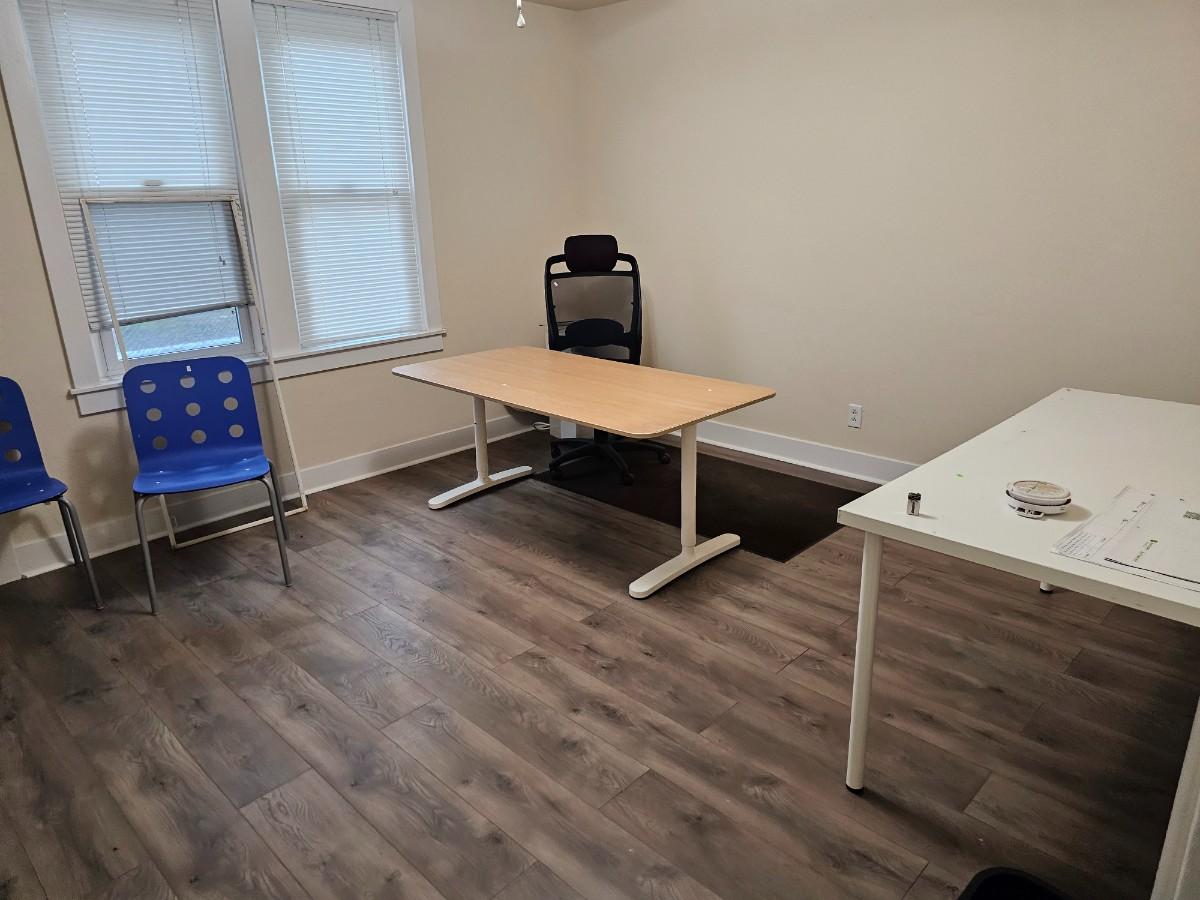 room of office furniture. 2 tables, 2 blue chairs, rolling office chair