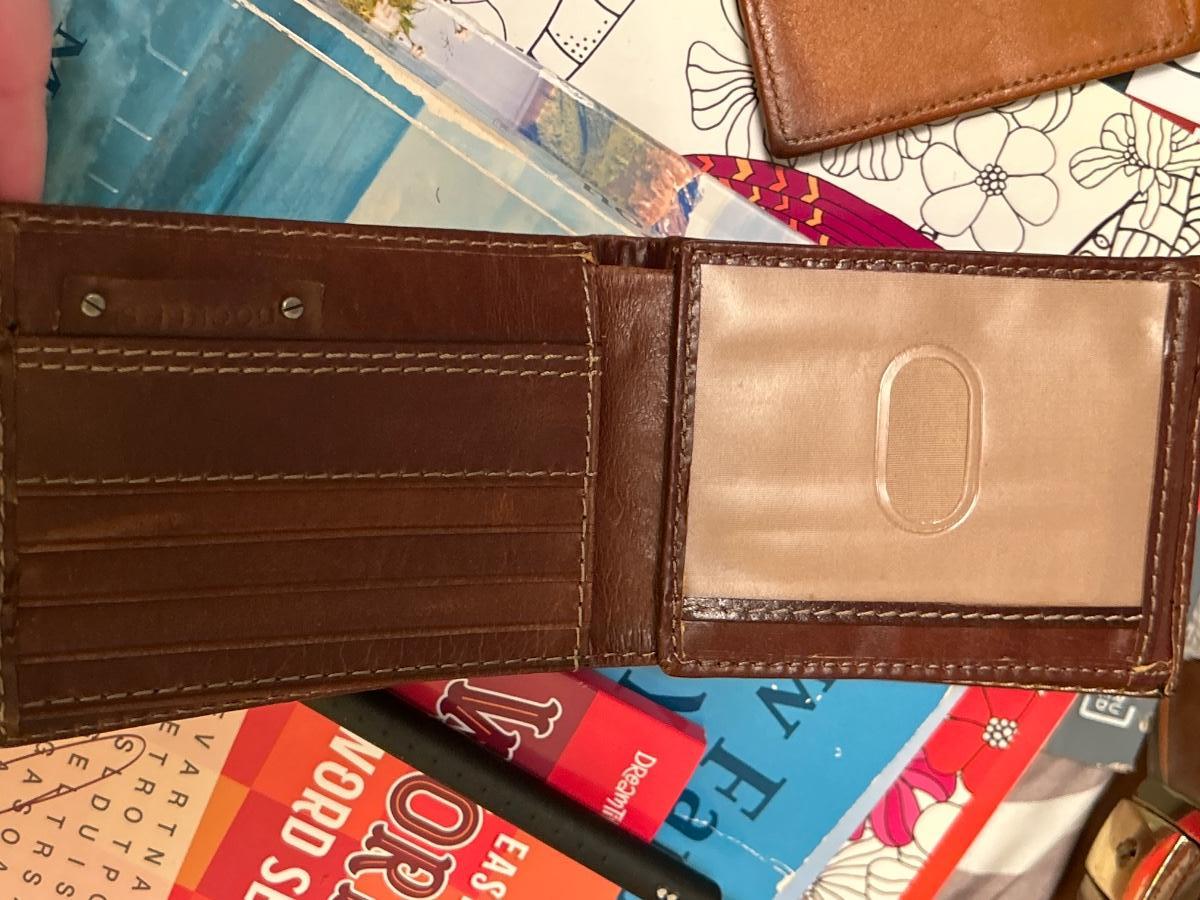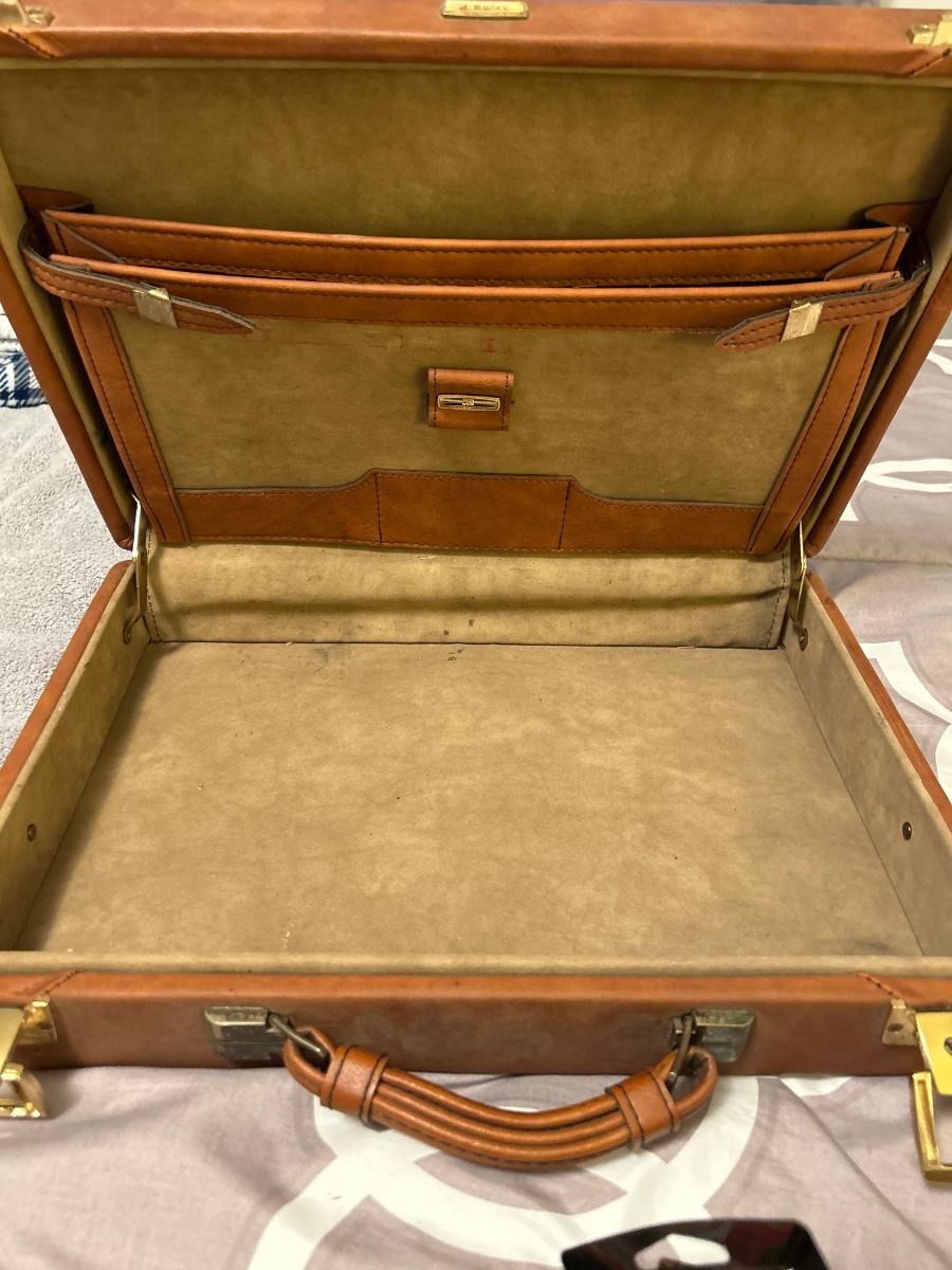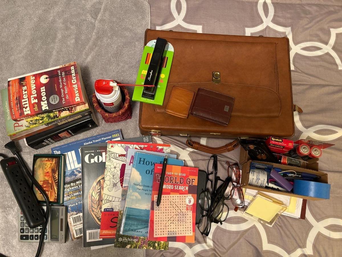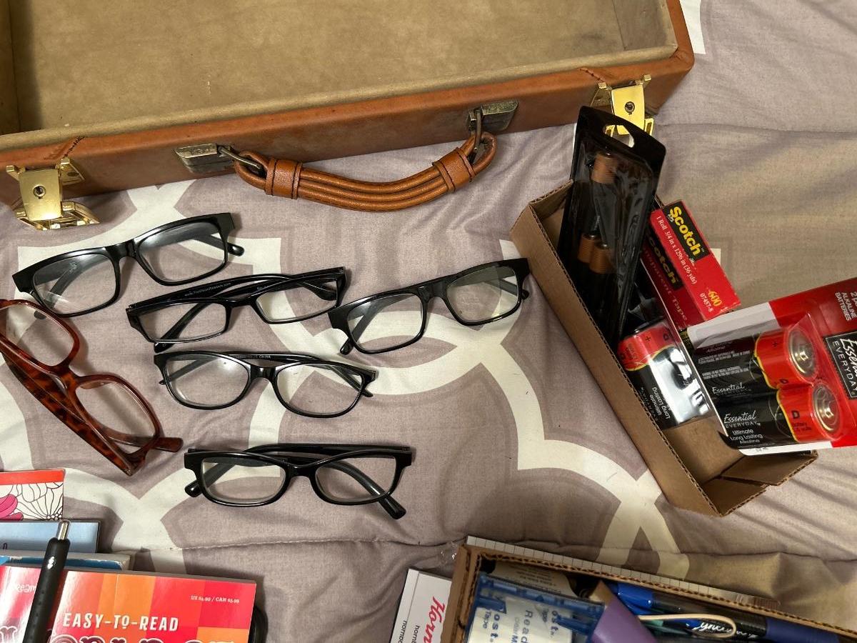 Vtg. Leather briefcase, leather wallet, books, notepads, readers, tape, etc.