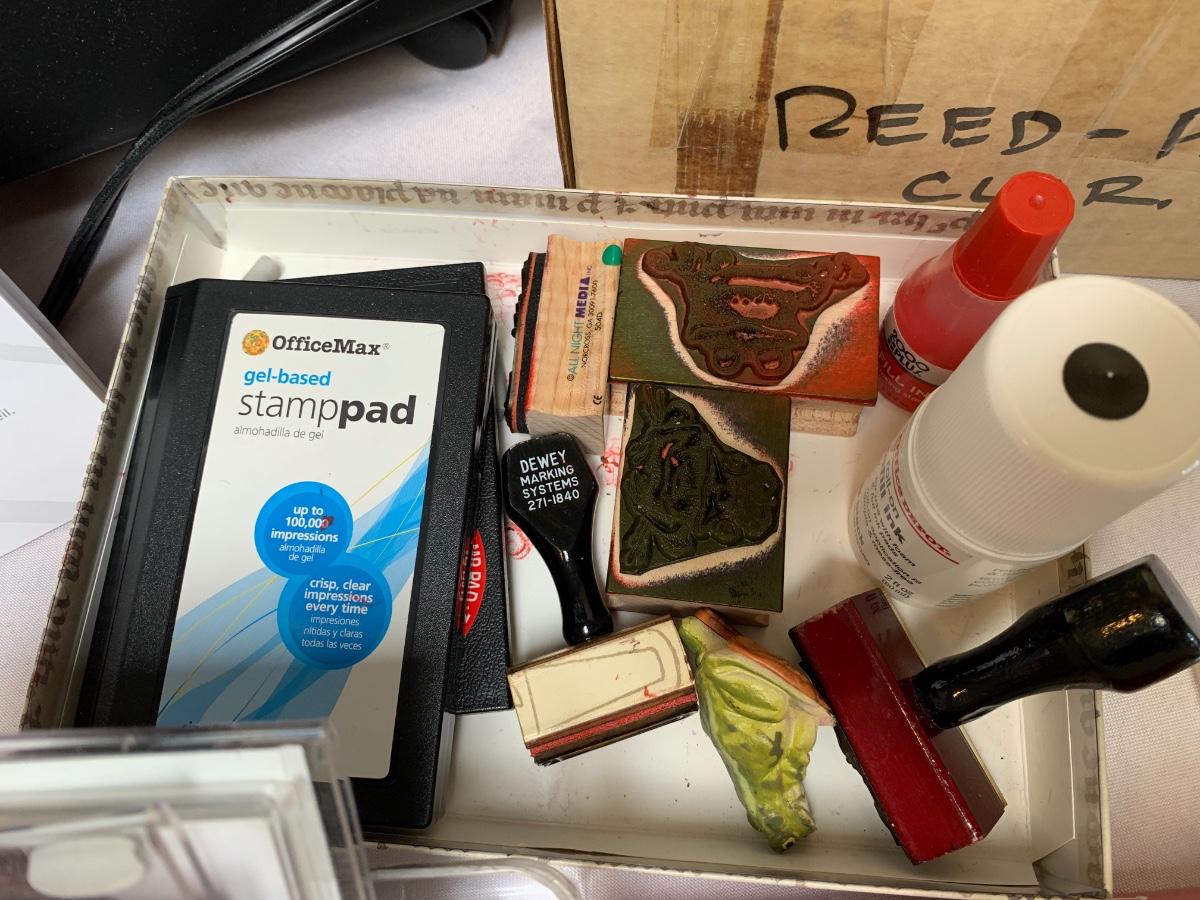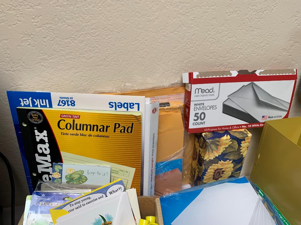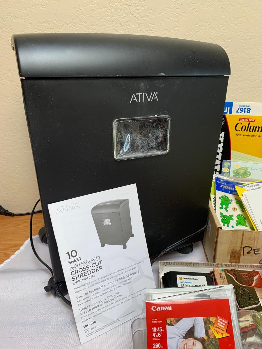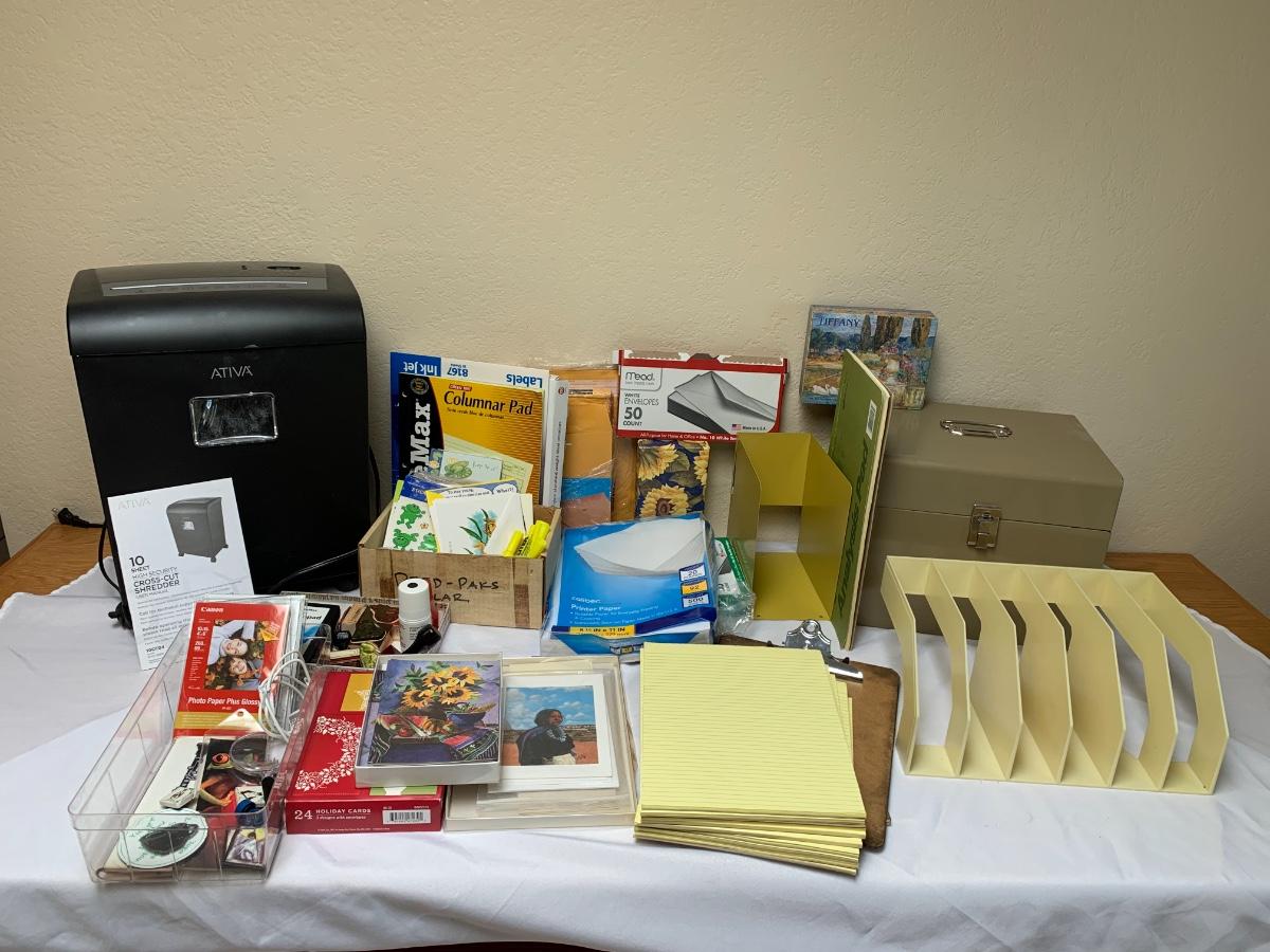 Assorted office material including stamps and stamp pads, stickers, gift boxes, printing paper, envelopes, cards, clipboards, Ativa shredder *not tested* and organization!