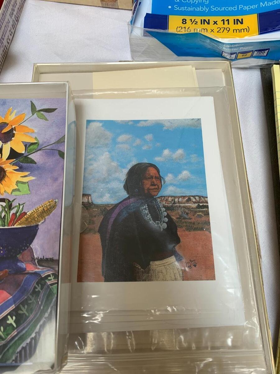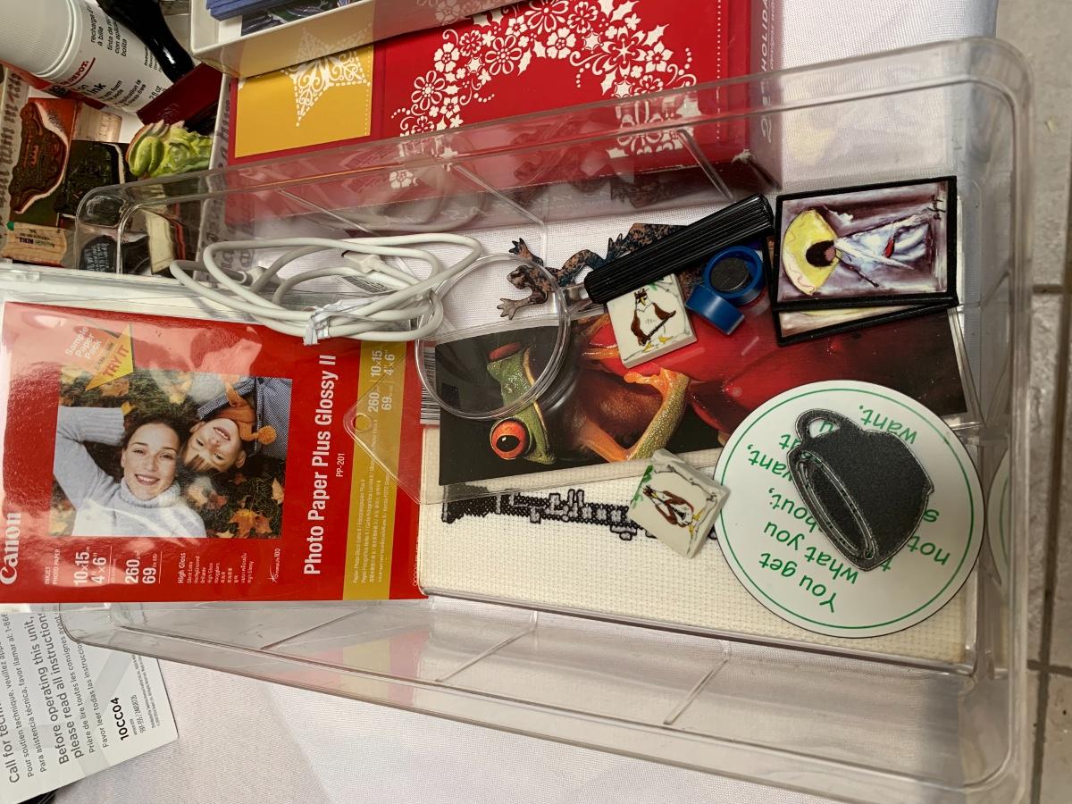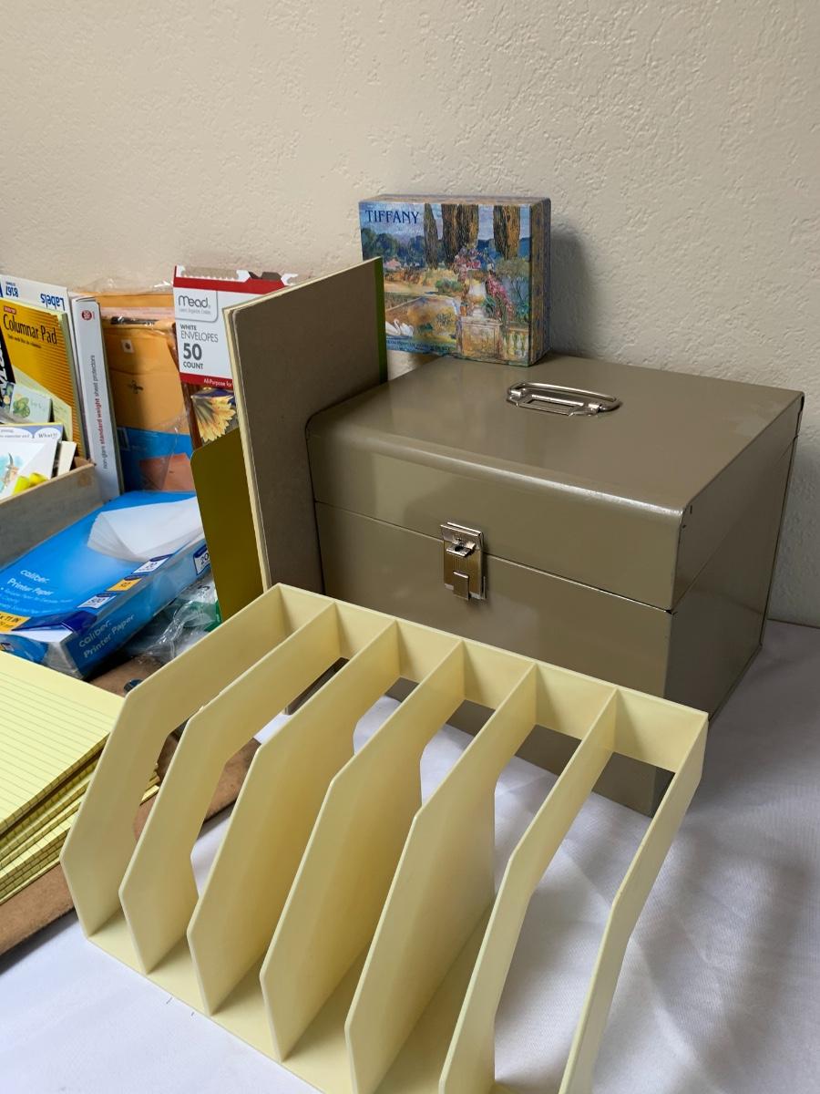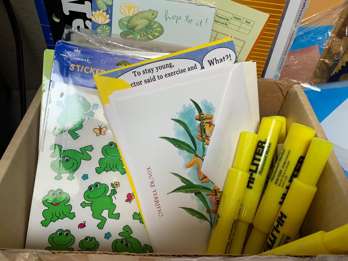 Assorted office material including stamps and stamp pads, stickers, gift boxes, printing paper, envelopes, cards, clipboards, Ativa shredder *not tested* and organization!