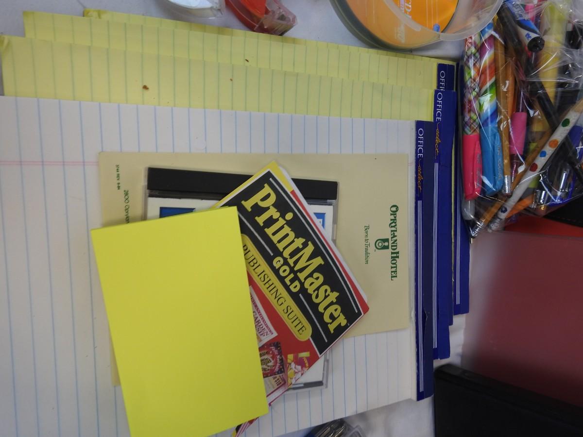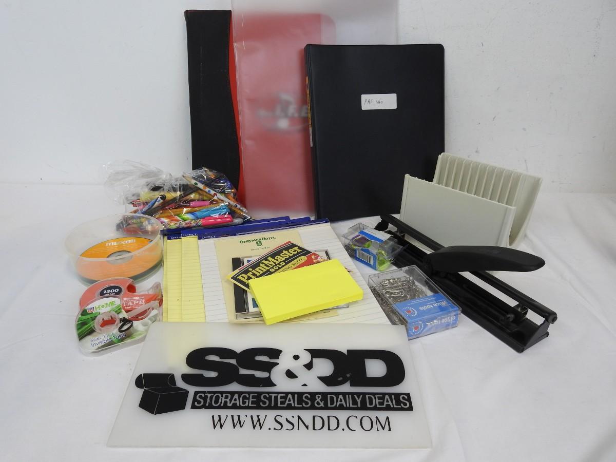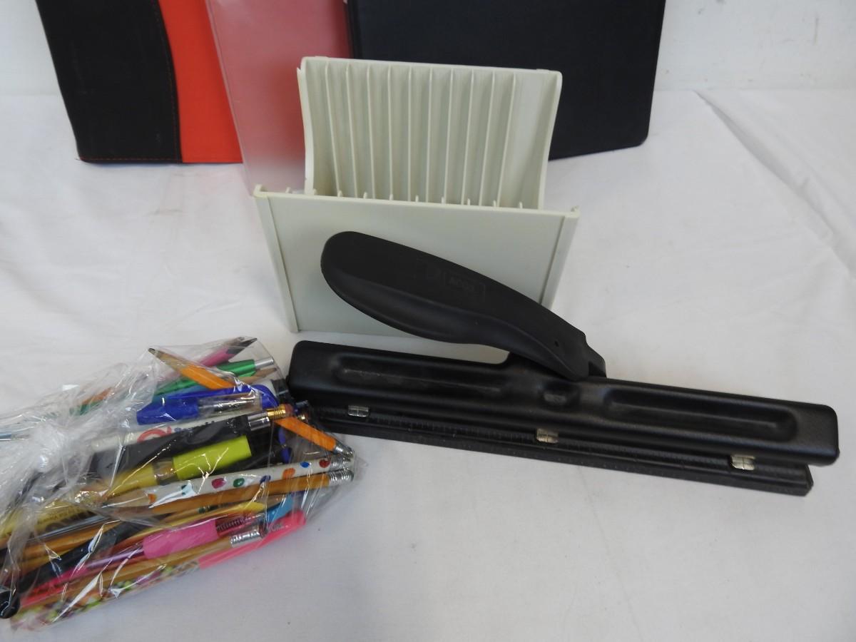 Office Lot: Notepads, Binders, CD Rack, CDs, Hole Punch, Tape, Paper Clips