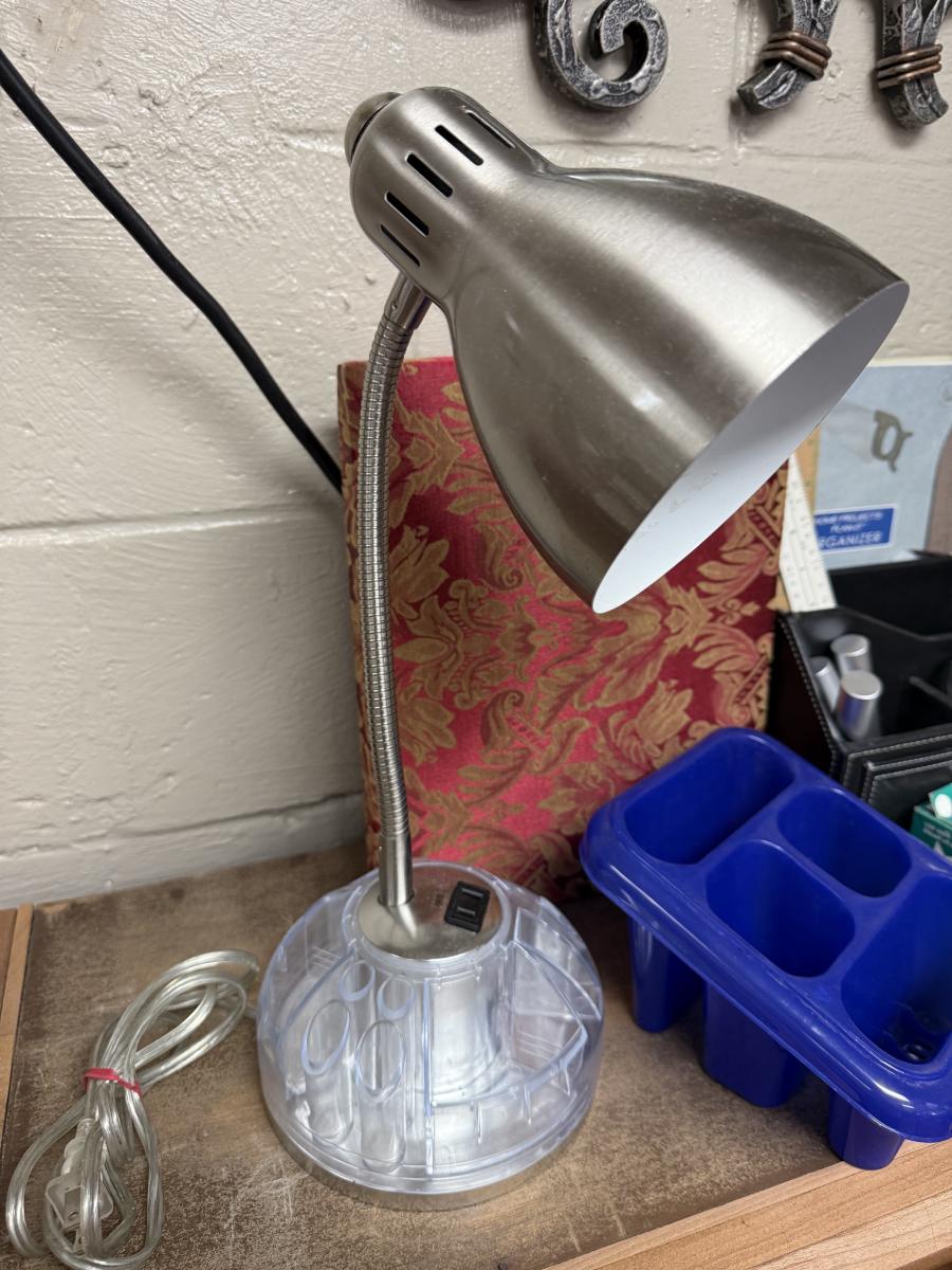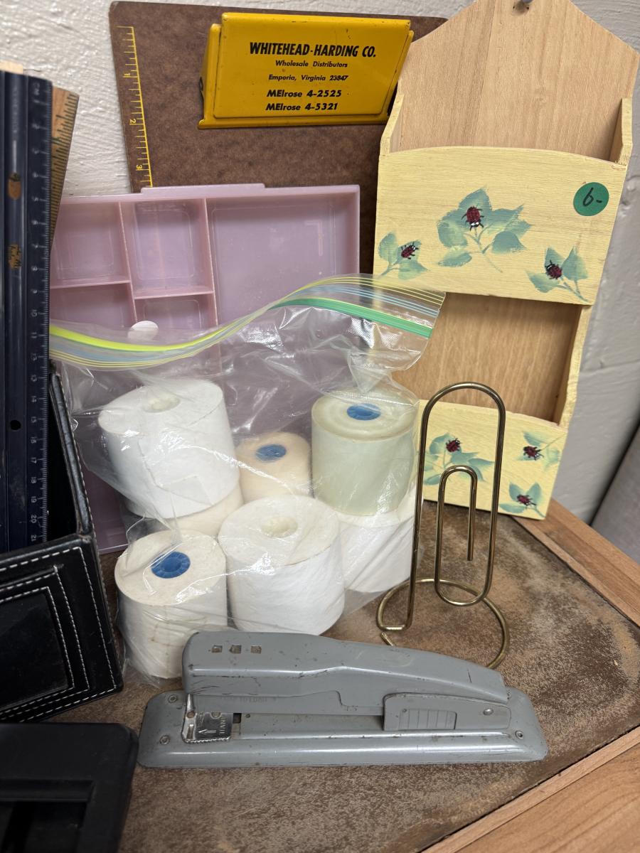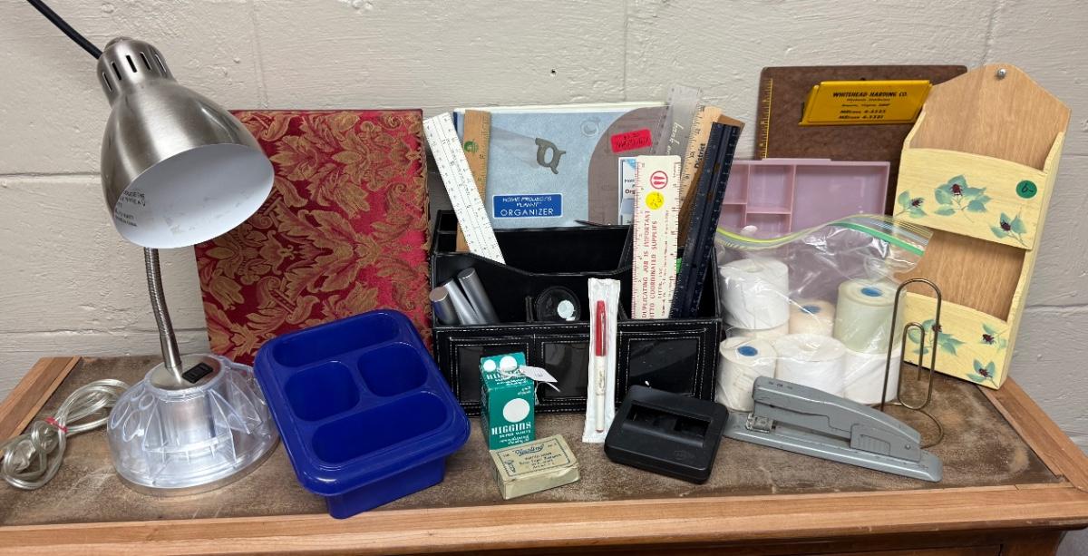 Lamp, organizers, off supplies, vintage Swingline stapler, mail holder, more