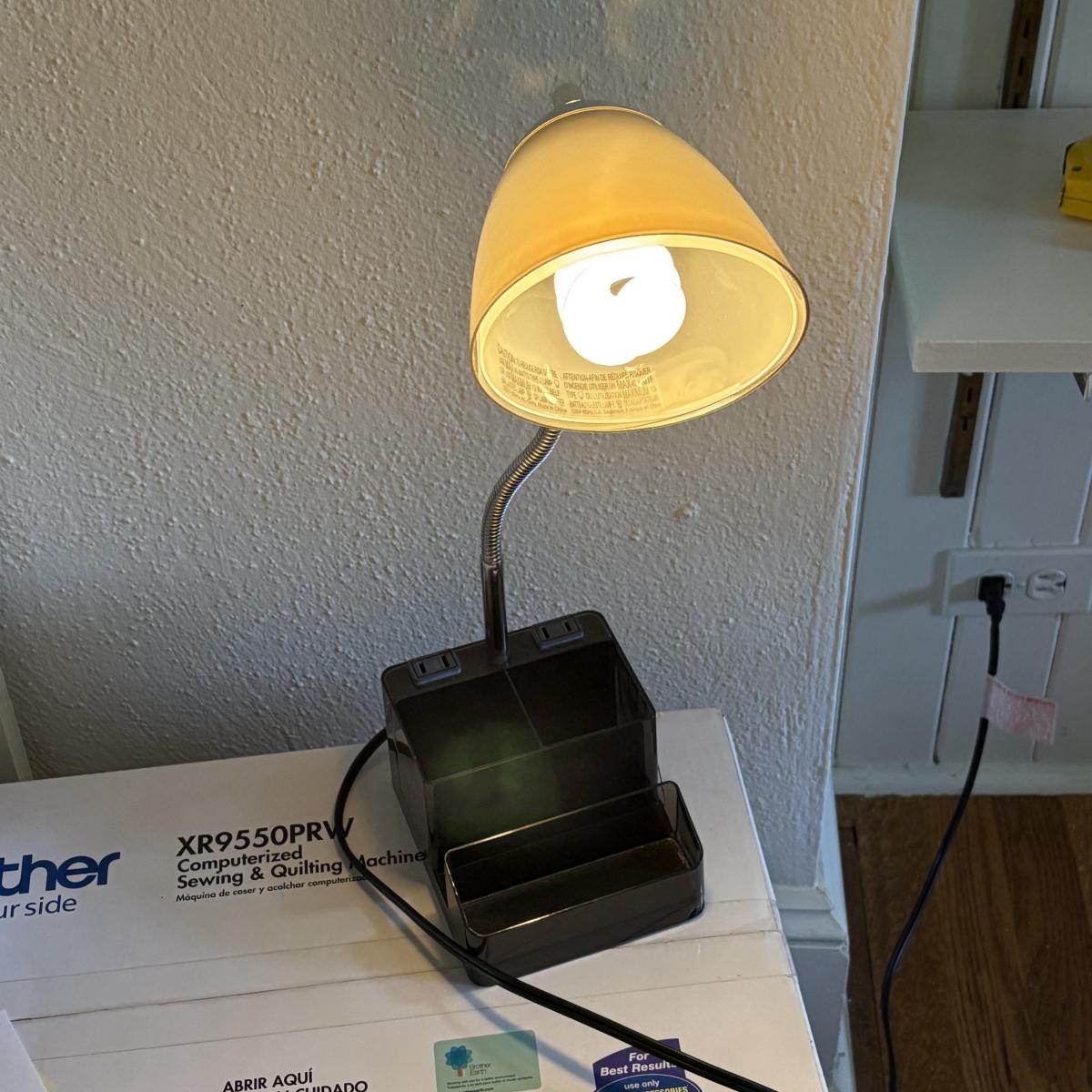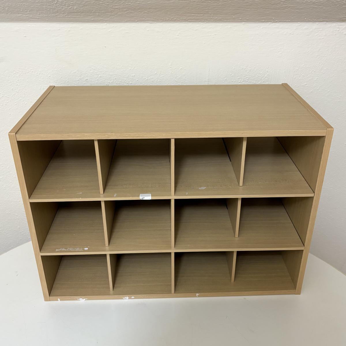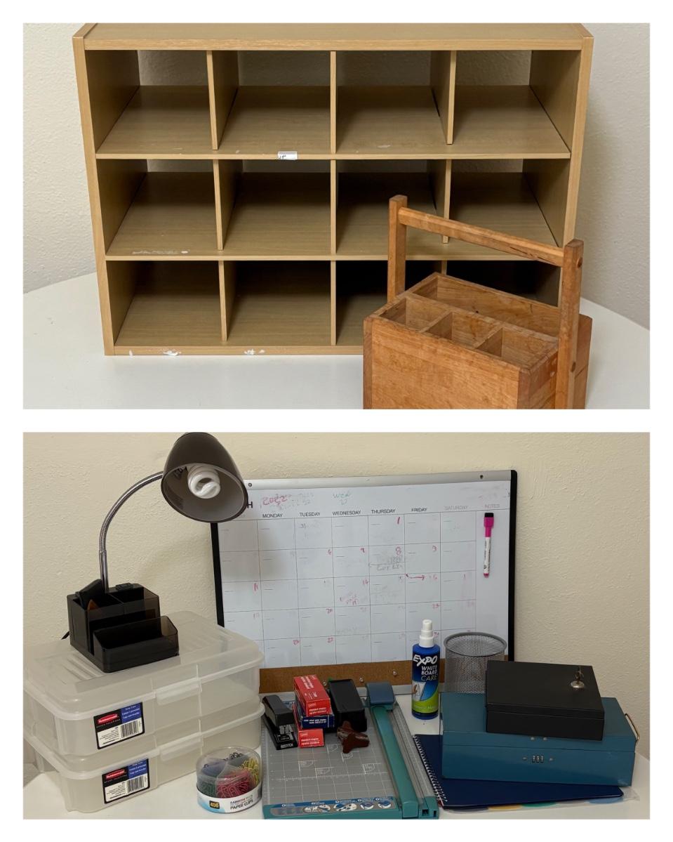 This lot includes a variety of office and organizational supplies, ranging from a desk lamp that powered on when plugged in, to a white board dalender with a dry erase marker and erasers, a stapler, staples, and staple remover, etc. This lot also include 2 lock boxes, one with a key and the other with a pin included. See pictures for everything included. Approximate measurements of 12-cubby storage unit are 23" x 12" x 16"H. The size each cubby is 5" x 12" x 5"H.