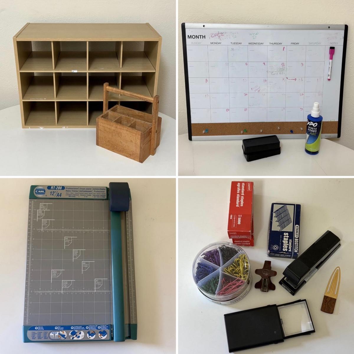 This lot includes a variety of office and organizational supplies, ranging from a desk lamp (that powered on when plugged in), to a white board calendar with a dry erase marker and erasers, a stapler, staples, and staple remover, etc. This lot also includes two lock boxes, one with a key and the other with a pin code included. Approximate measurements of 12-cubby storage unit are 23" x 12" x 16"H. The size each cubby is 5" x 12" x 5"H. The white board calendar will need a good scrubbing. We cannot verify the contents of the white board cleaner bottle.