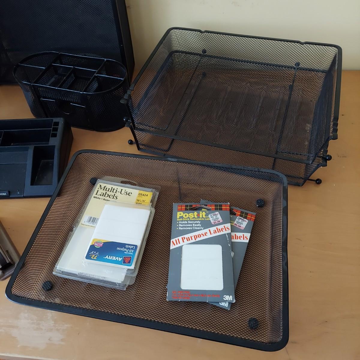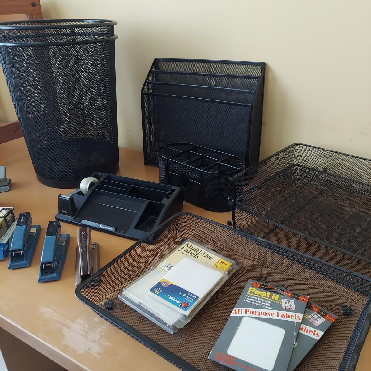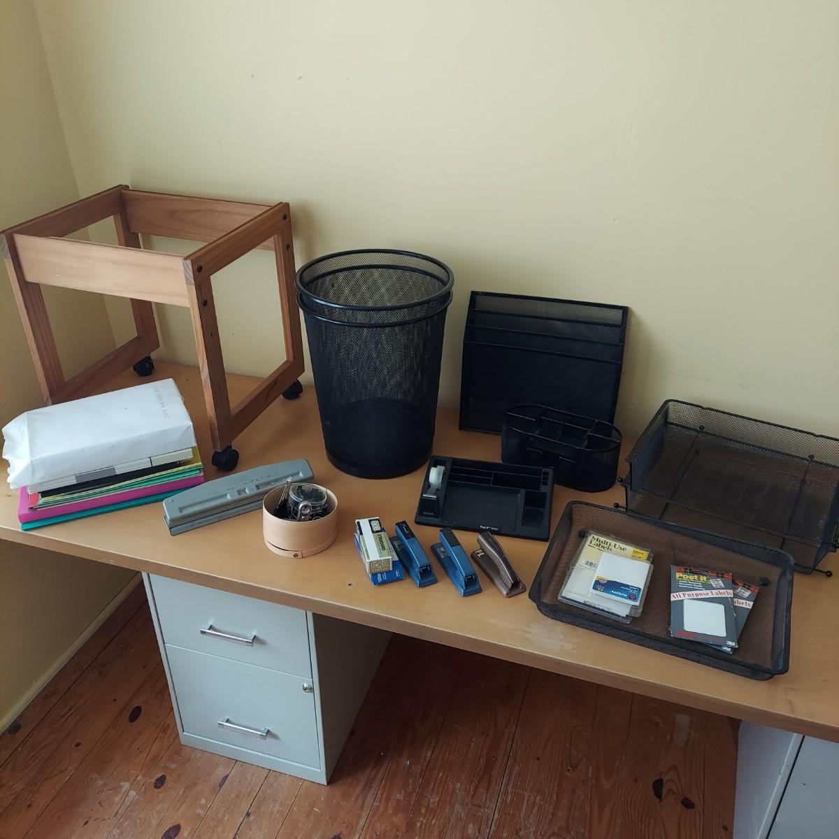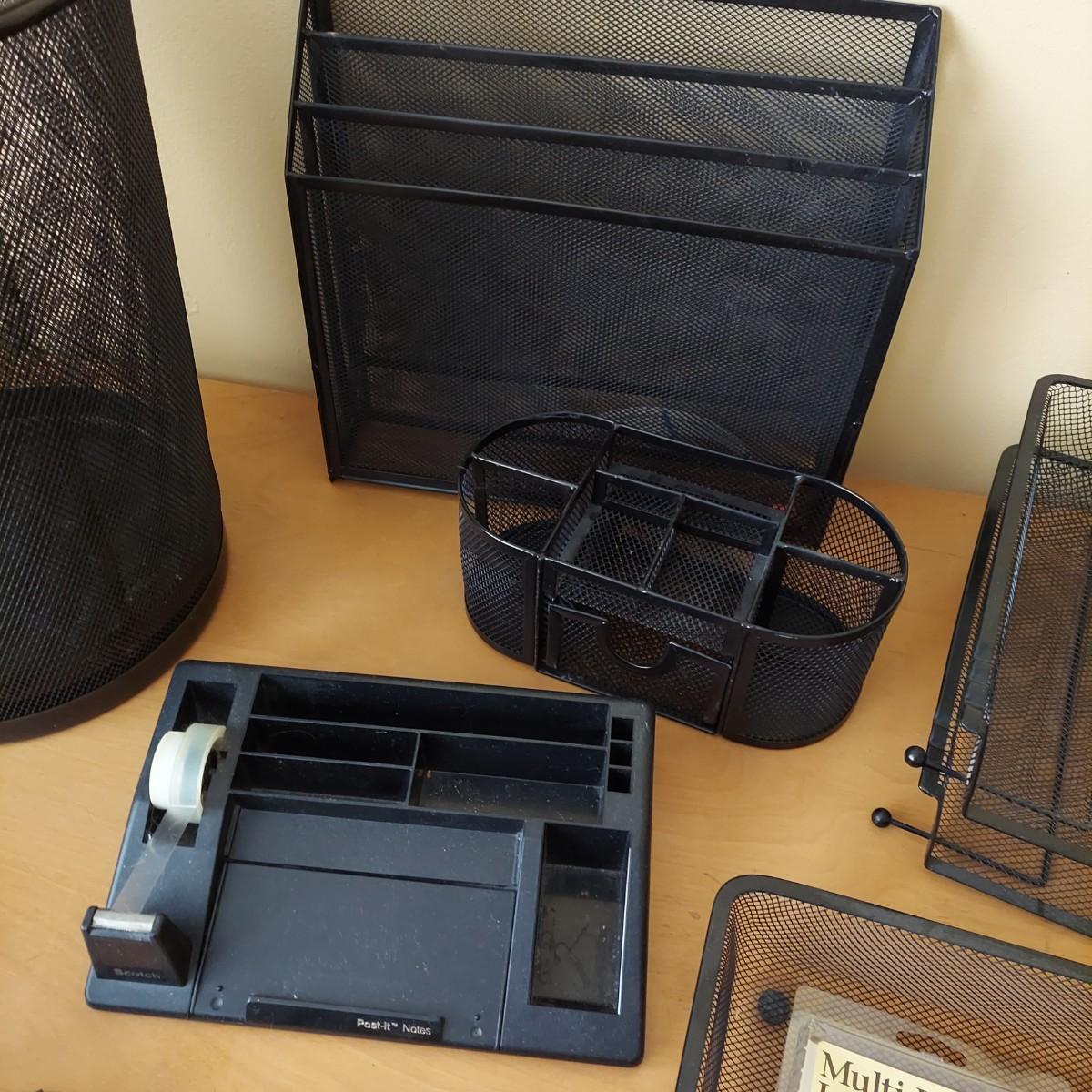 Lot includes several metal mesh desktop organizers with two matching trash cans. Plus, a wooden file frame on wheels that measures 16” x 14” x 18"H and various office supplies. Wooden file caddy has a small chunk missing from the track. Please see photos for details. Shipping available