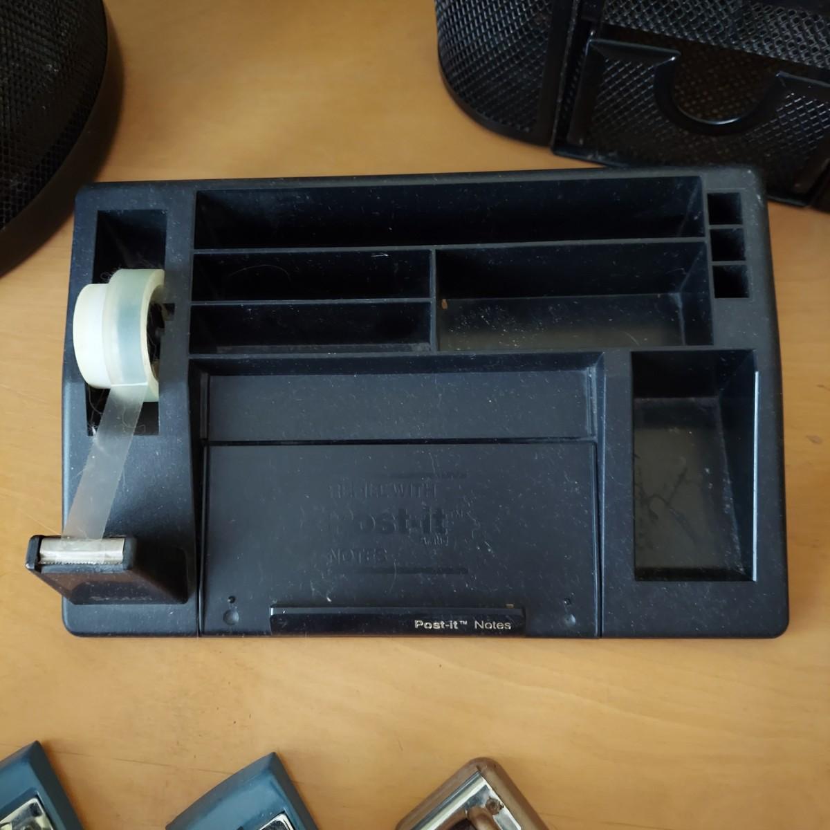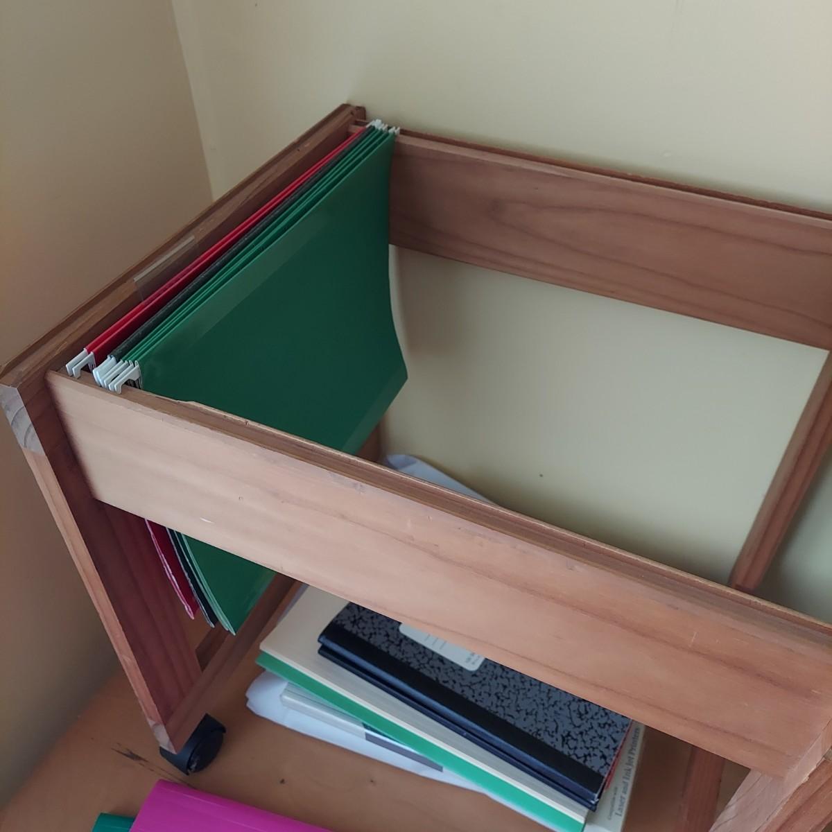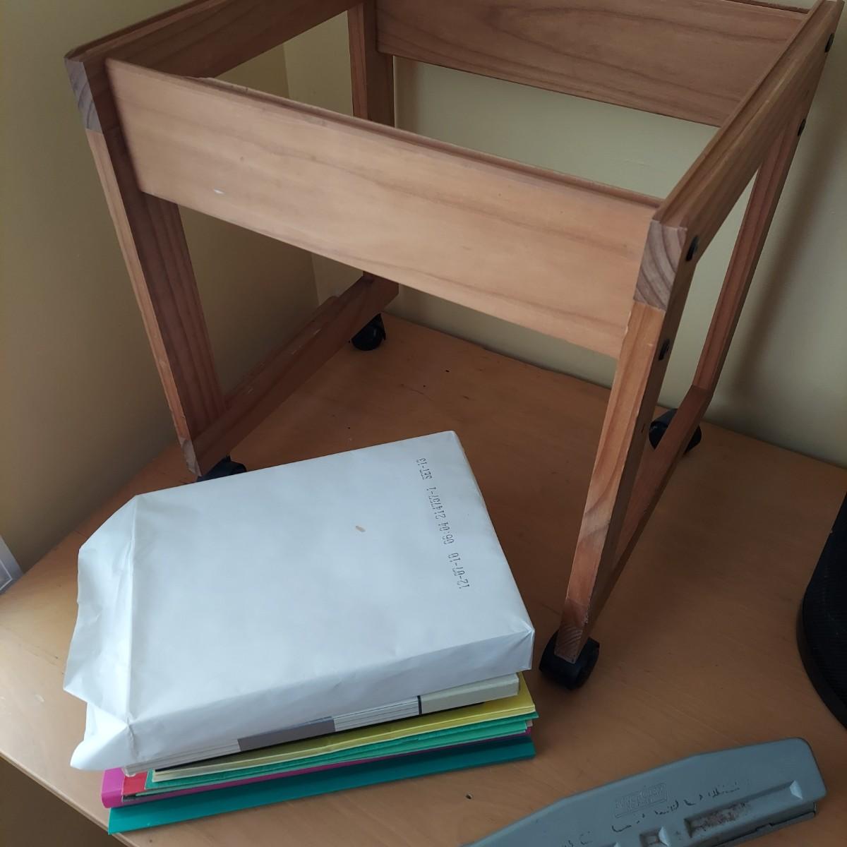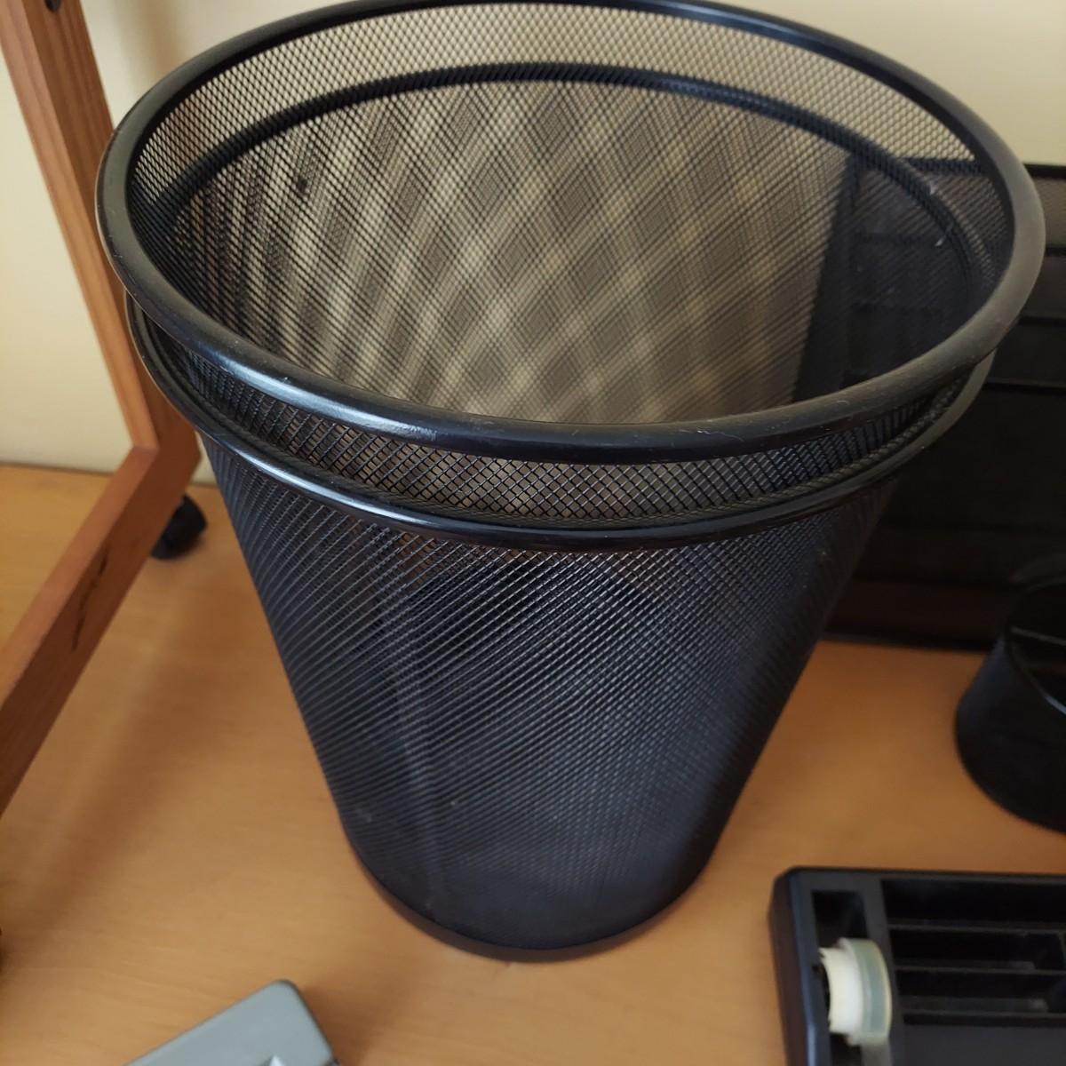 Lot includes several metal mesh desktop organizers with two matching trash cans. Plus, a wooden file frame on wheels that measures 16” x 14” x 18"H and various office supplies. Wooden file caddy has a small chunk missing from the track. Please see photos for details. Shipping available