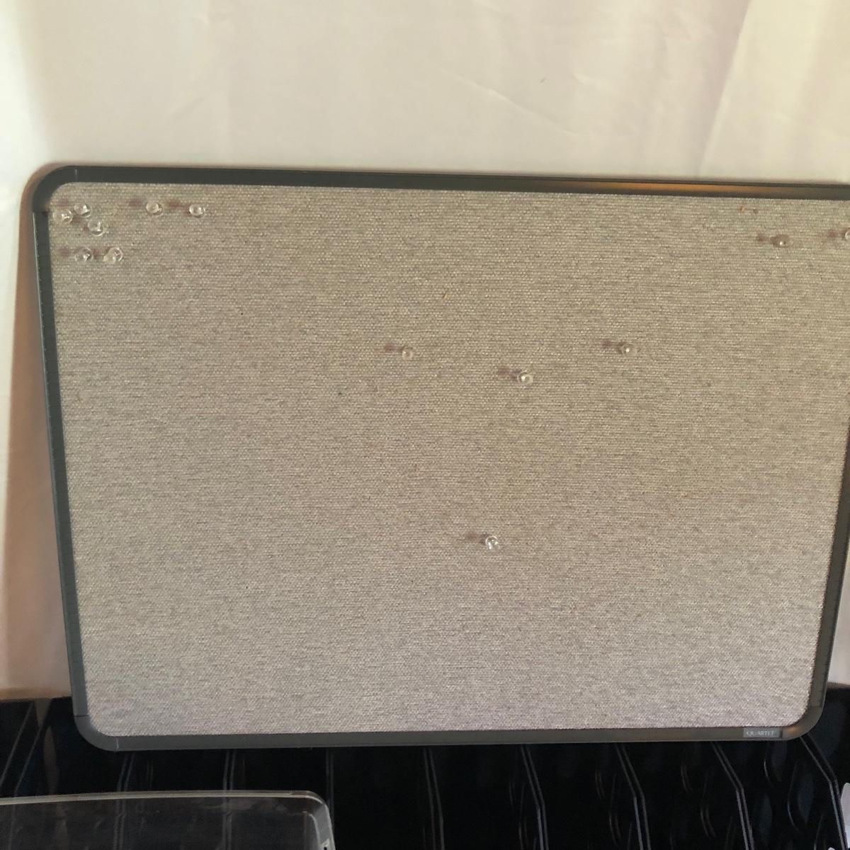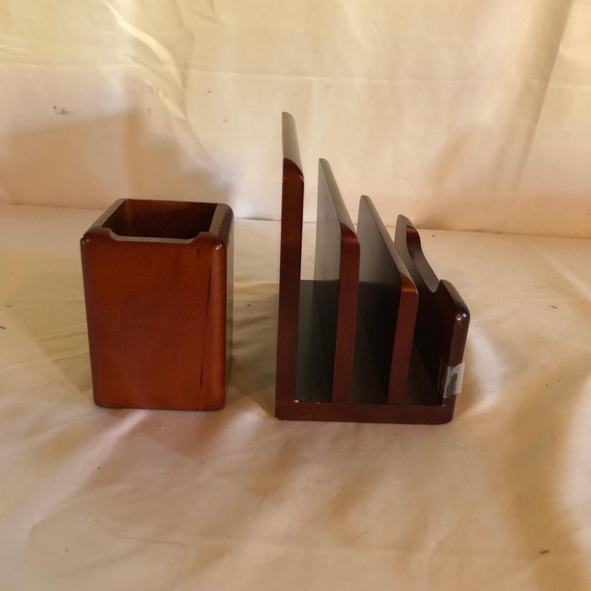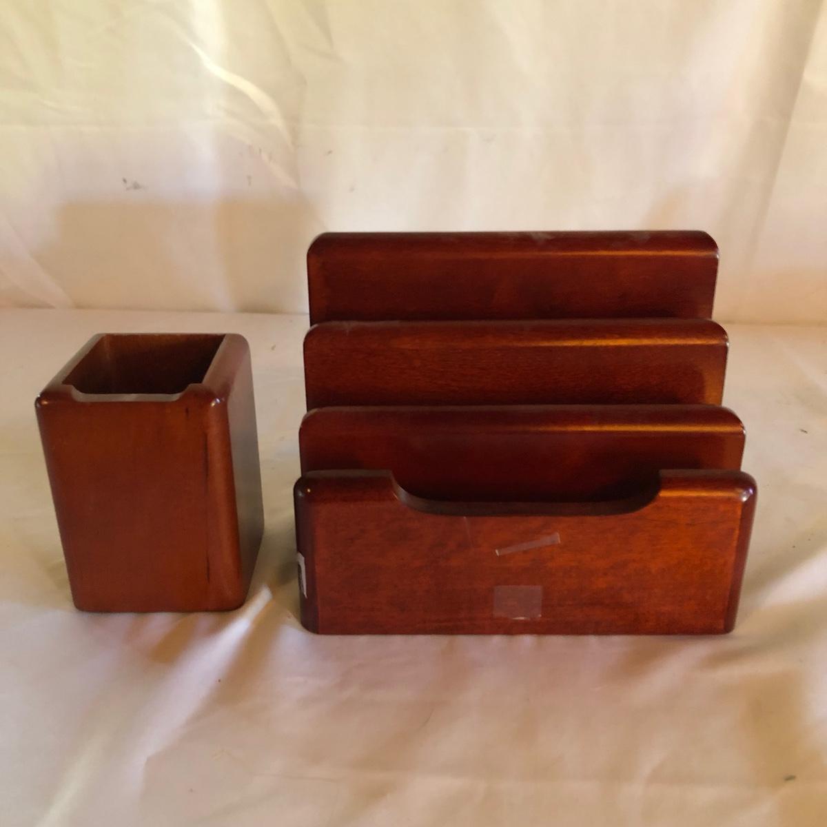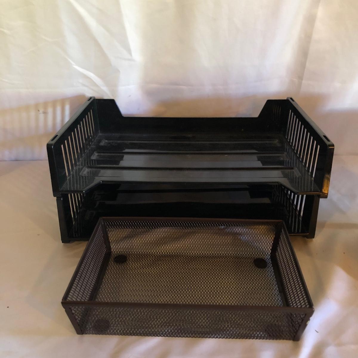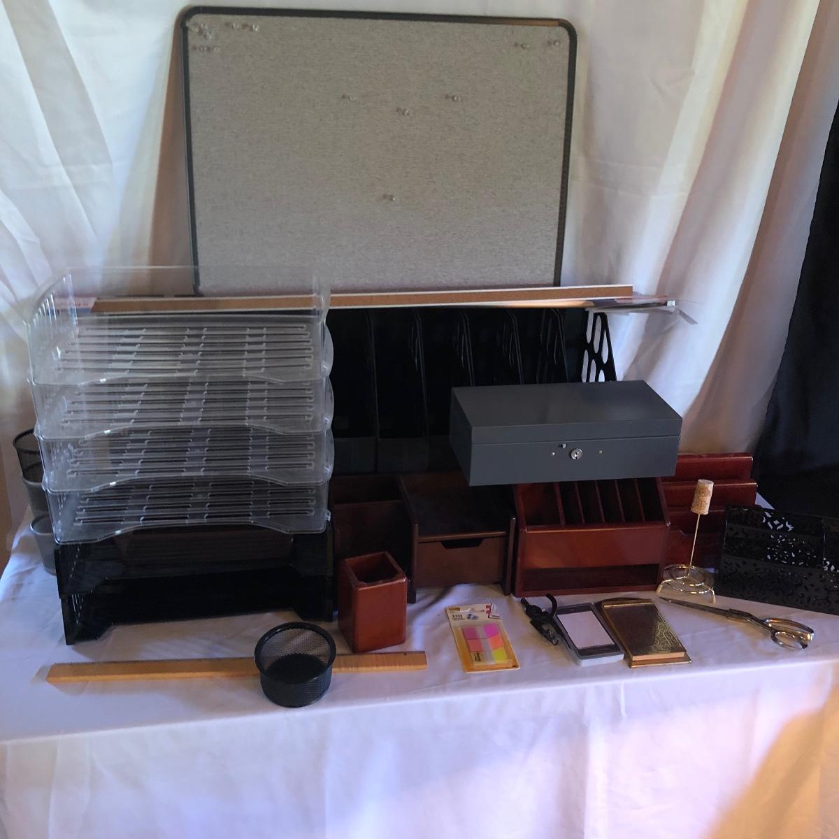 Lot includes ten plastic file holders, six trays, cork board, bulletin bar, three wooden desk organizers, mesh cups and organizers, brass notepad and more. Cork board measures 17” x 23”.
