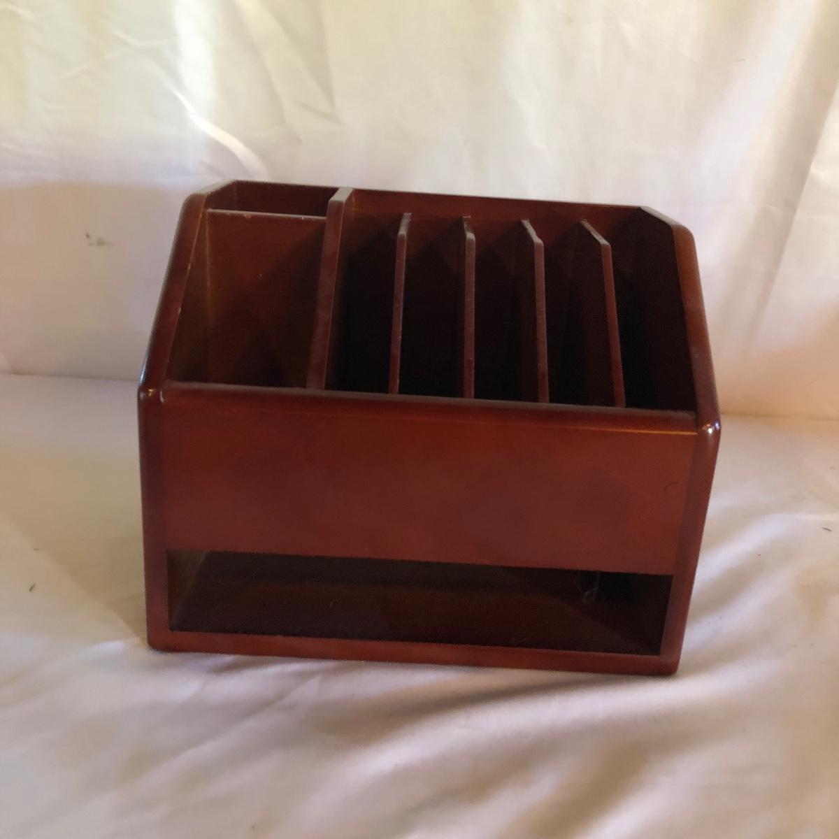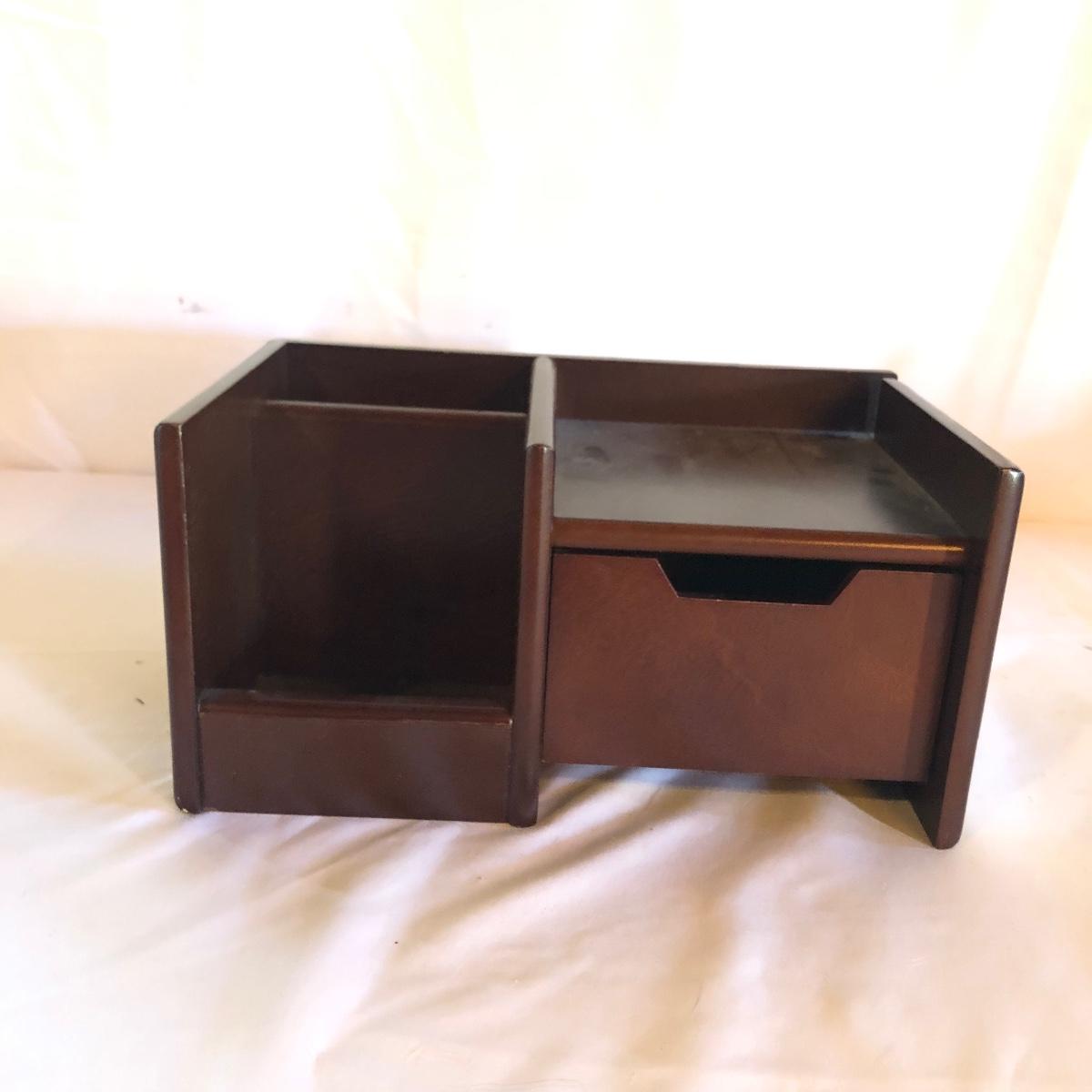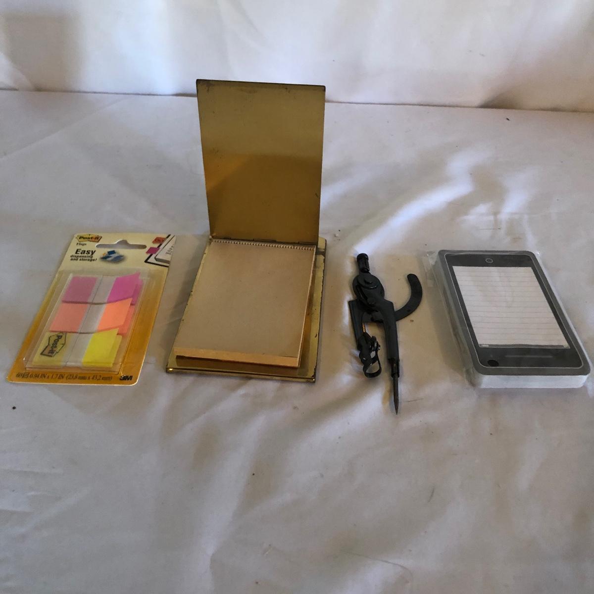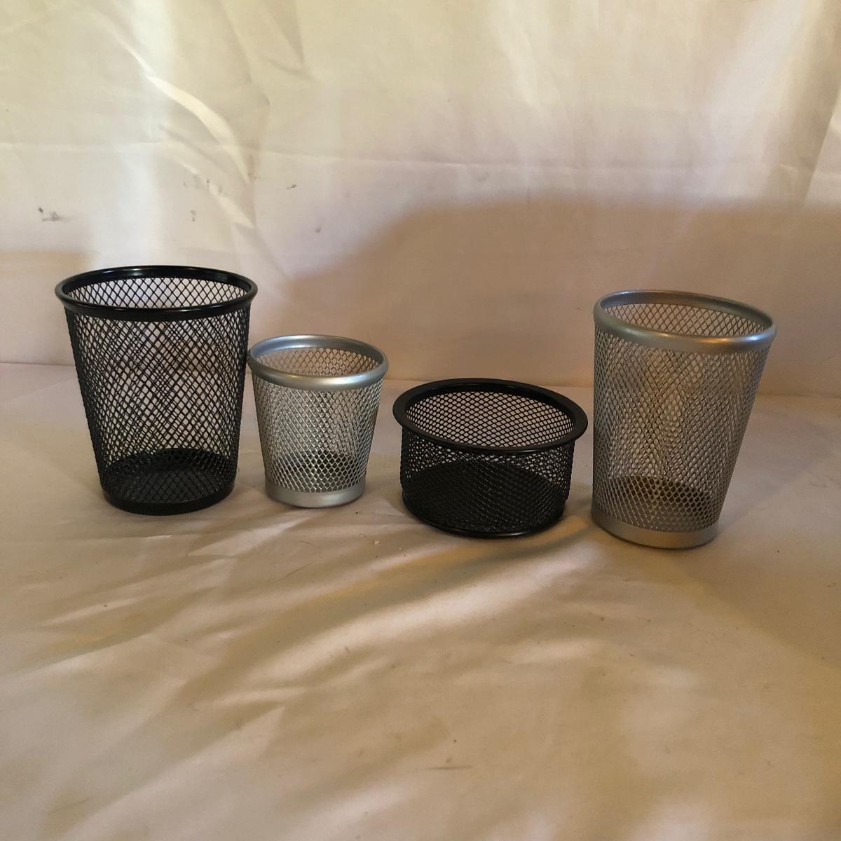 Lot includes ten plastic file holders, six trays, cork board, bulletin bar, three wooden desk organizers, mesh cups and organizers, brass notepad and more. Cork board measures 17” x 23”.