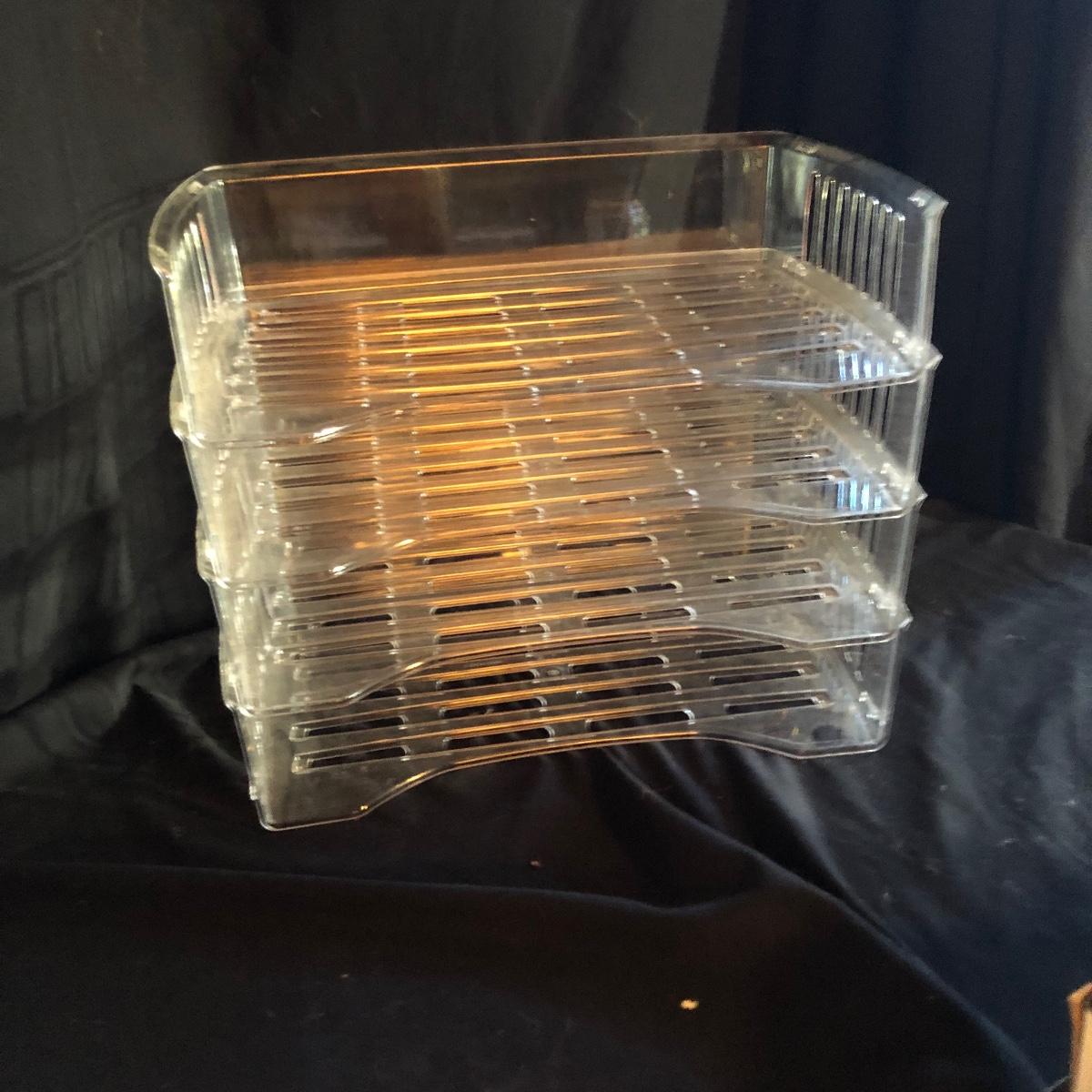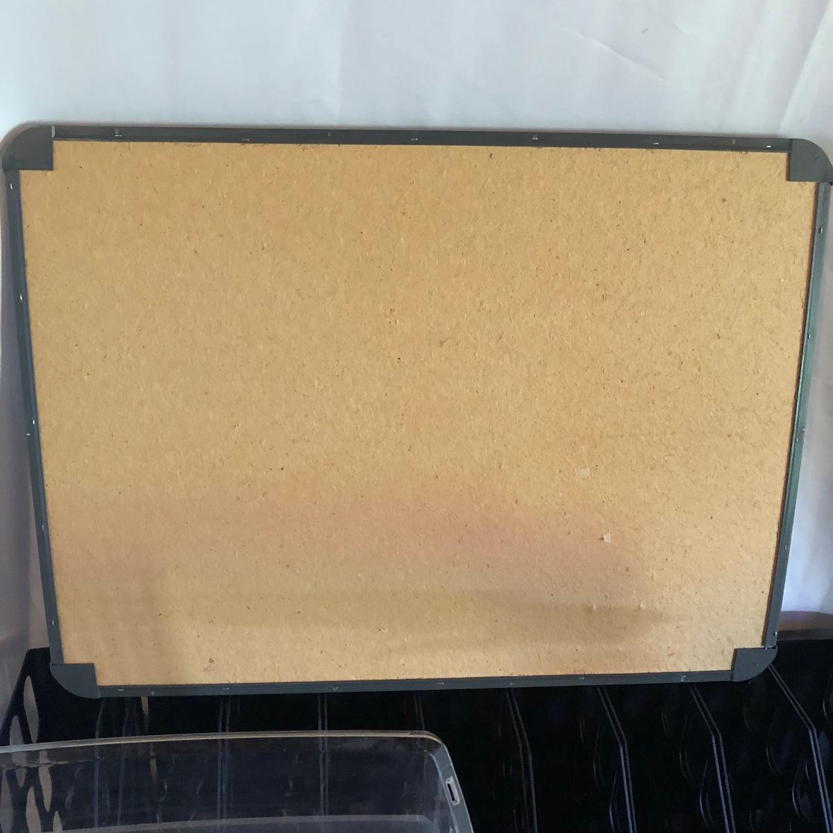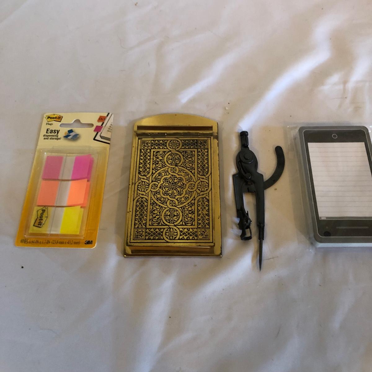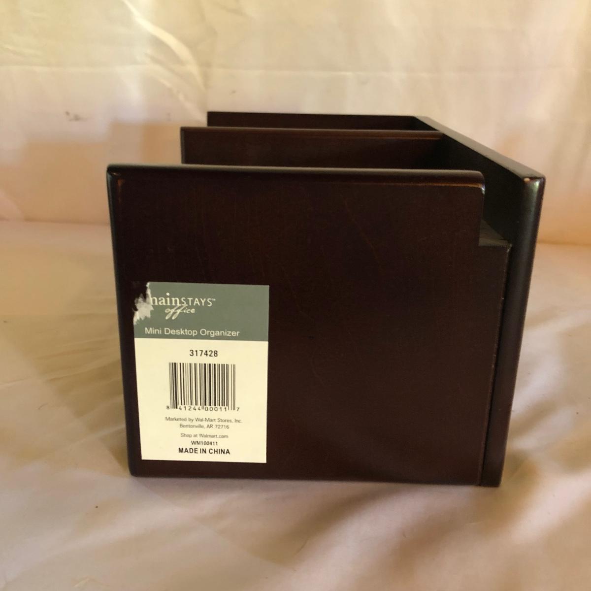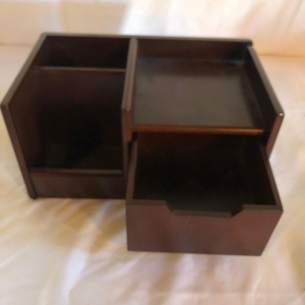 Lot includes ten plastic file holders, six trays, cork board, bulletin bar, three wooden desk organizers, mesh cups and organizers, brass notepad and more. Cork board measures 17” x 23”.