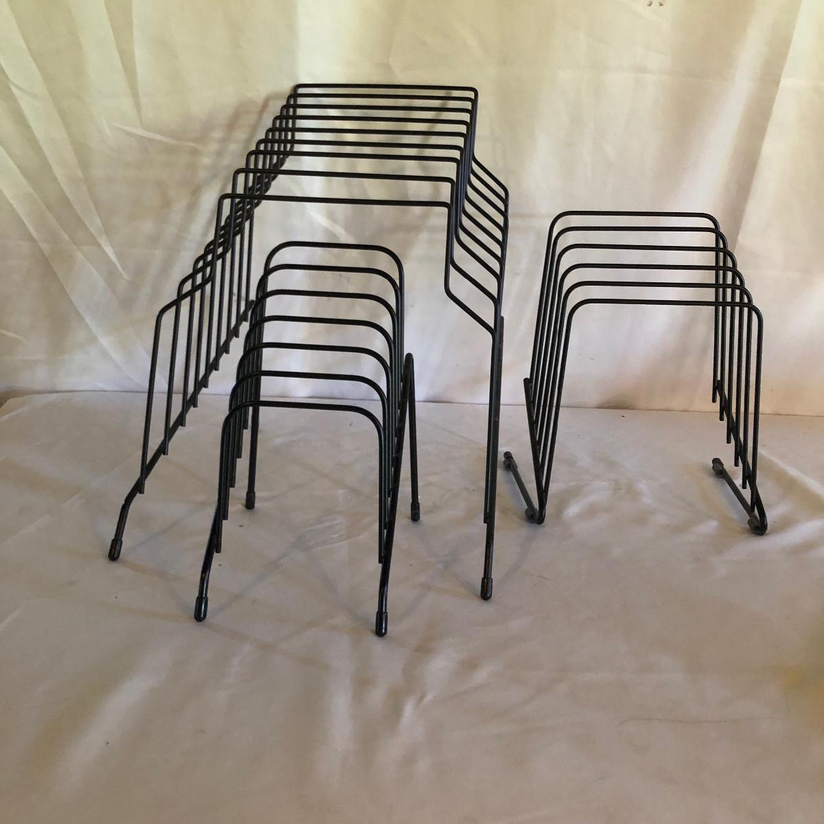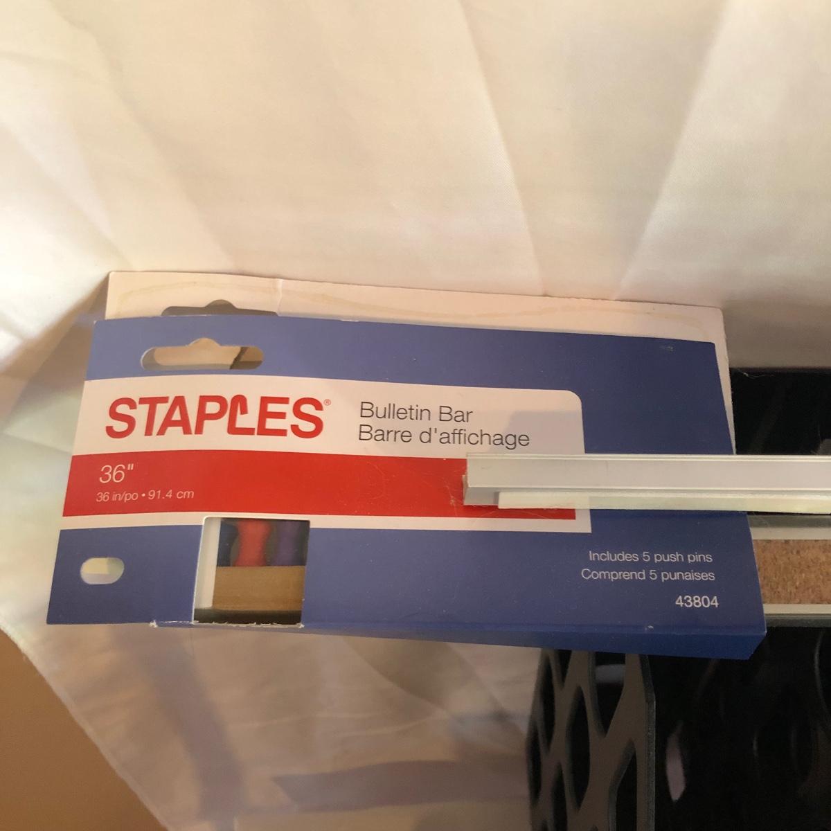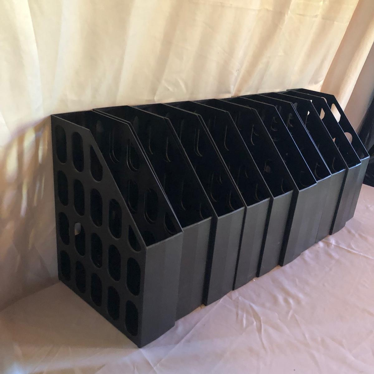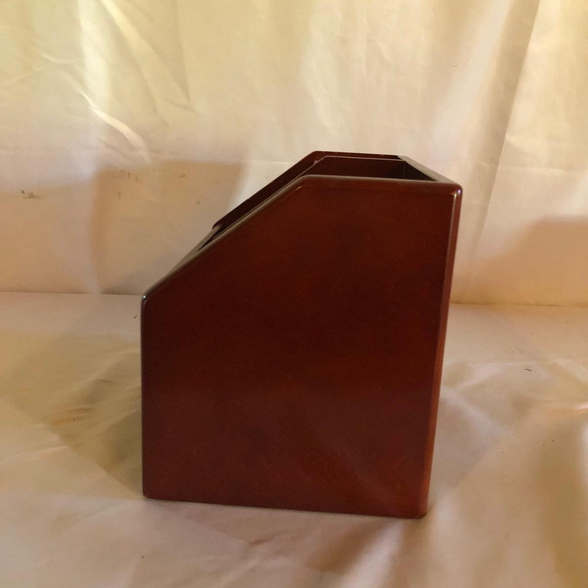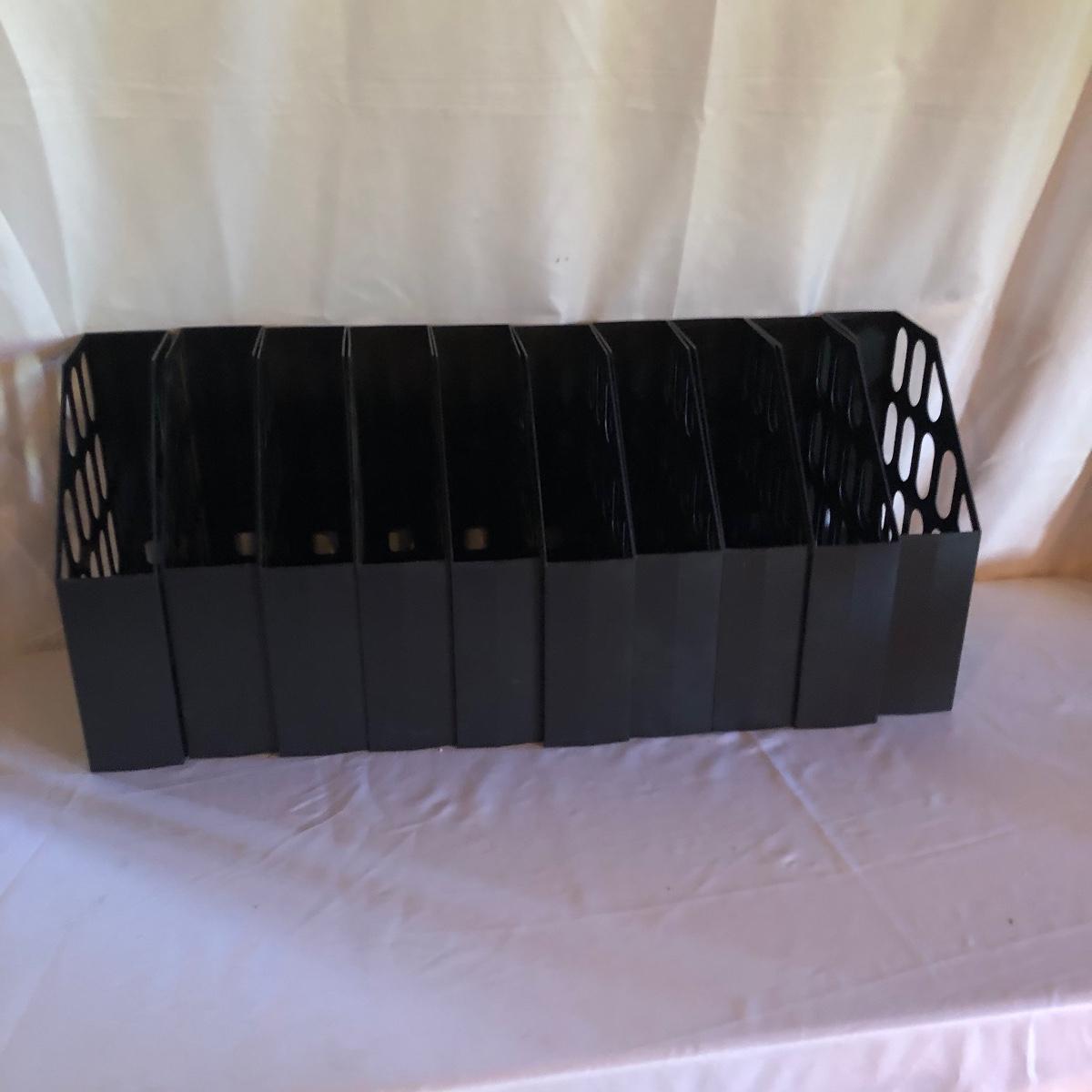 Lot includes ten plastic file holders, six trays, cork board, bulletin bar, three wooden desk organizers, mesh cups and organizers, brass notepad and more. Cork board measures 17” x 23”.