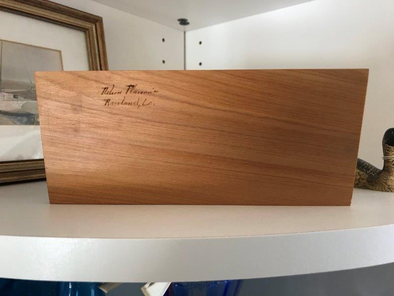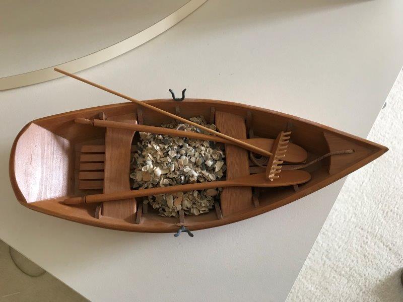 Hand made wood oyster skiff model "pirogue" with tools and shells on stand 12" L. Signed Nelson Plaisanc of Raceland, Louisianna. Includes framed print of a sail boat.