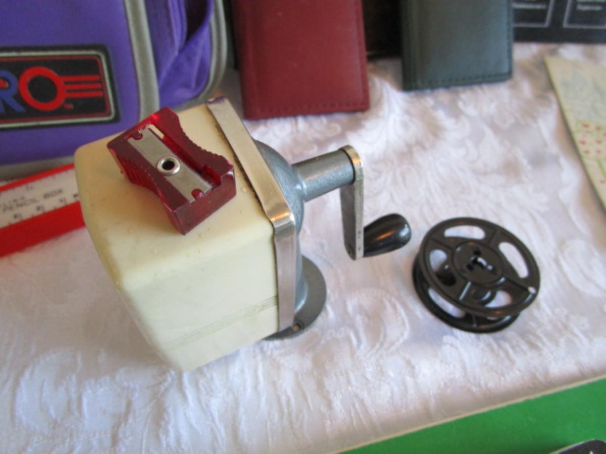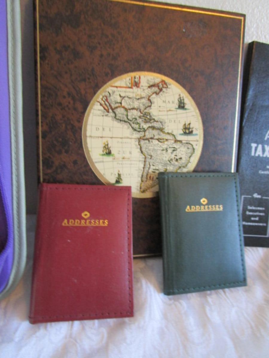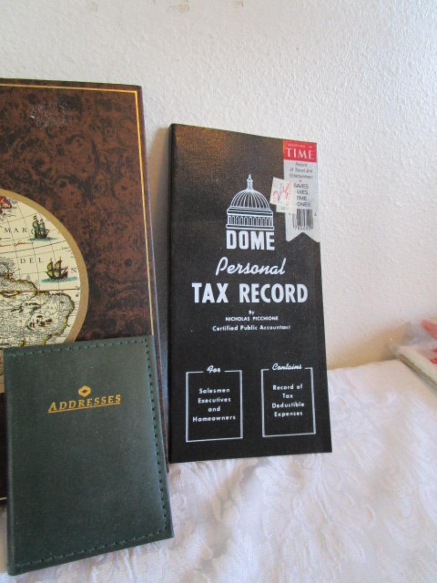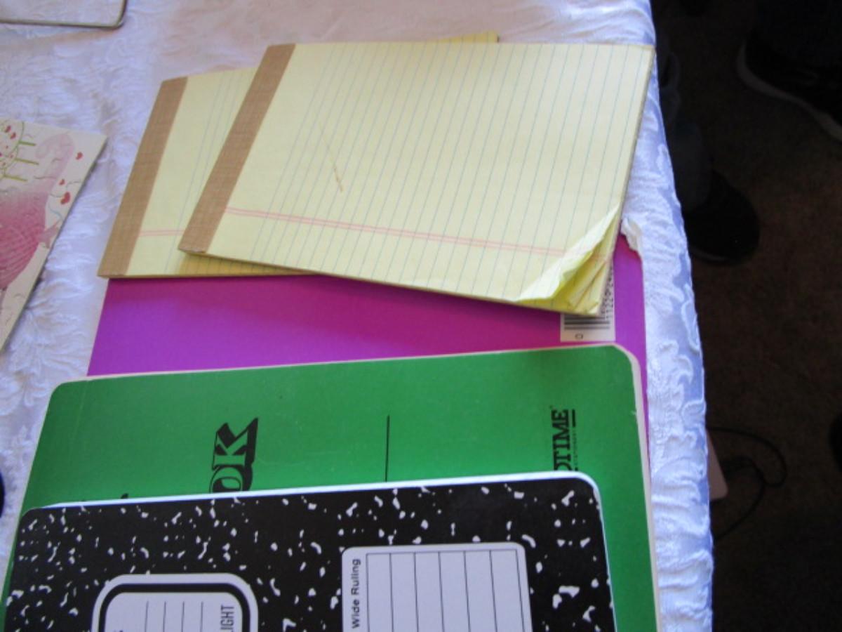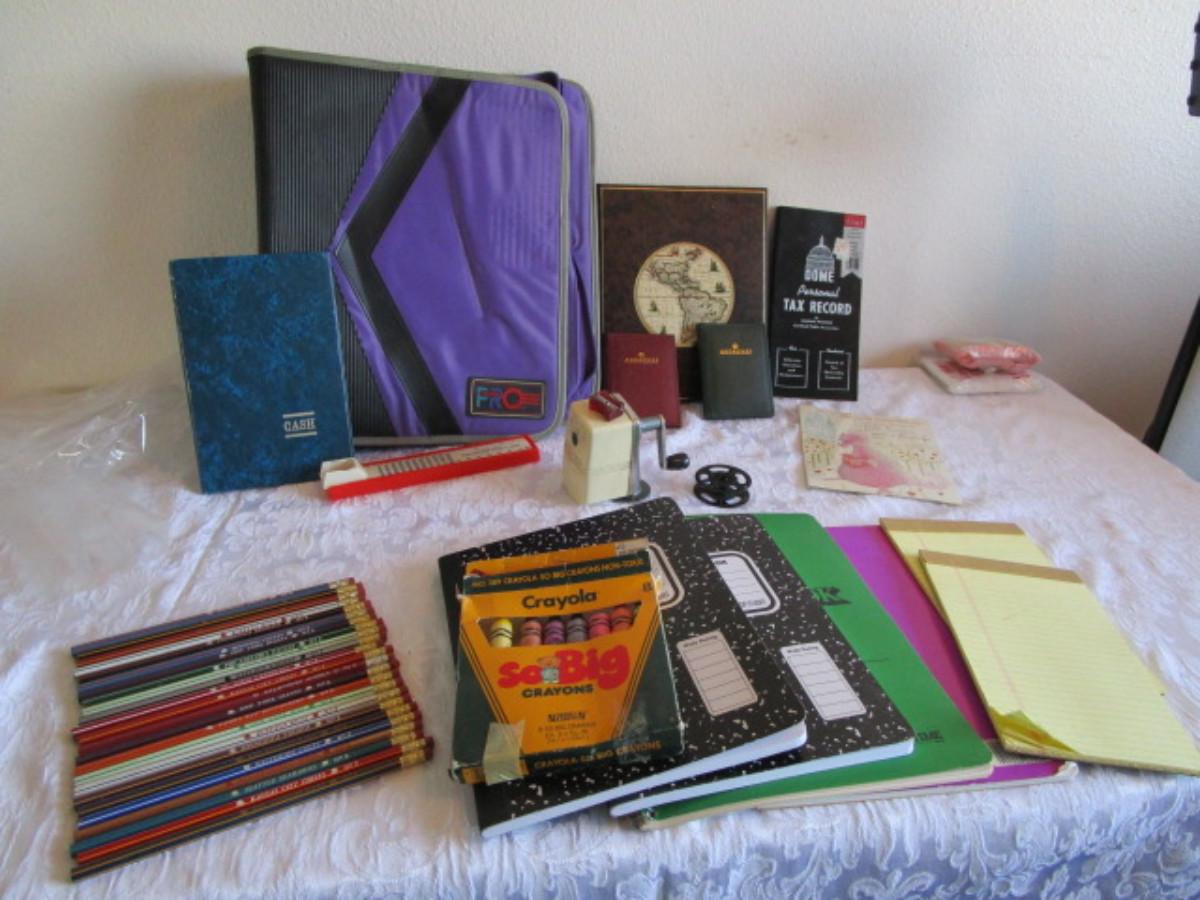 Vintage purple Pentab portfolio/binder, 24 Vintage sports team pencils, pencil sharpener, address book, 2 small address books, Tax Record book, 2 composition books, spiral notebooks, 2 5" x 7" legal pads, 7 large Crayolas, cash book, etc. - G