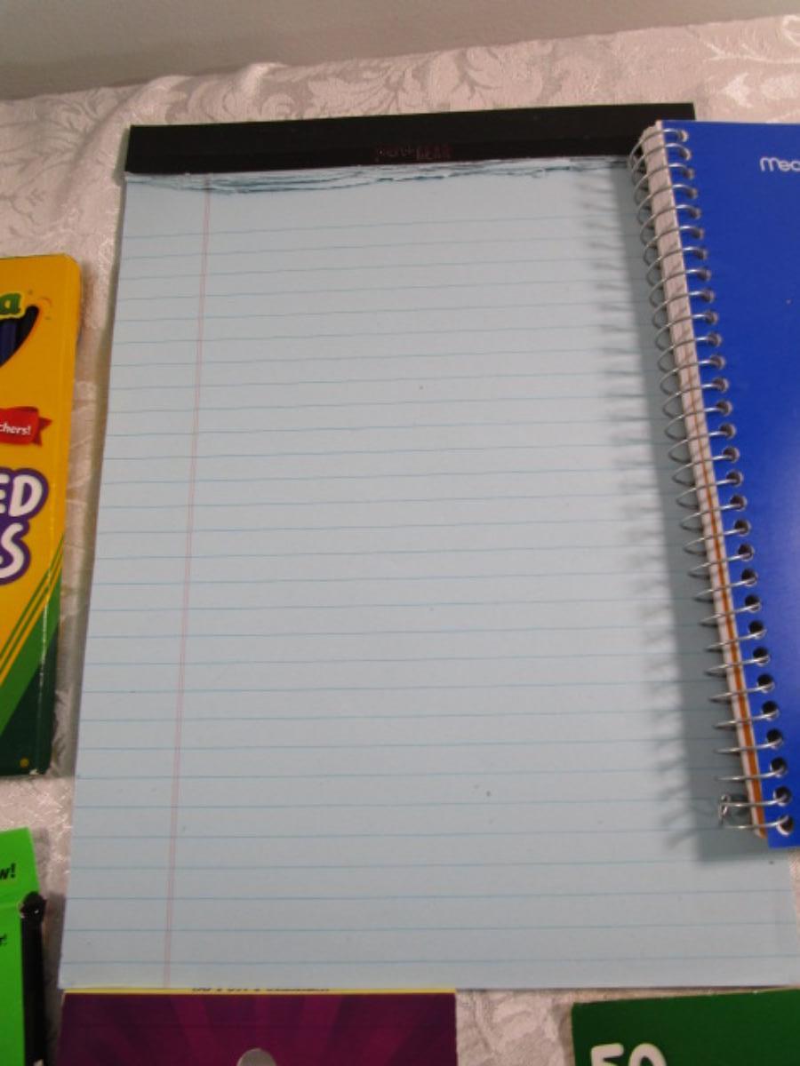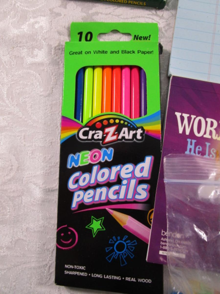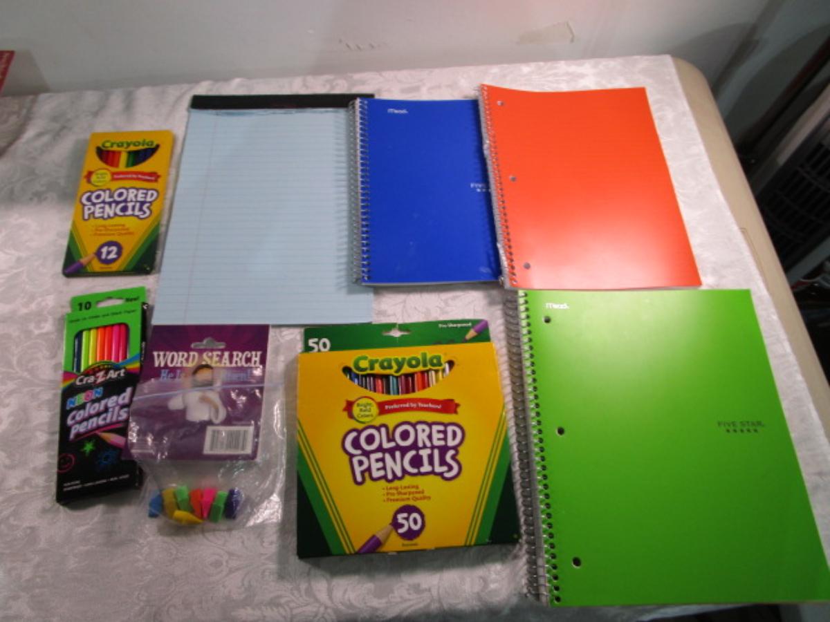 Legal pad, wire-bound notebooks1 new package of 50 colored pencils, 1 new package 10 neon colored pencils, 1 new package colored pencils, pencil-end erasers, word search book