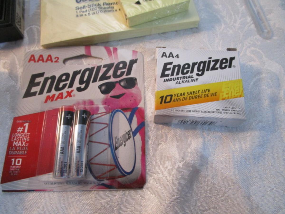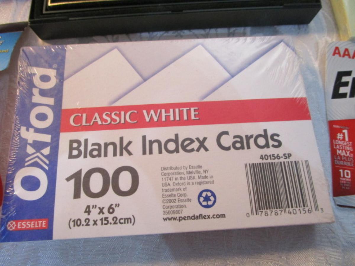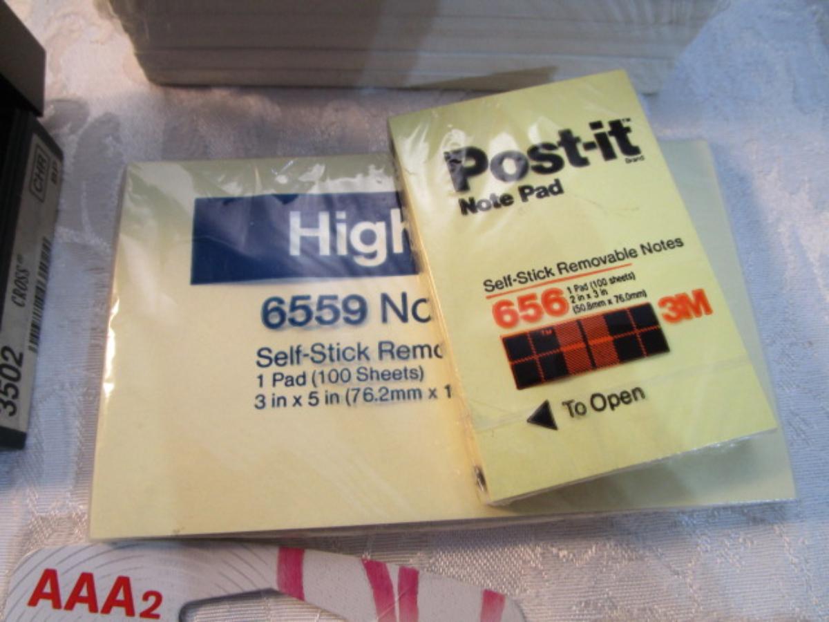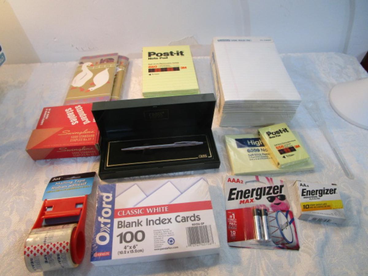 12 white 5" x 7" legal pads, 4 Post-it 4" x 6" lined pads, 4 AA batteries good to 2034, 2 AAA batteries good to 2030, index cards 4 x 6, 1 post-it 3" x 5" pad, 1 Post-it 2" x 3" pads, Cross pen in case, 2 boxes of staples, 1 roll shipping tape, 1 letter opener, coupon holder/notepad with pen