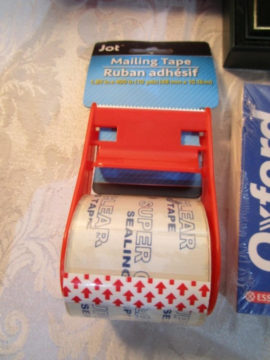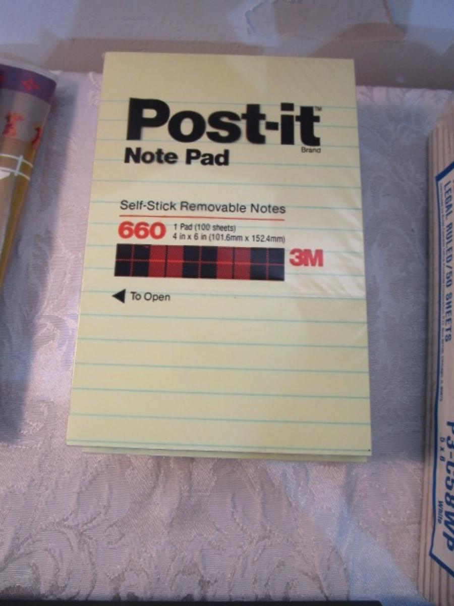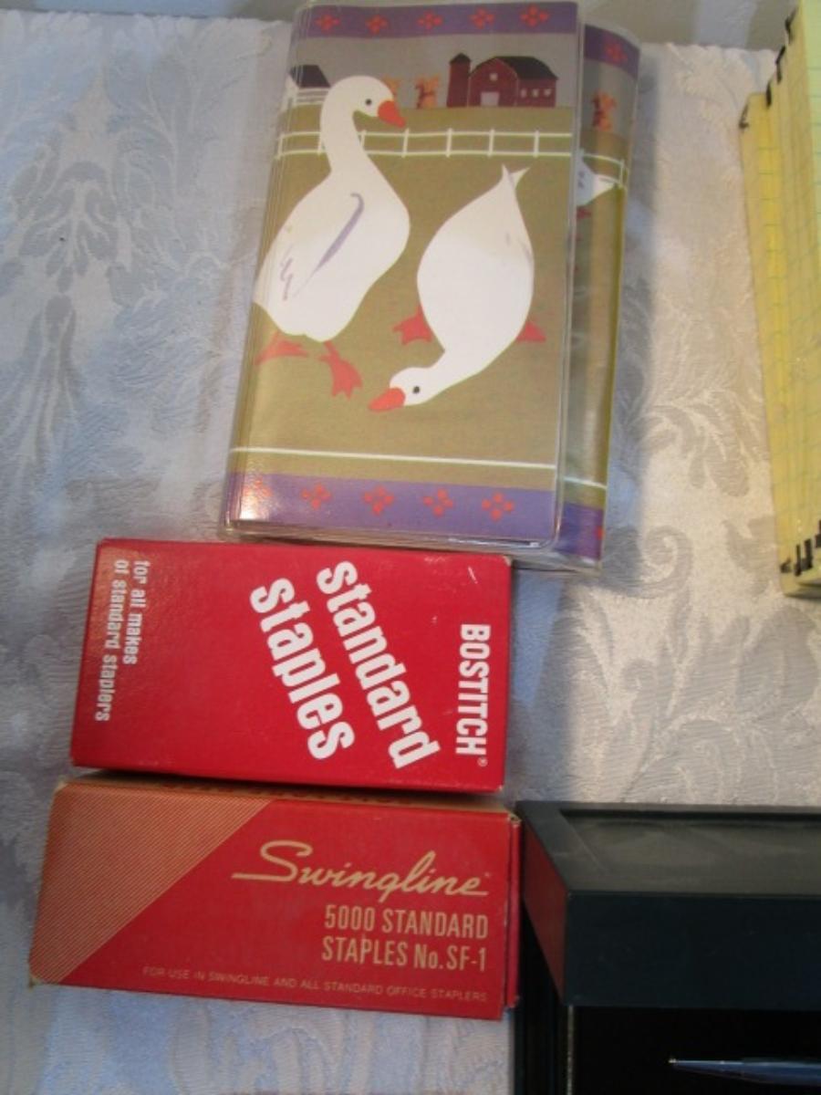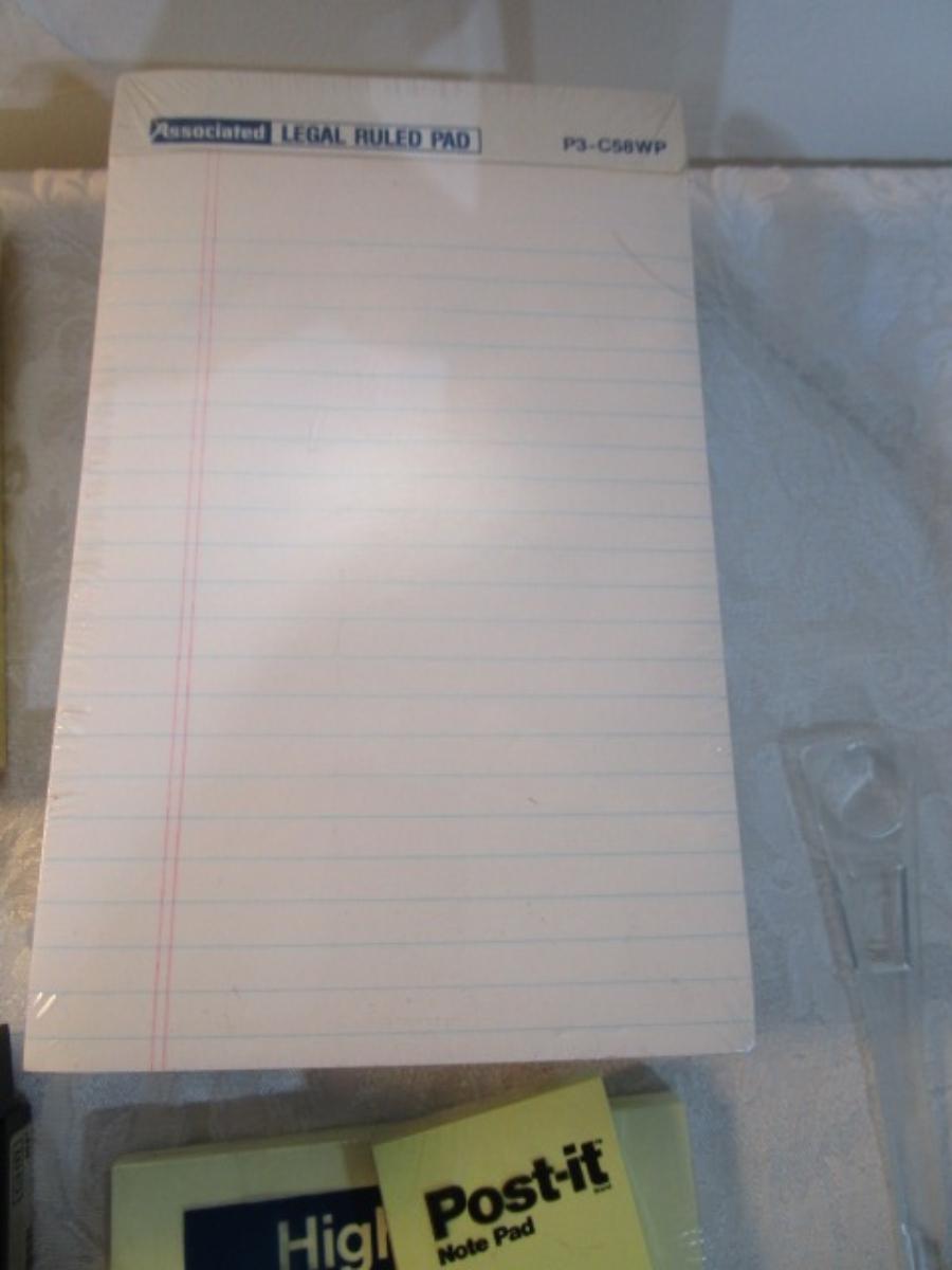 12 white 5" x 7" legal pads, 4 Post-it 4" x 6" lined pads, 4 AA batteries good to 2034, 2 AAA batteries good to 2030, index cards 4 x 6, 1 post-it 3" x 5" pad, 1 Post-it 2" x 3" pads, Cross pen in case, 2 boxes of staples, 1 roll shipping tape, 1 letter opener, coupon holder/notepad with pen