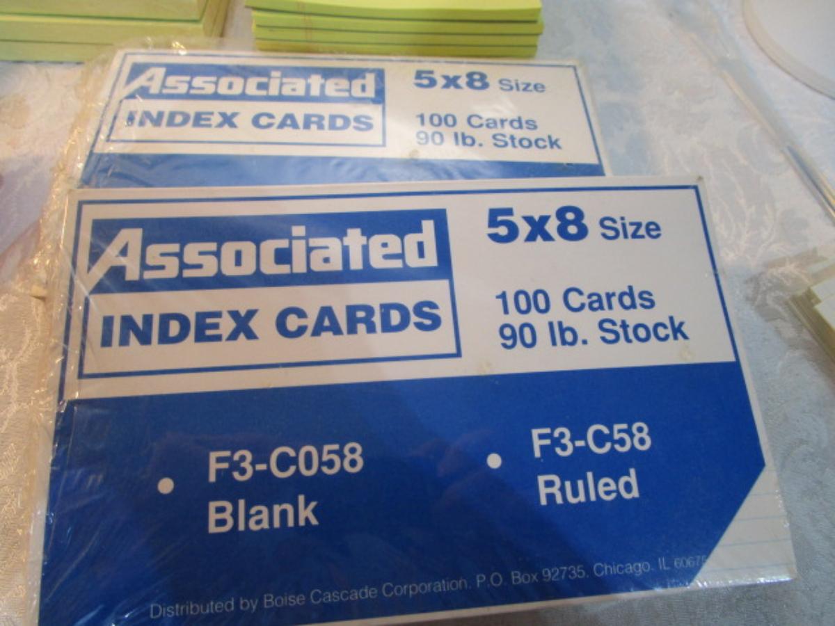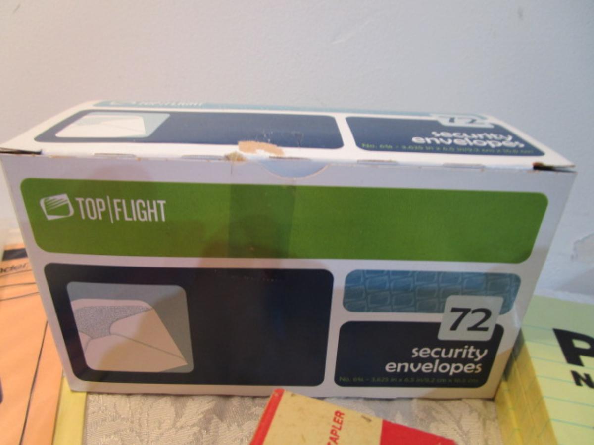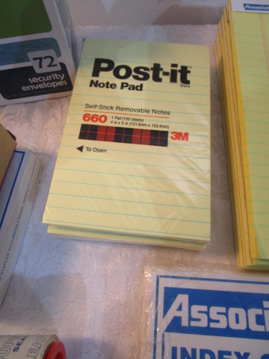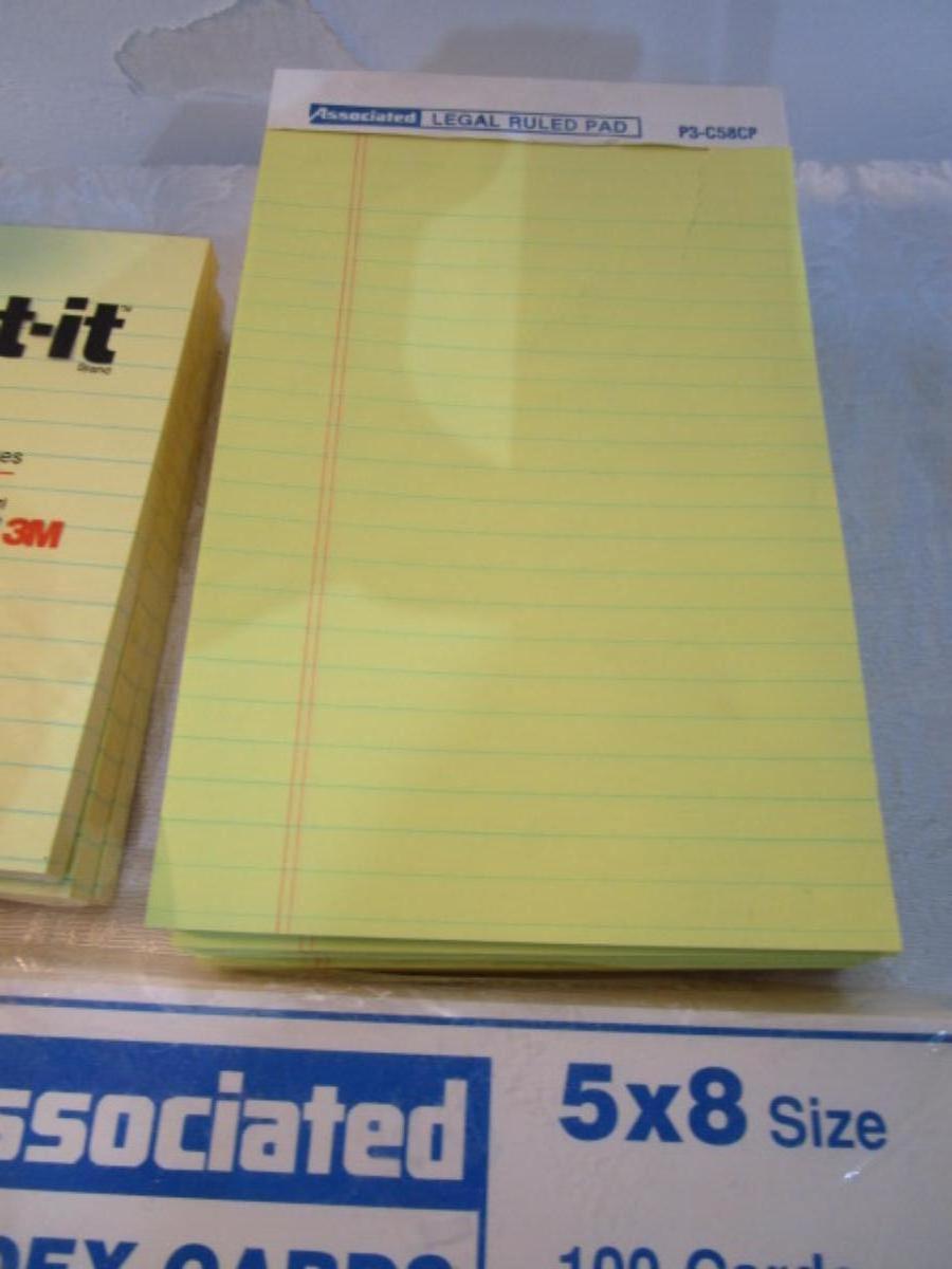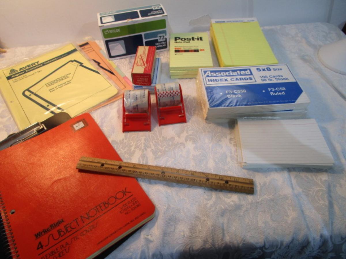7 yellow 5" x 7" legal pads 3 Post-it 4" x 6" lined pads, 2 boxes of staples, 1 box 3.62" x 6.5" security envelopes, 2 pkg (100 ea) plus 66 loose 4" x 6" index cards, 2 rolls shipping tape, 3 pkg index dividers, ruler, clipboard, wirebound notebook