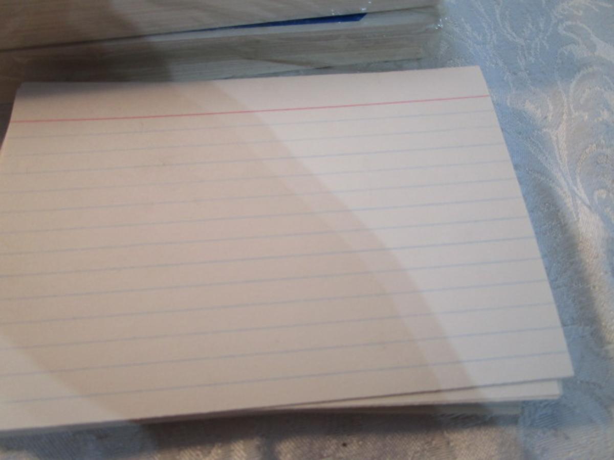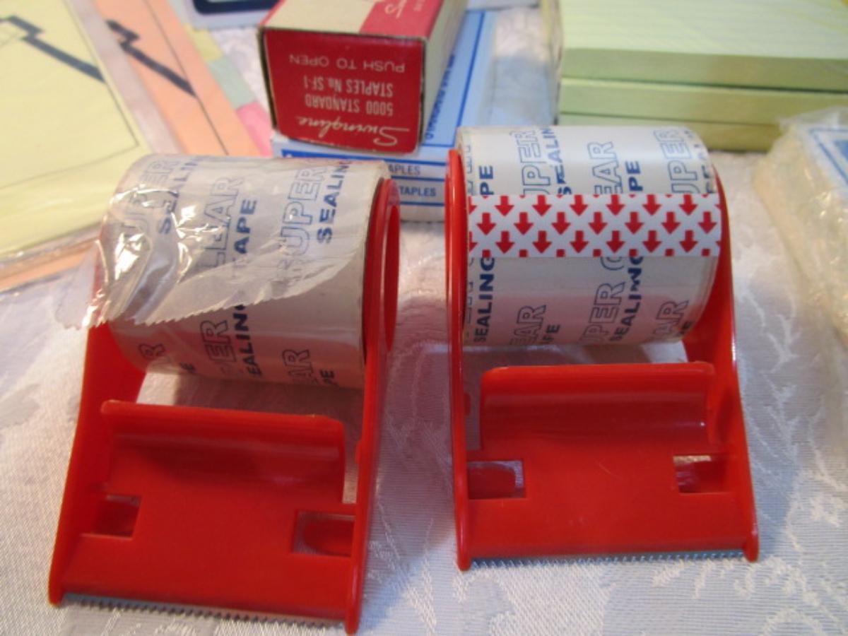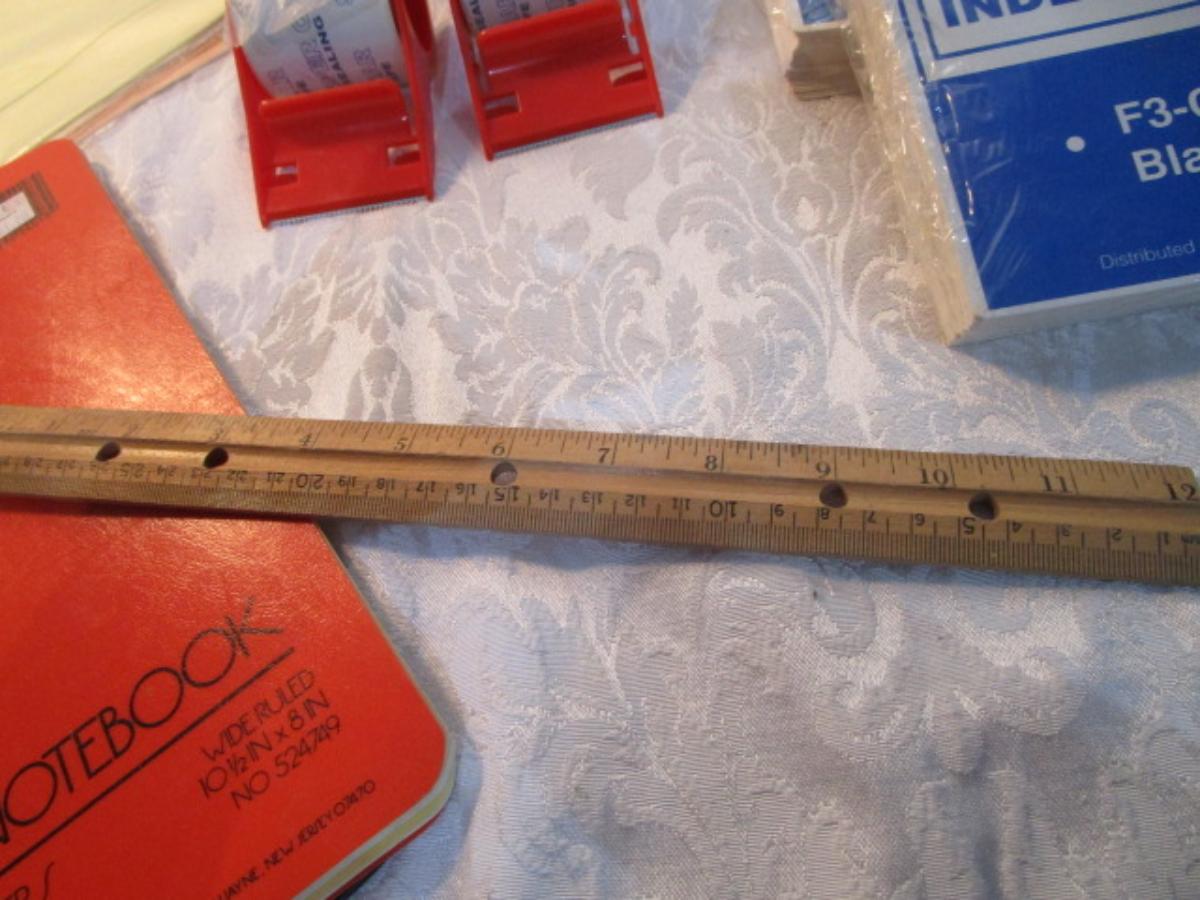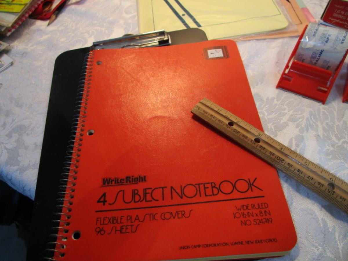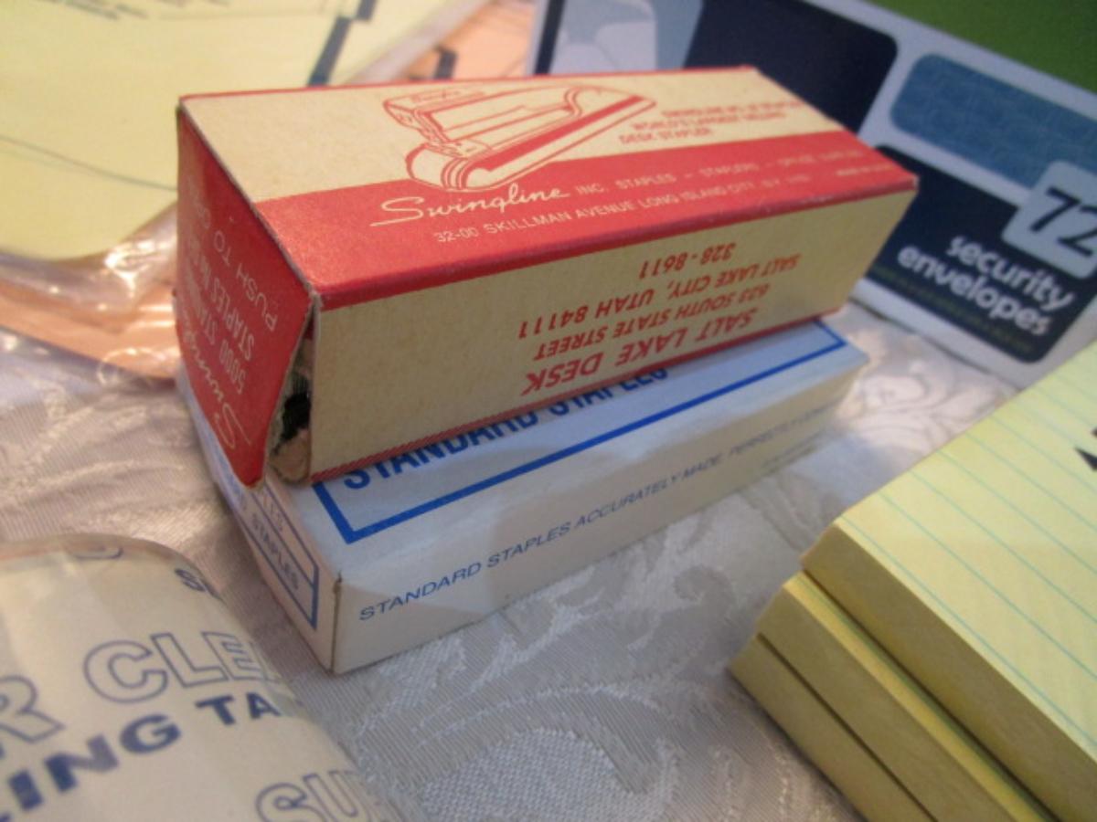 7 yellow 5" x 7" legal pads 3 Post-it 4" x 6" lined pads, 2 boxes of staples, 1 box 3.62" x 6.5" security envelopes, 2 pkg (100 ea) plus 66 loose 4" x 6" index cards, 2 rolls shipping tape, 3 pkg index dividers, ruler, clipboard, wirebound notebook
