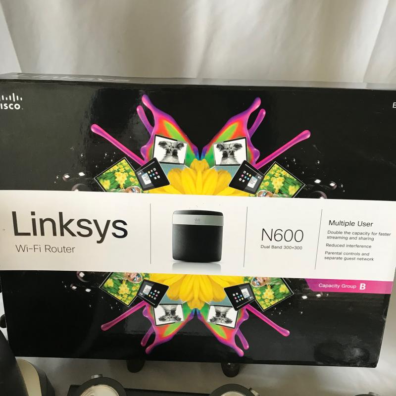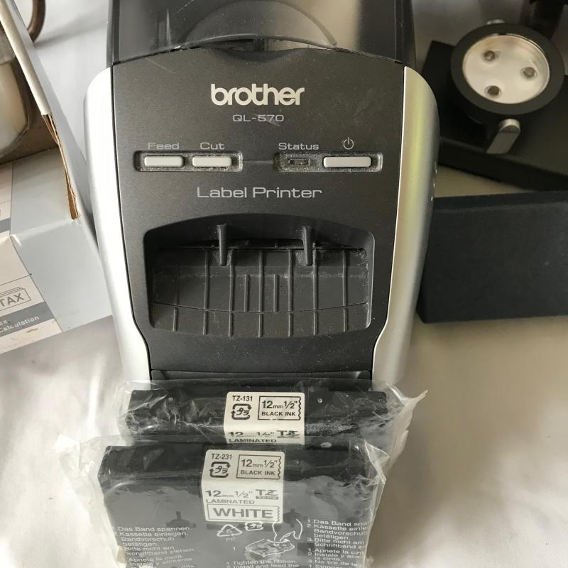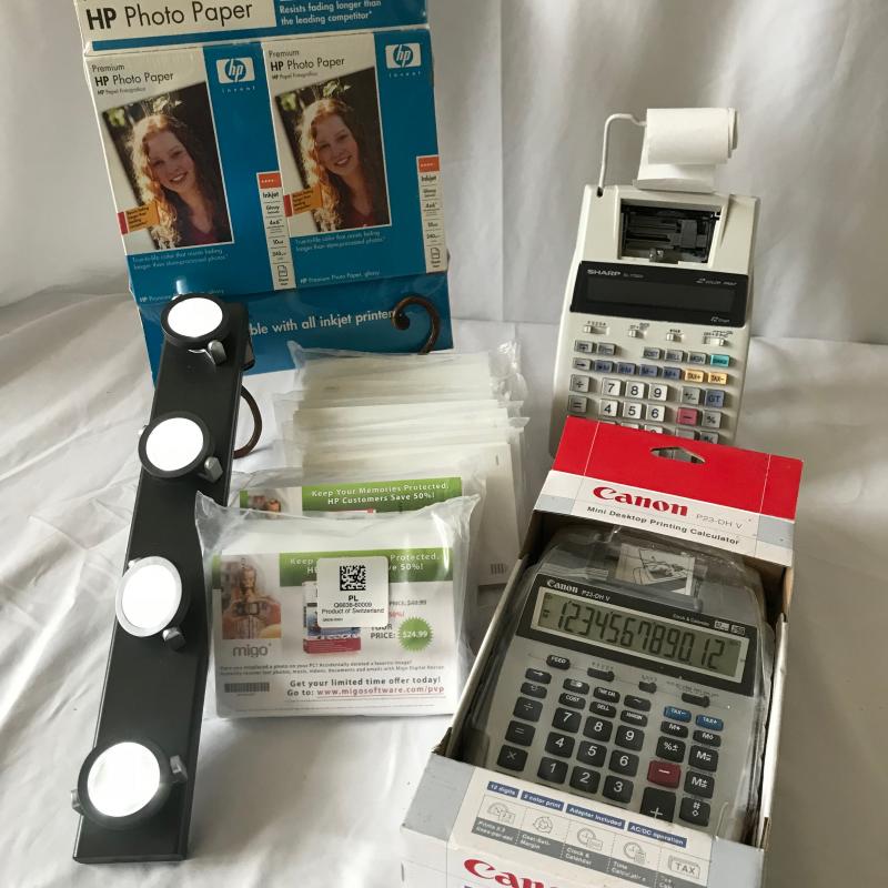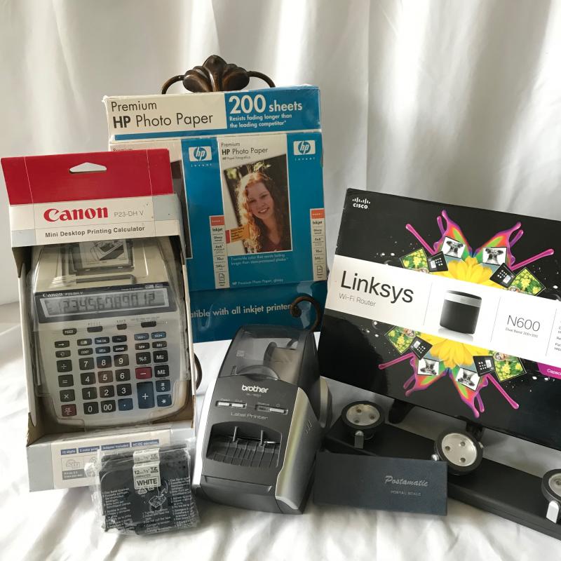 Lot includes office supplies of various kinds: Canon mini desktop printing calculator new in box, Sharp calculator, Postamatic pocket postal scale (some rusting, see photo), photo paper, Brother label printer with labels, Linksys Wi-Fi router, and battery operated desk track light. No shipping available. Local pickup only in Hendersonville, NC.