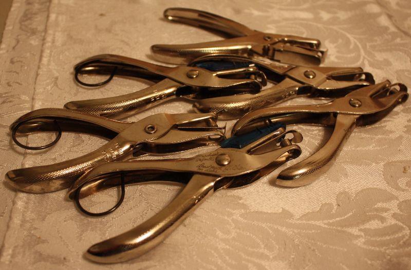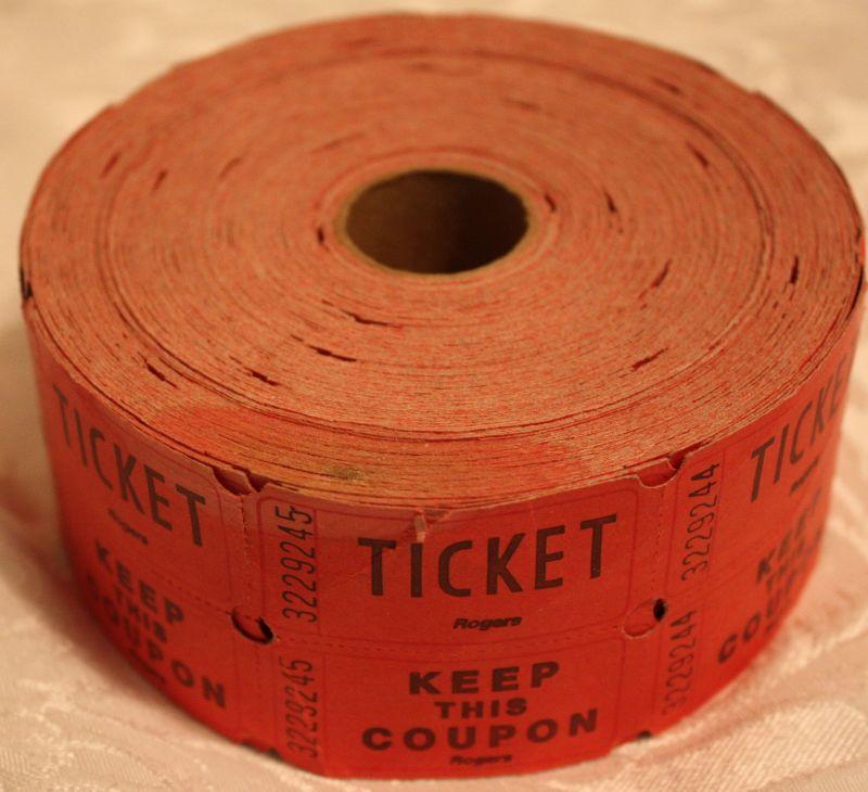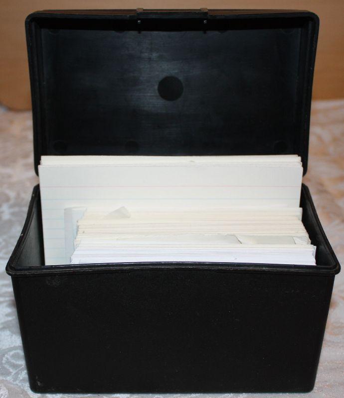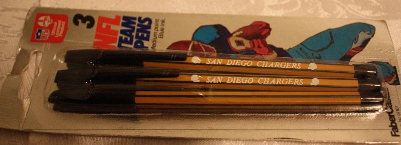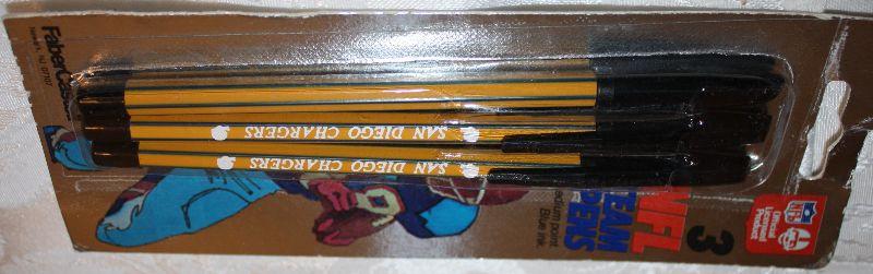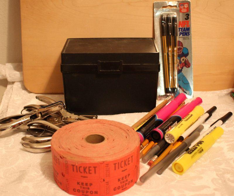 Index file box with cards, hole punchers, highlighters, pens and pencils, package of three San Diego Charger pens, Roll of Raffle tickets
