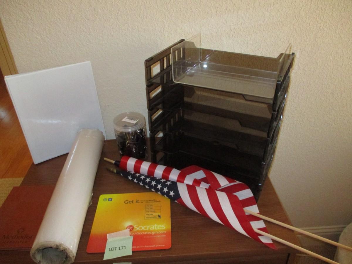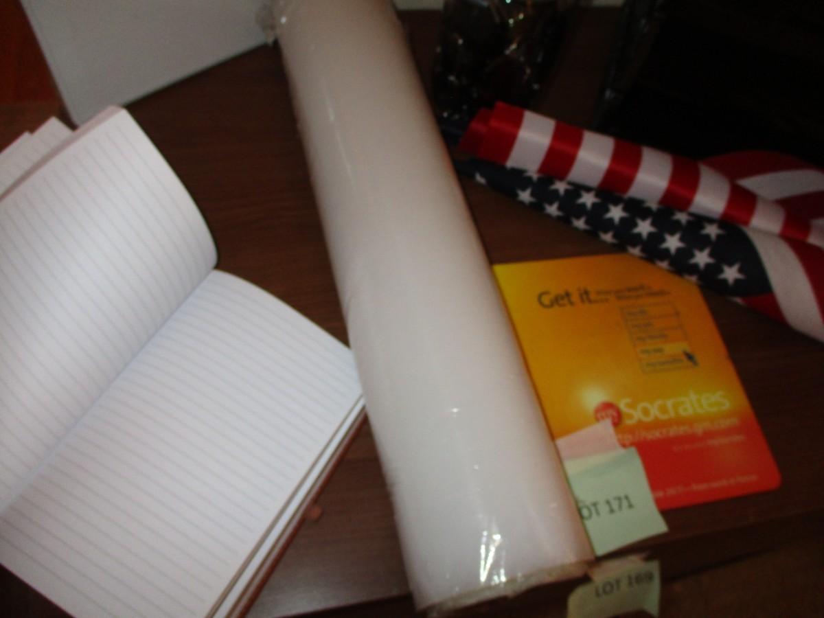 Plastic stackable trays, flags, mouse mat, packing wrapping, clips, journal