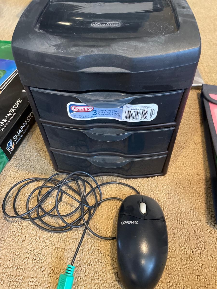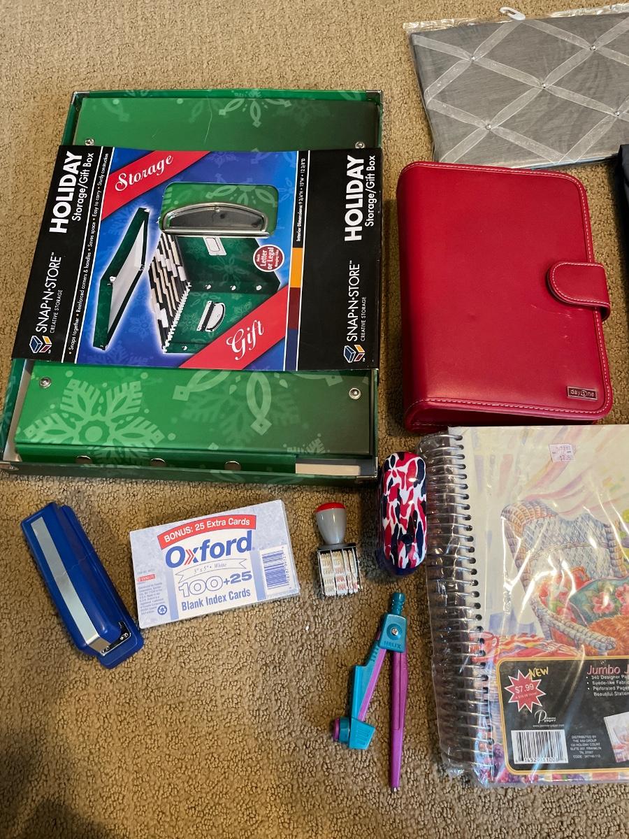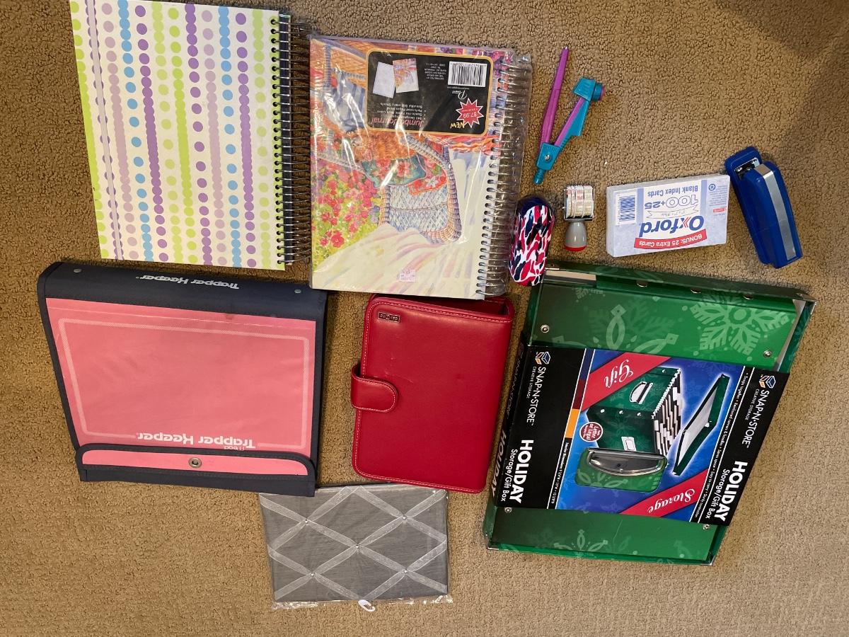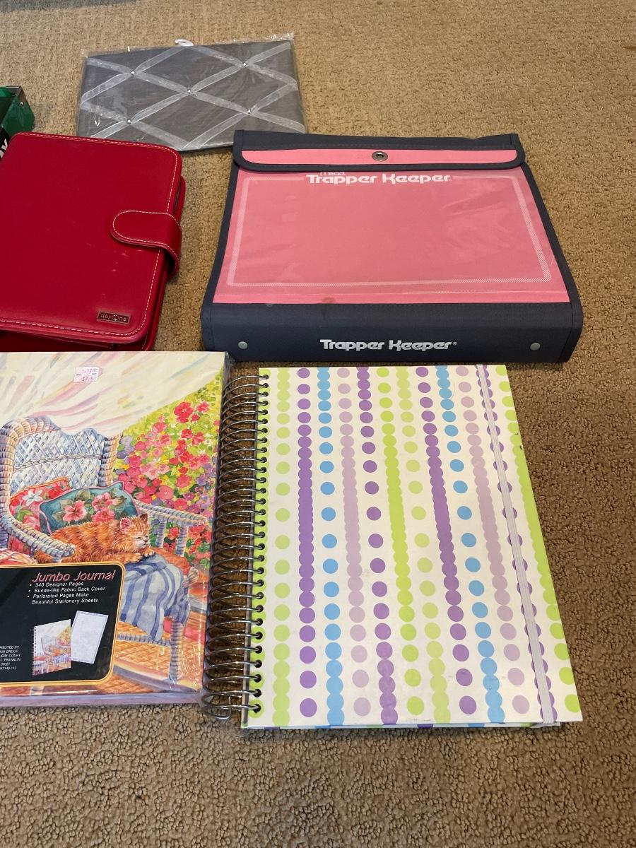 Includes 2 notebooks, vintage Trapper Keeper, organizer, protractor, stapler, storage box, push pin board & black storage bin with mouse
