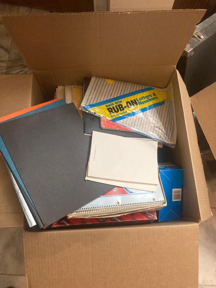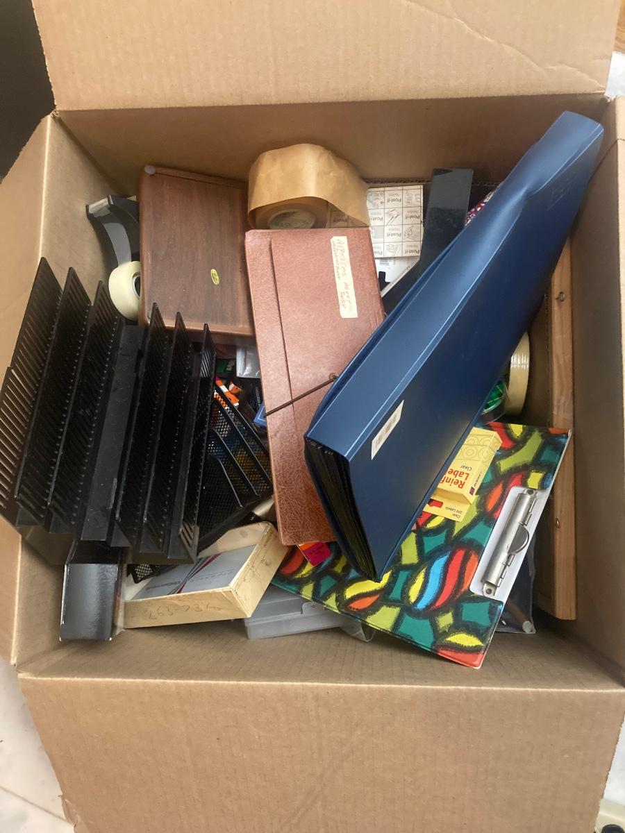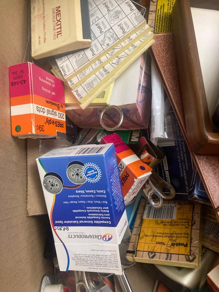 2 medium moving boxes full of miscellaneous office supplies including: but not limited to pens staplers staples tape paper clips rubber bands desk organizers notebooks printer paper envelopes and more.