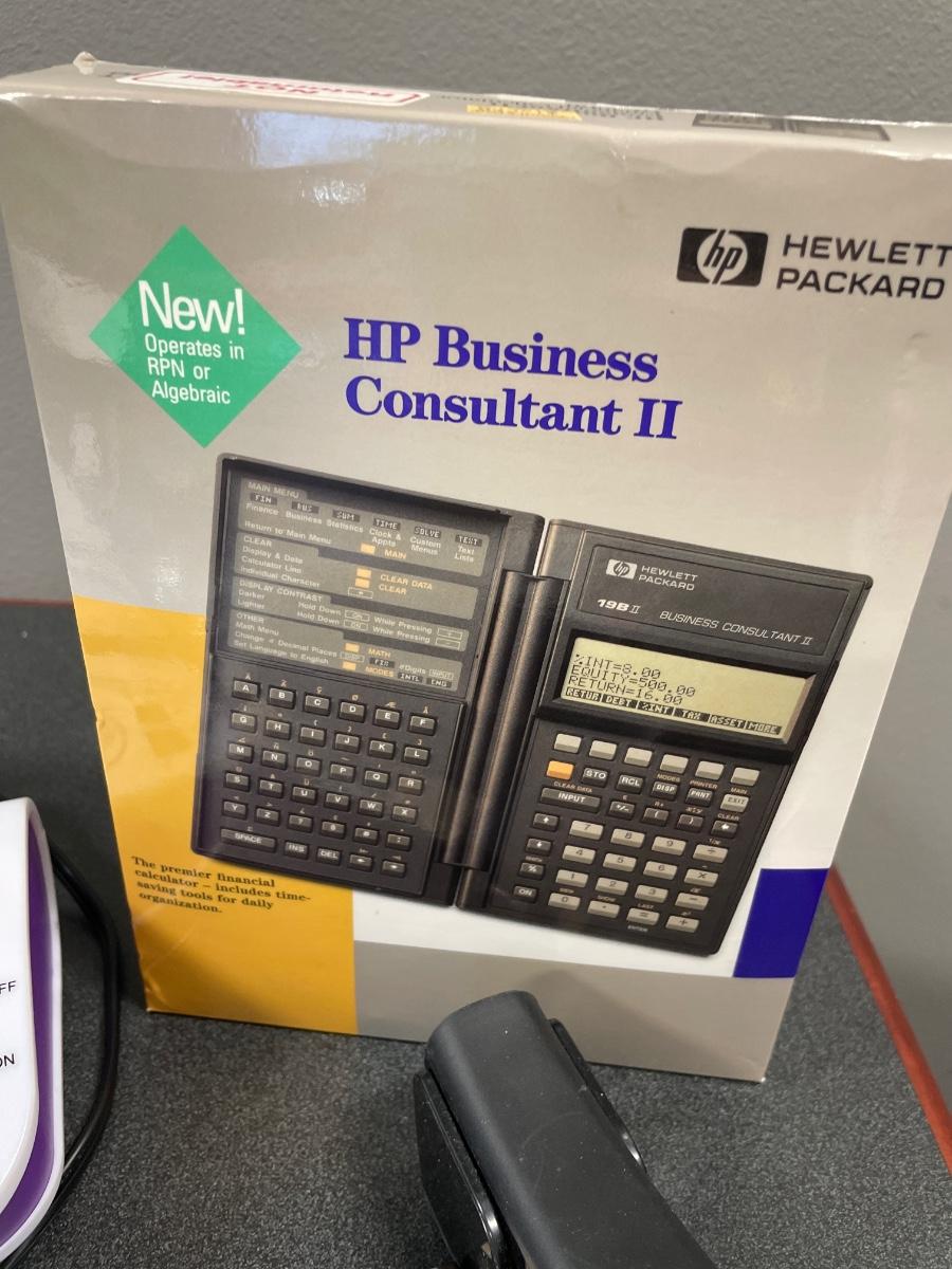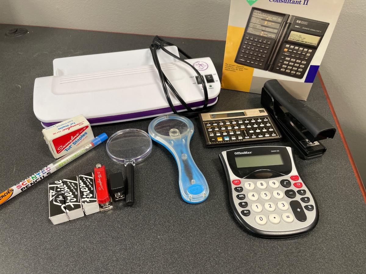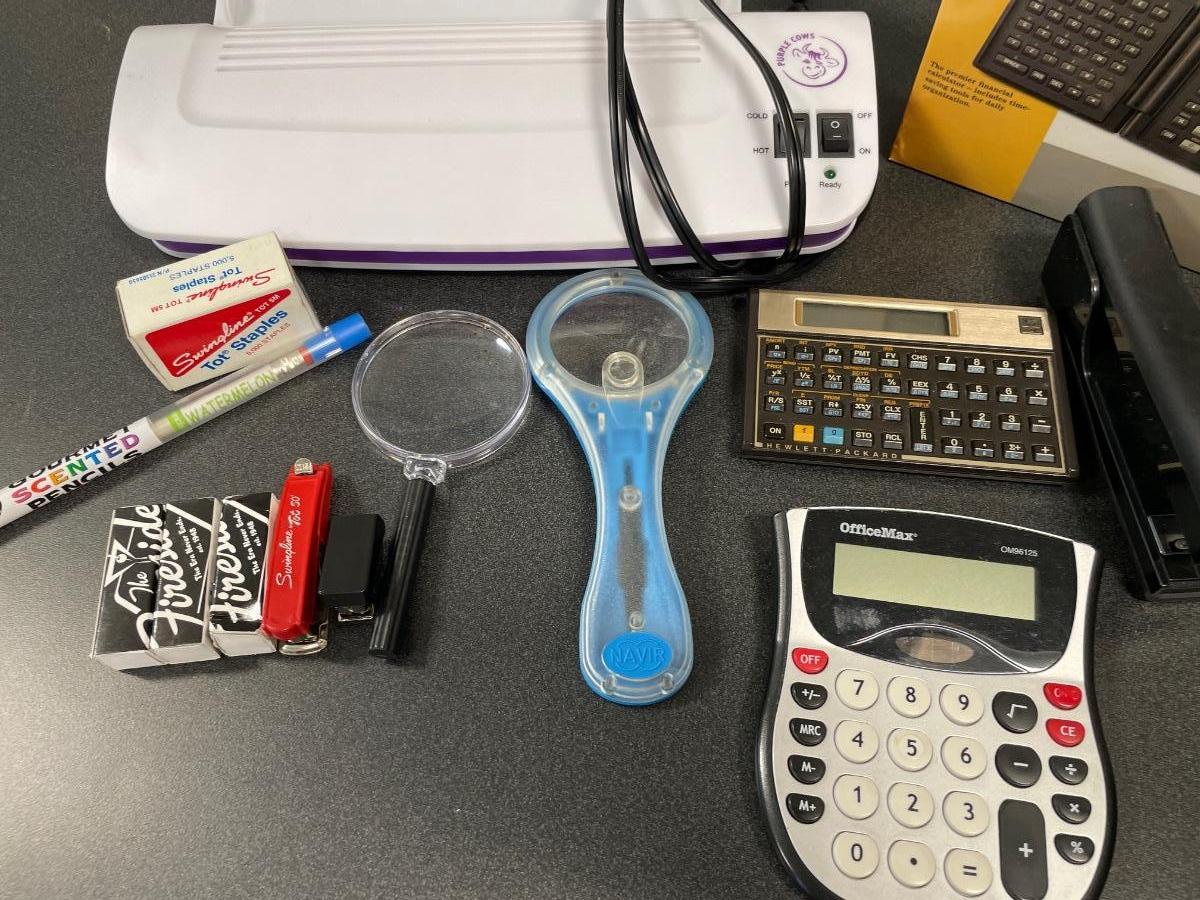 Calculators, staplers, smencil and magnifying glass