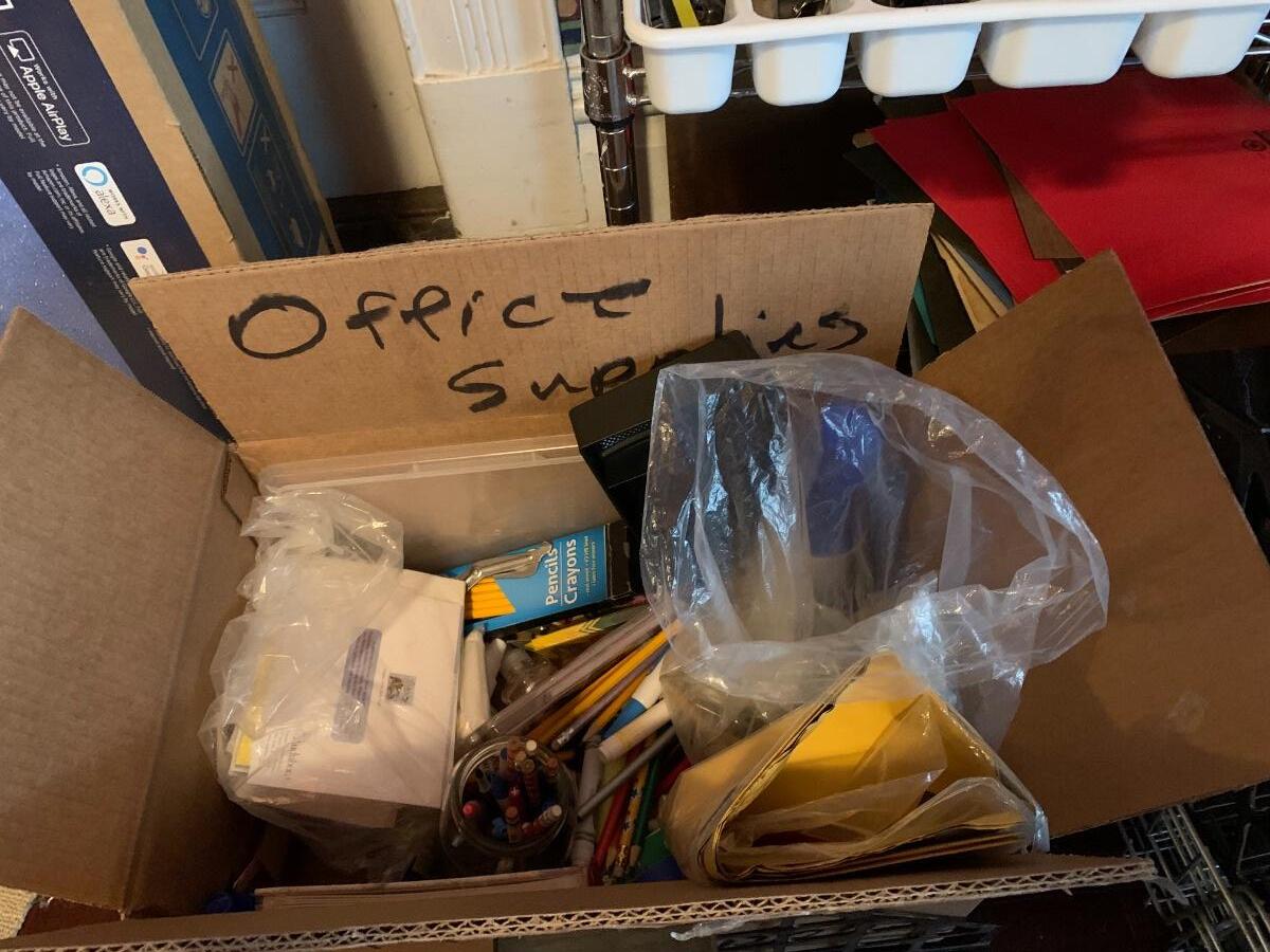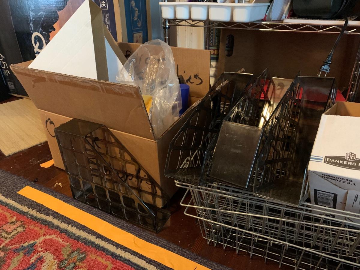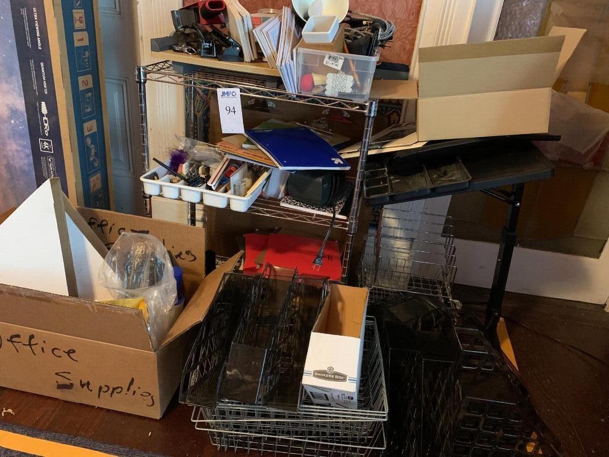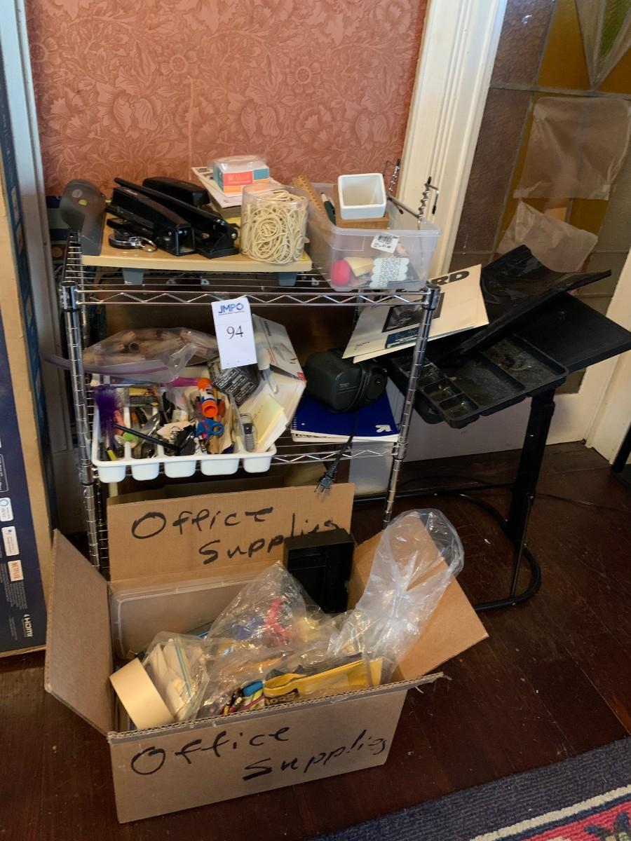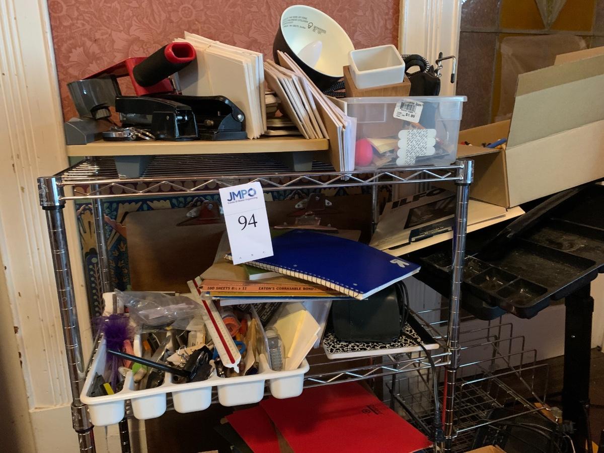 3 shelf chrome unit. Electric pencil sharpener, paper cutter, assorted school and office supplies. Includes coin wrappers, assorted stationery and adjustable laptop stand.