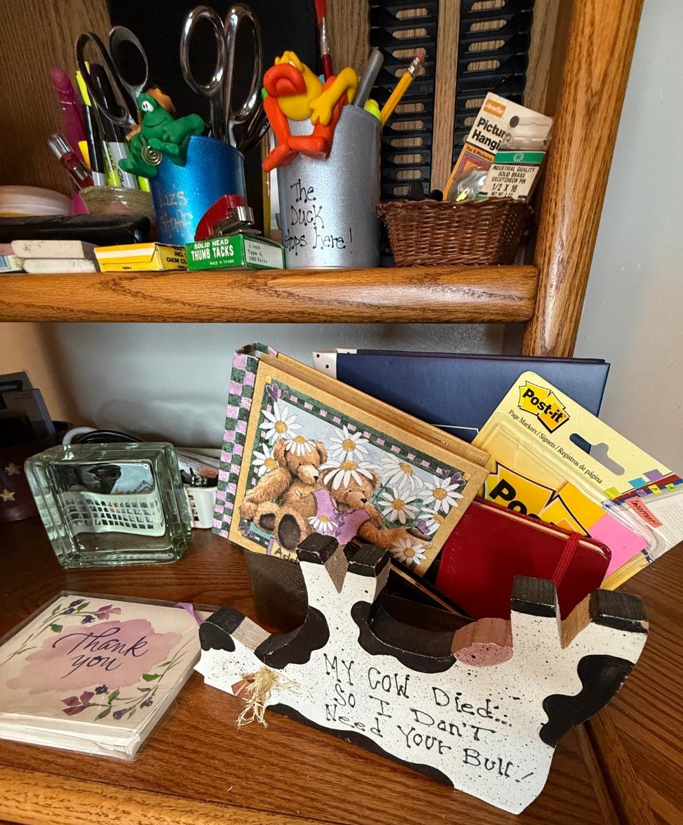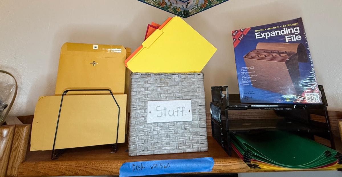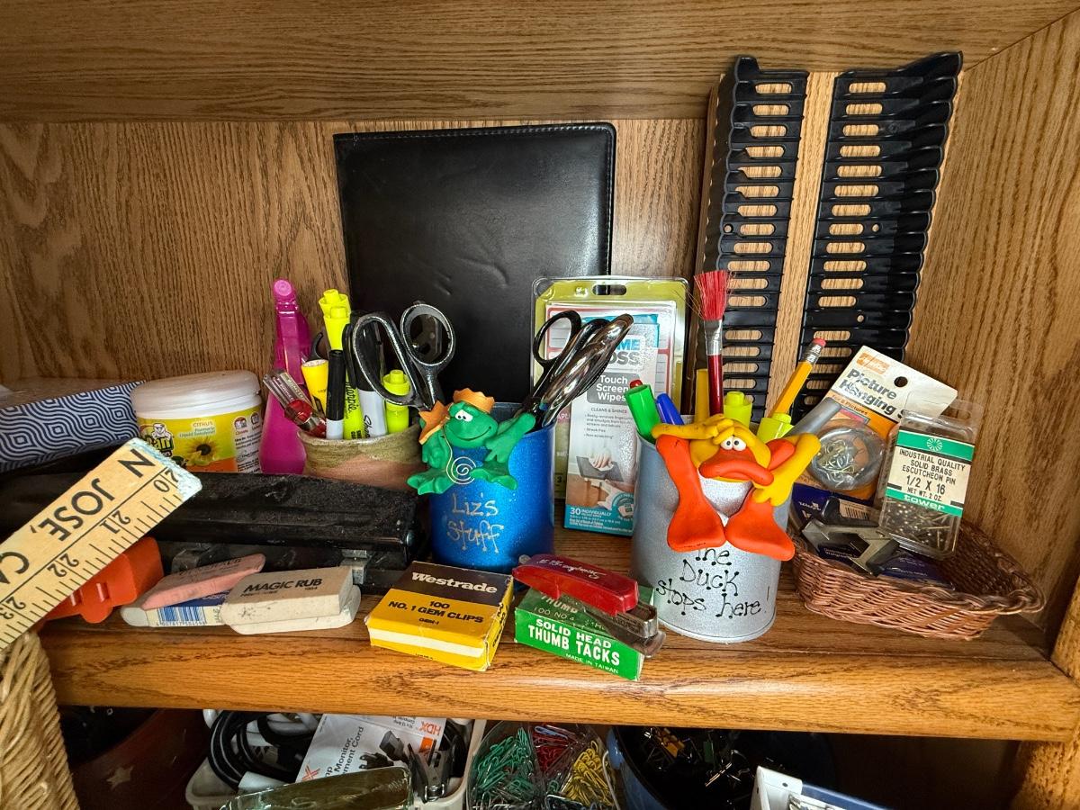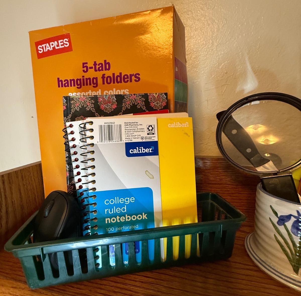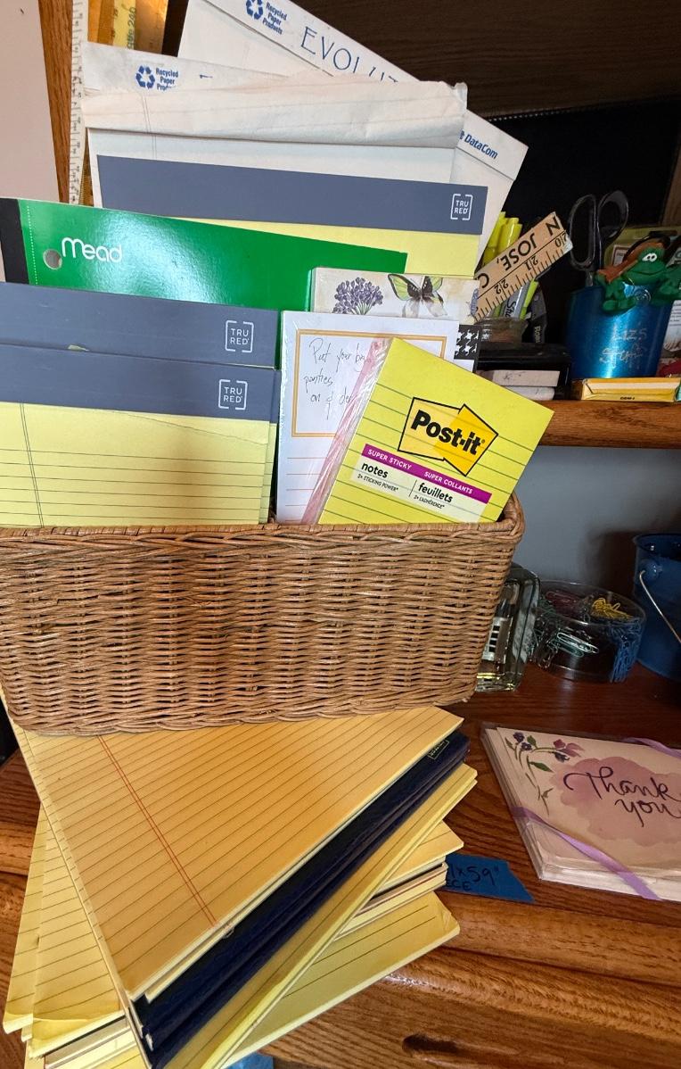 Note pads, expanding file, envelopes, post-its, address books and thermal calculator rolls.