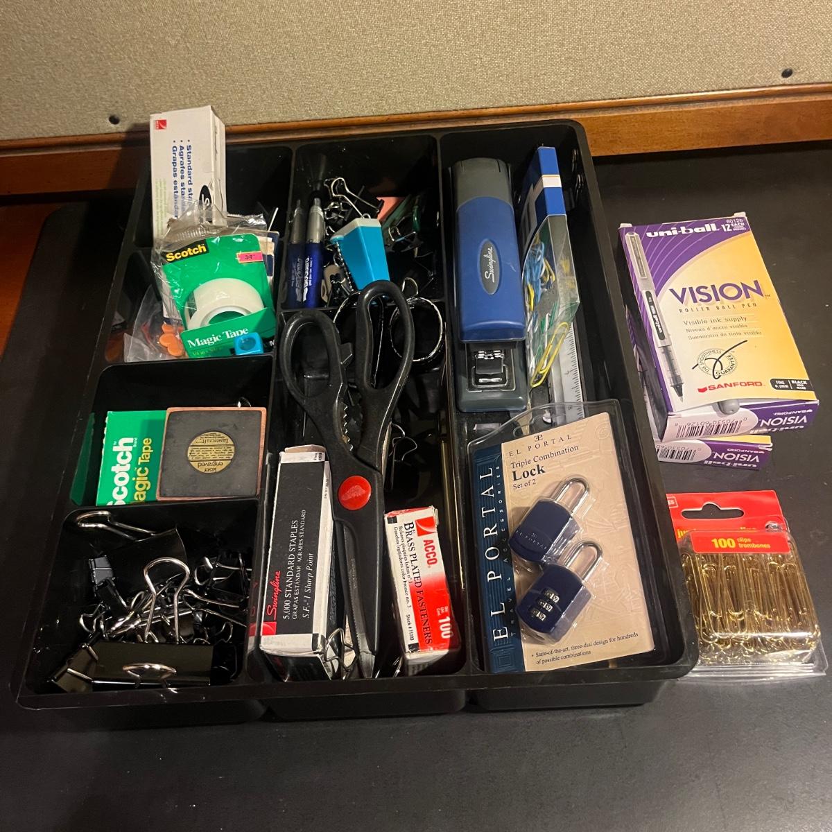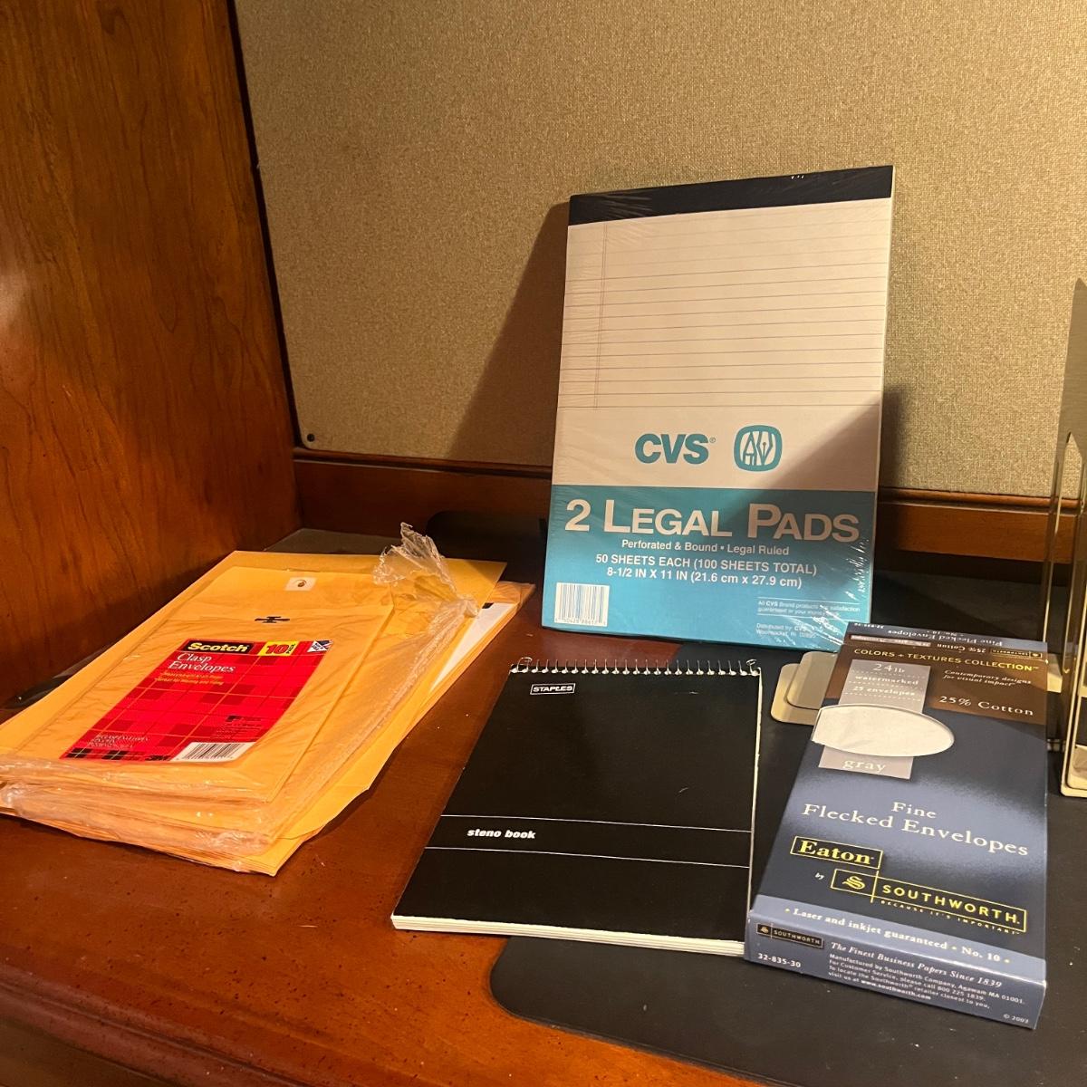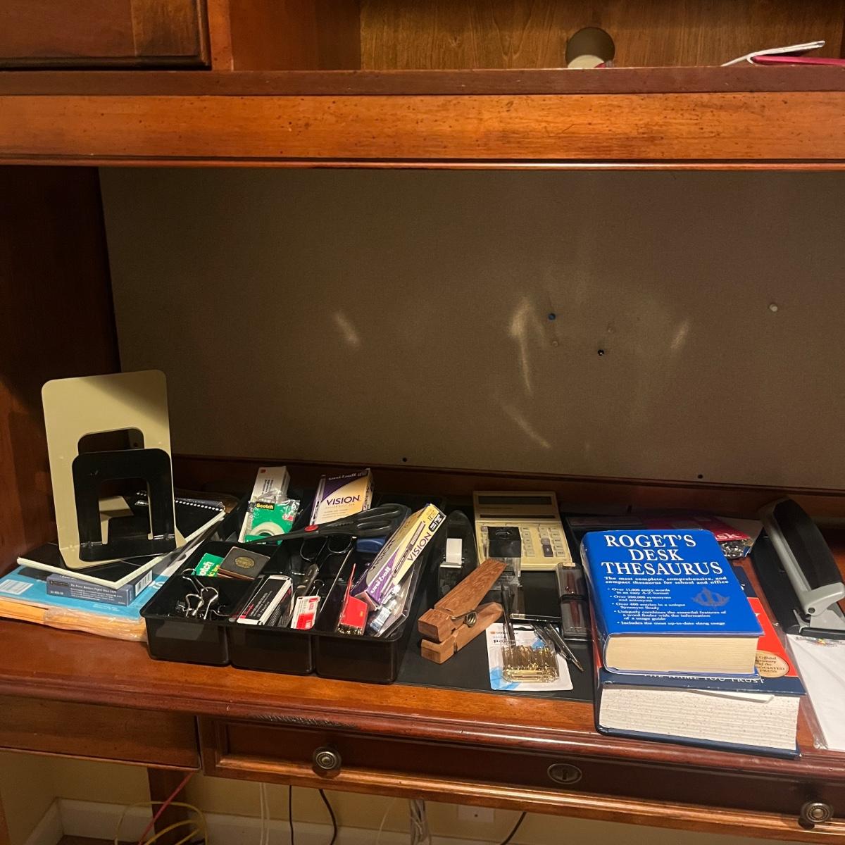 Lot includes Paradise pen, Reflections pen, Websters dictionary, Rogers Thesaurus, scissors, calculator, stapler, envelopes, paper clips, tape dispenser, ruler, letter opener and more.