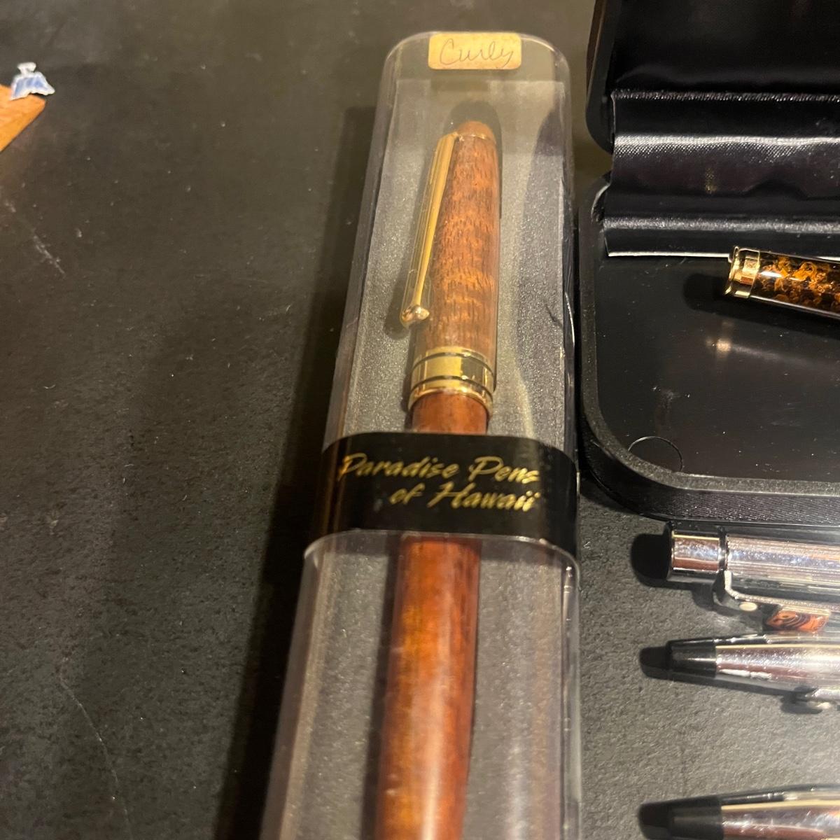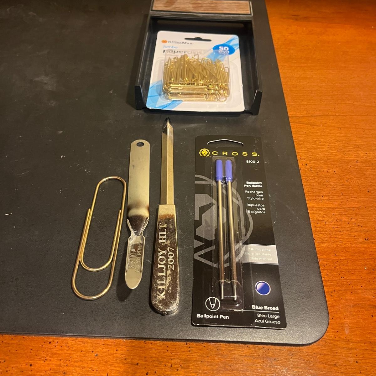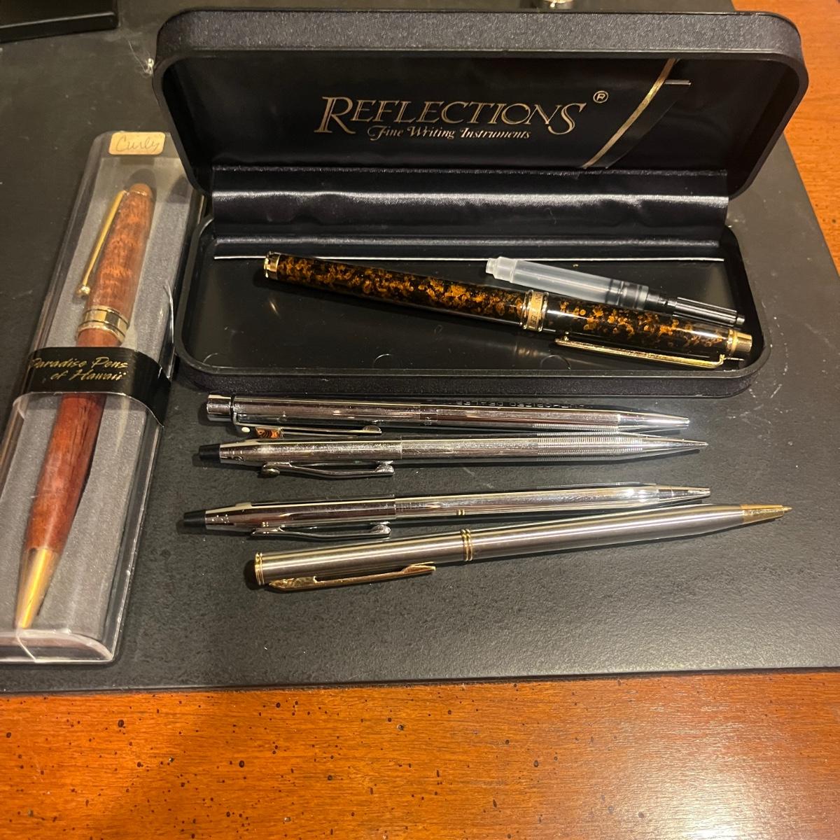 Lot includes Paradise pen, Reflections pen, Websters dictionary, Rogers Thesaurus, scissors, calculator, stapler, envelopes, paper clips, tape dispenser, ruler, letter opener and more.