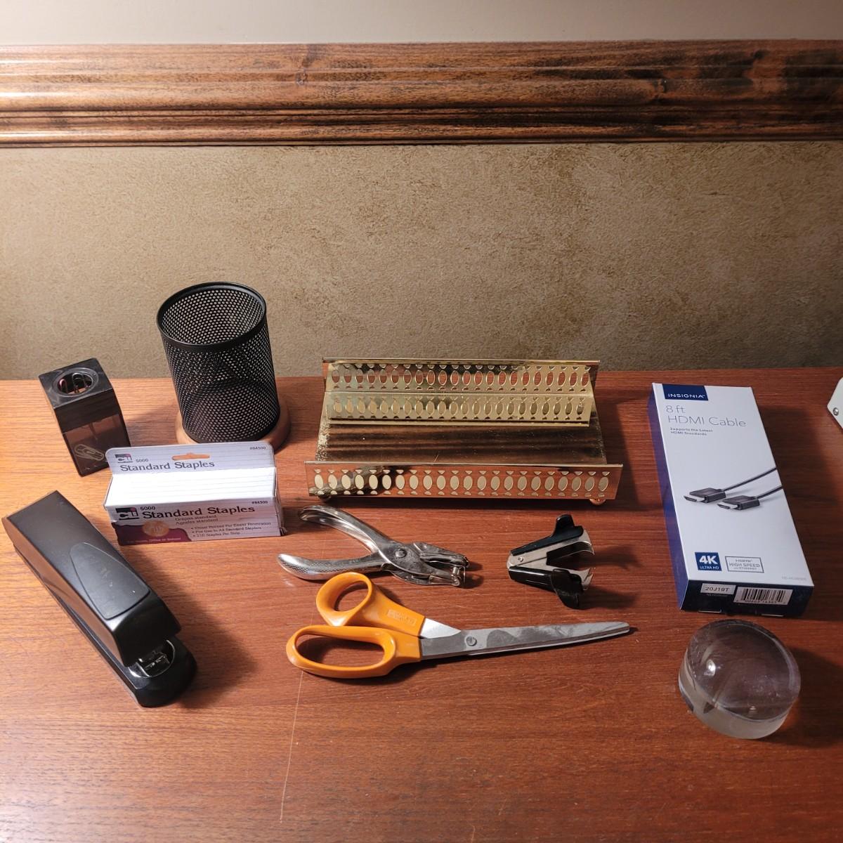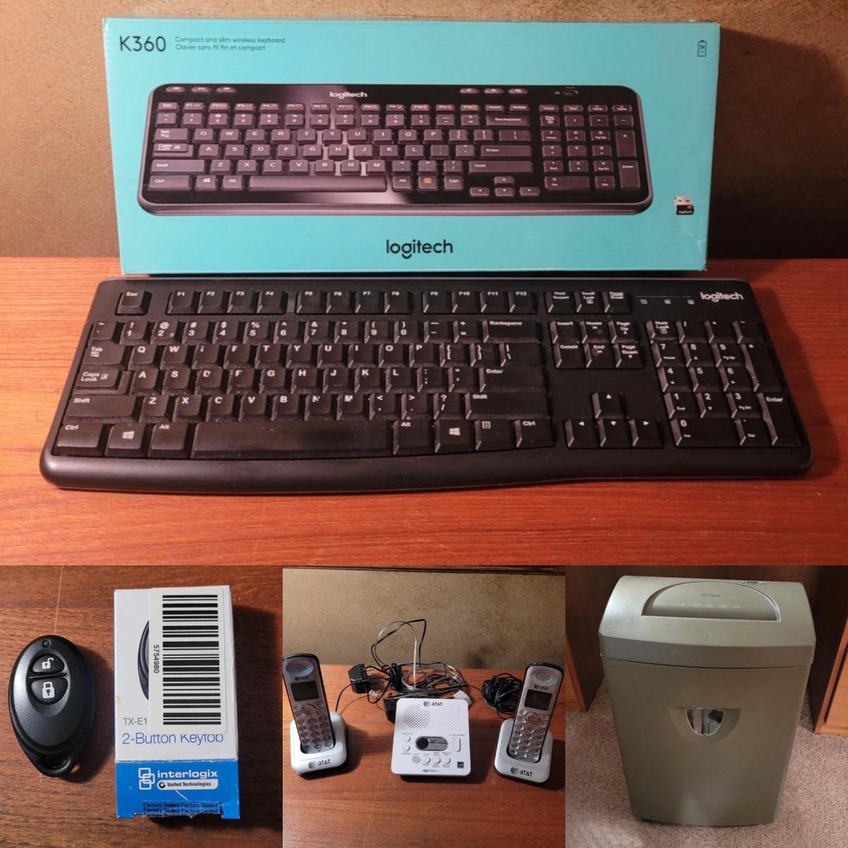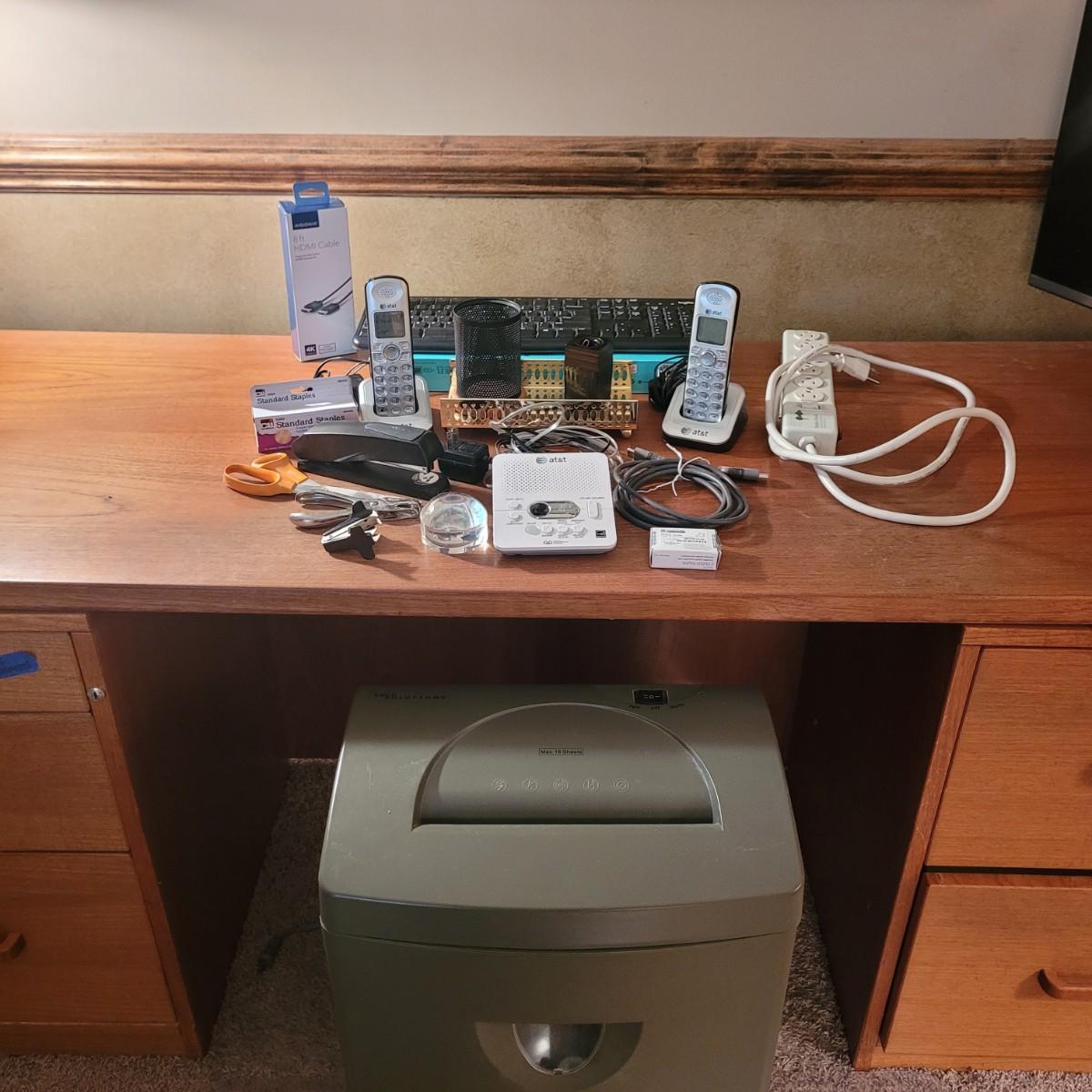 An assortment of office supplies, including a 16 sheet paper shredder by Tech Solutions, AT&T cordless phones and digital answering machine, keyboards, power cords and a variety of desk accessories. Items powered on when plugged in. Shredder measures approximately 15” x 10” x 23”H. Local pick up only.